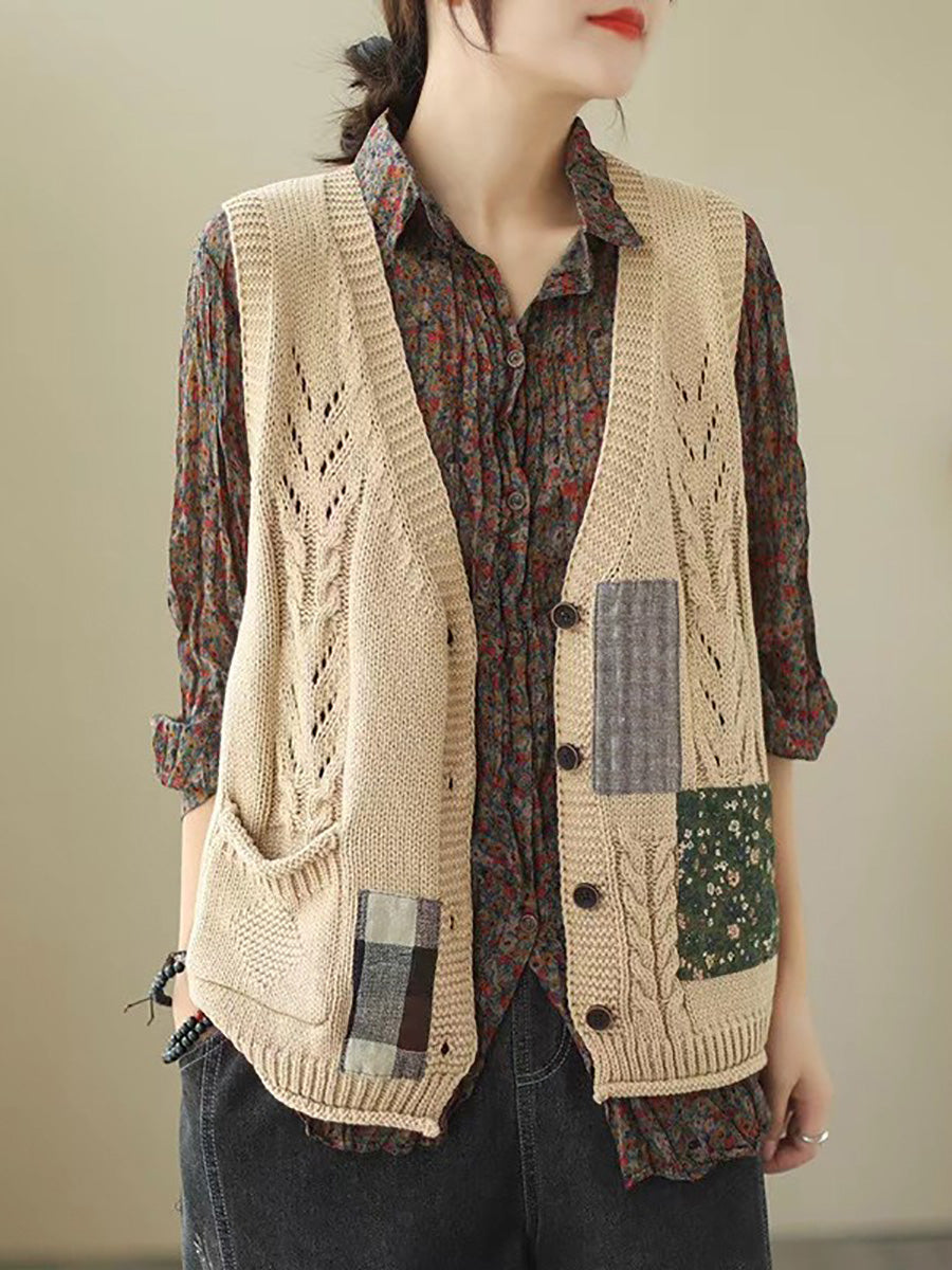This knitted vest features a patchwork design and a classic V-neck collar, giving it a retro feel. Perfect for the autumn and winter seasons.
