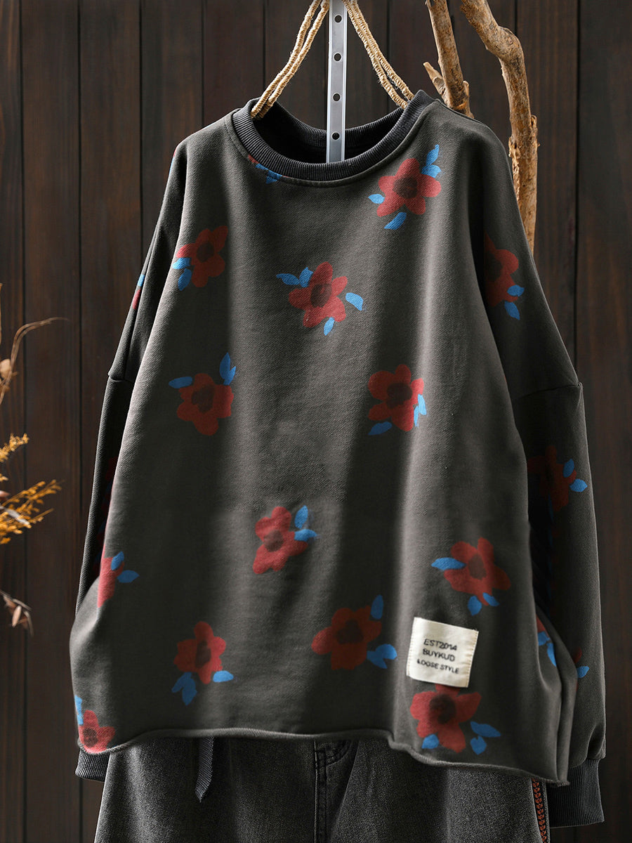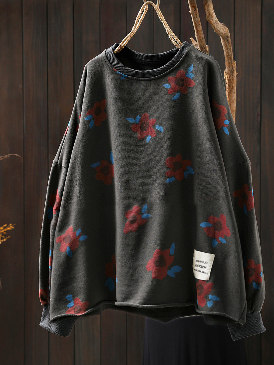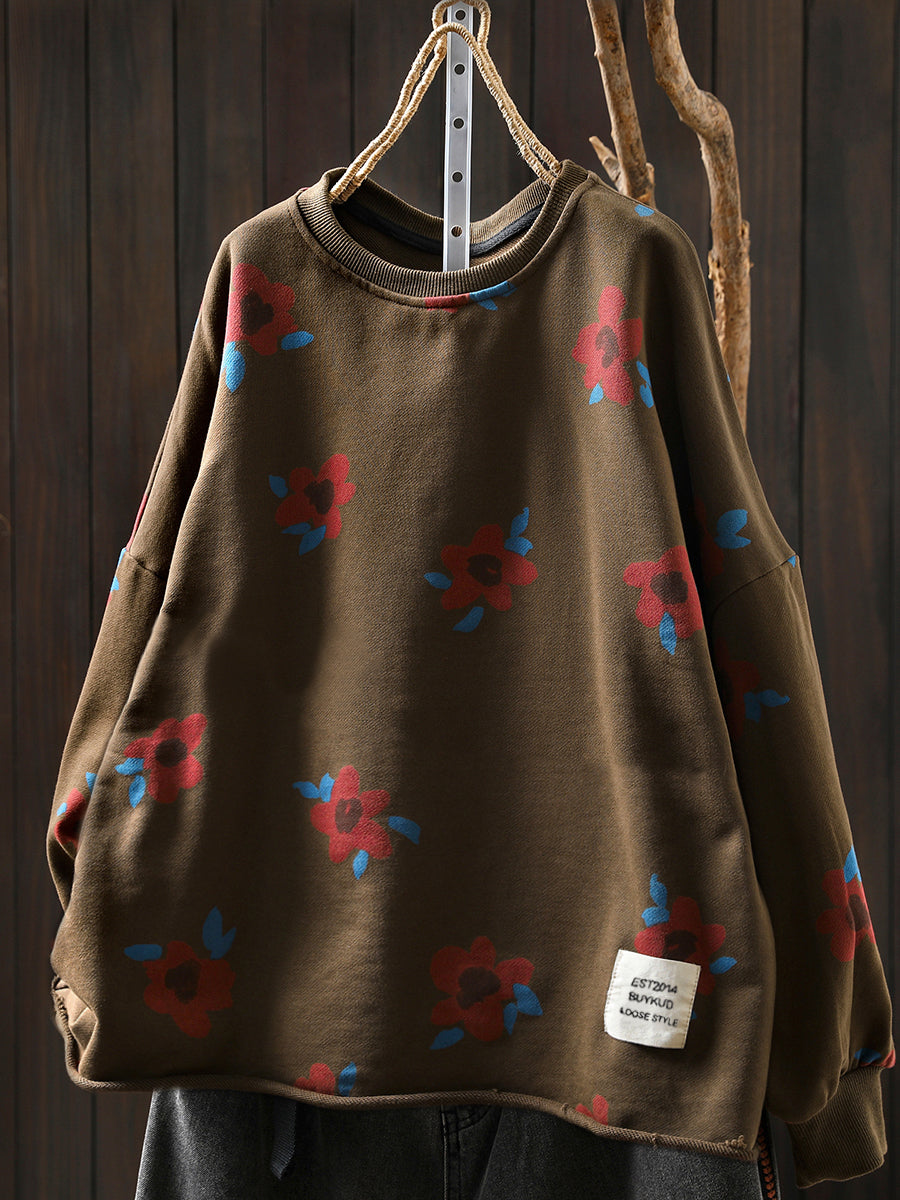 Plus Size Women Autumn Artsy Flower O-Neck Cotton Blouse