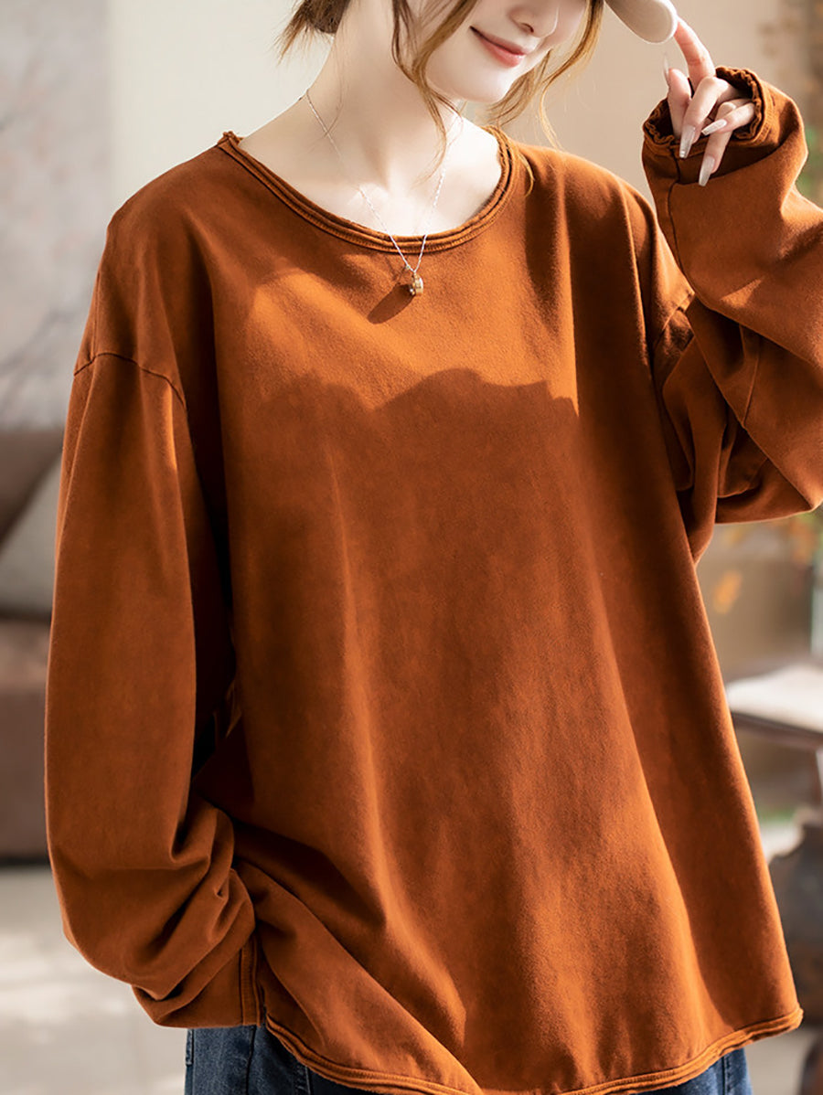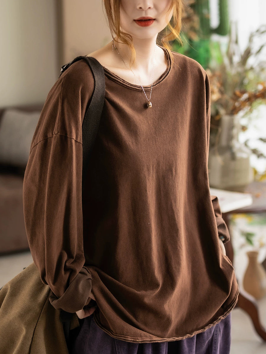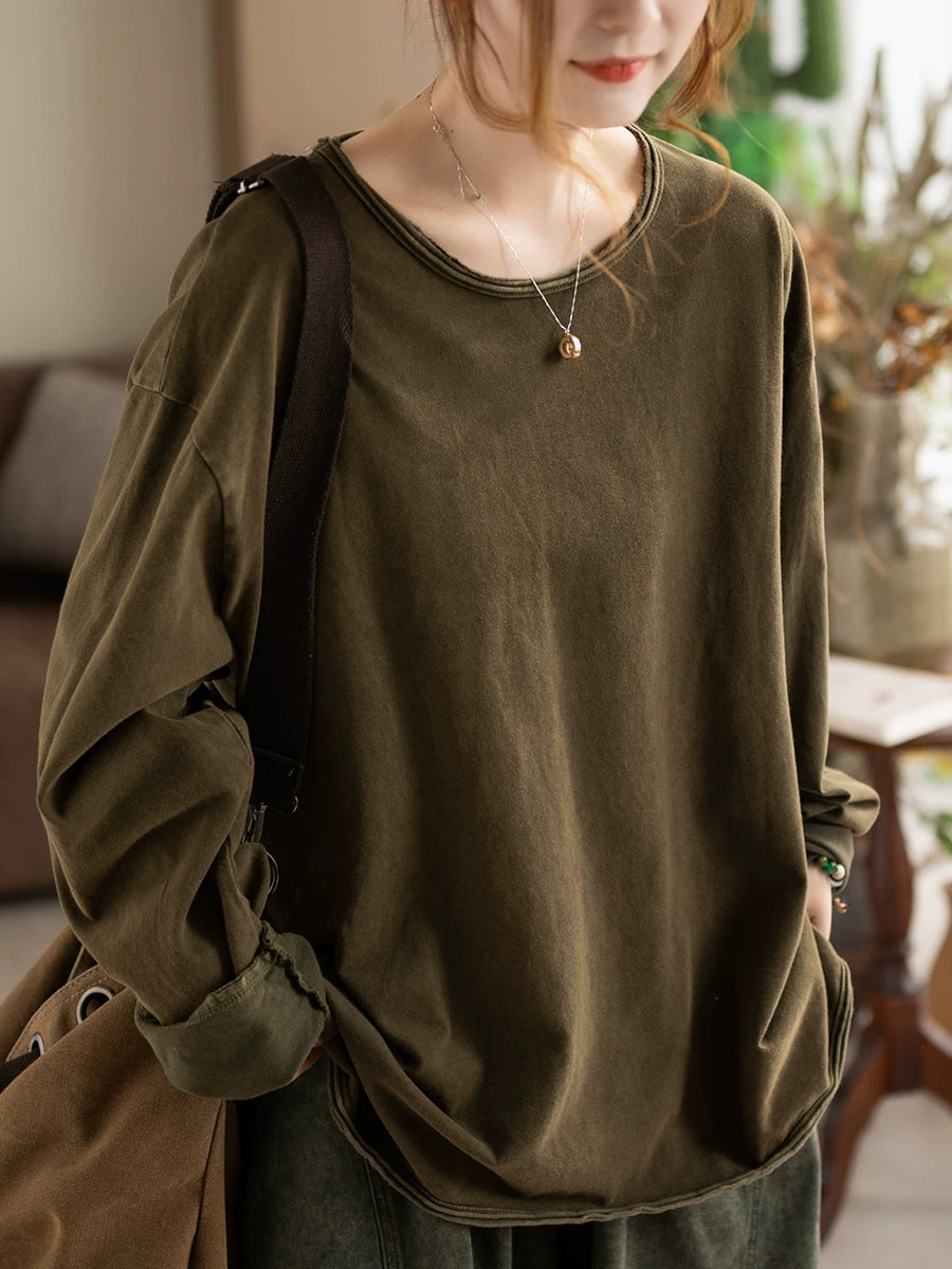 Women Spring Casual Pure Color 100%Cotton O-Neck Blouse