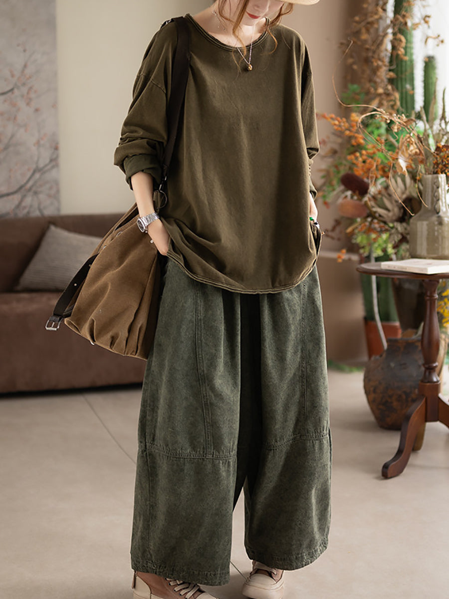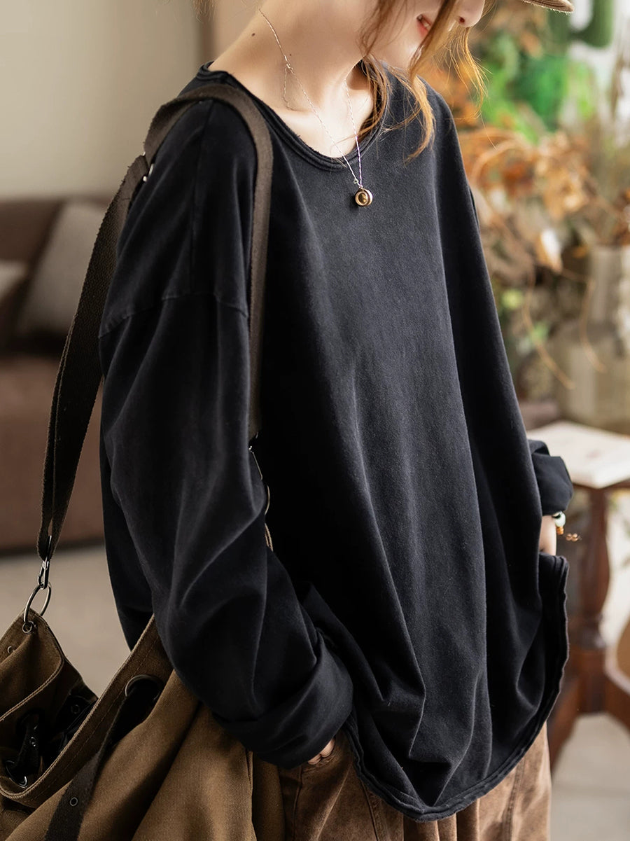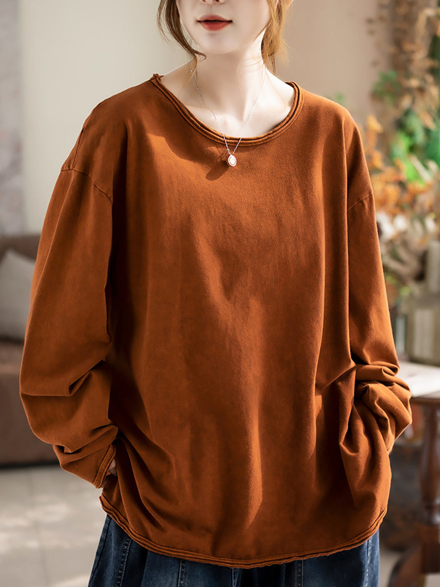 Women Spring Casual Pure Color 100%Cotton O-Neck Blouse
