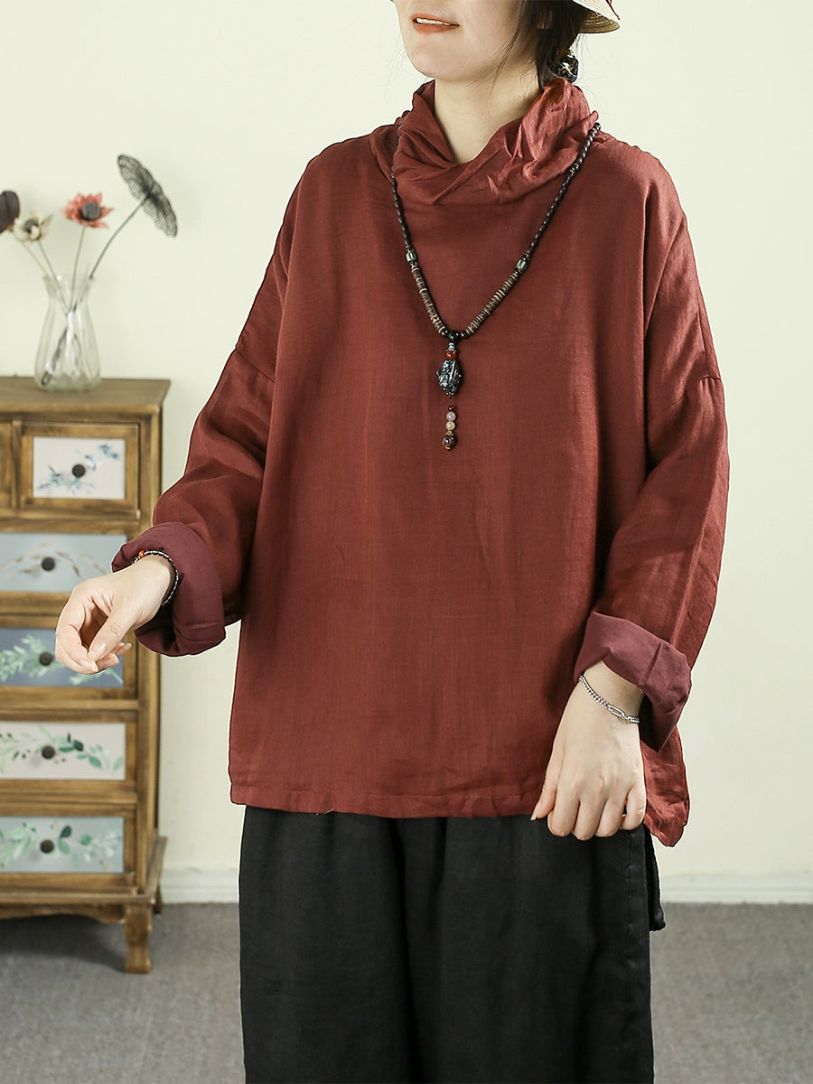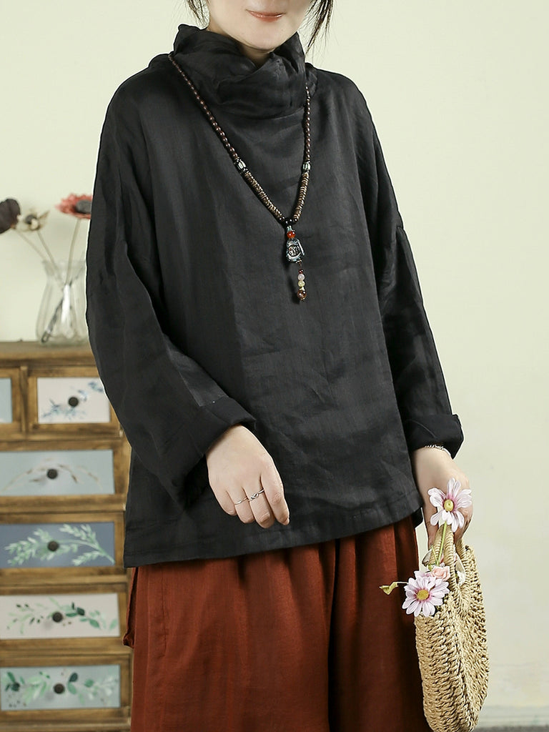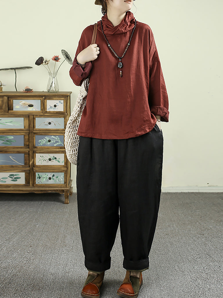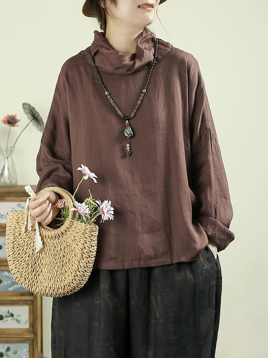 Women Vintage Pure Color Turtleneck 100%Ramie Blouse