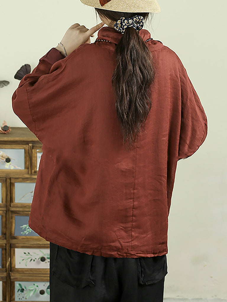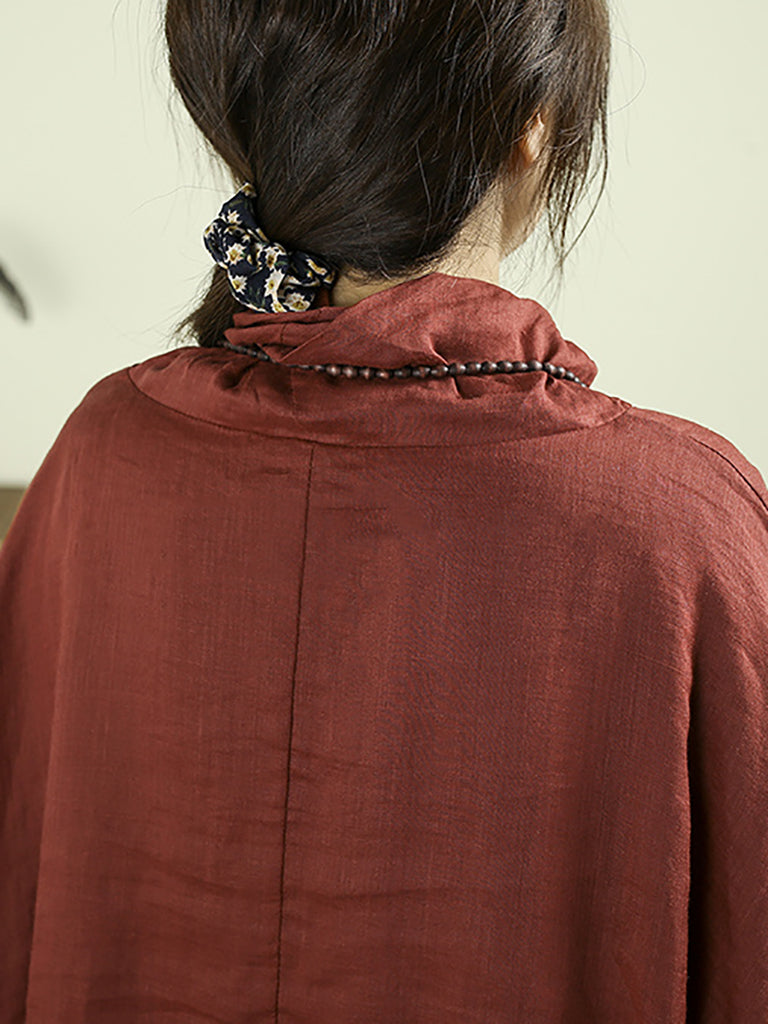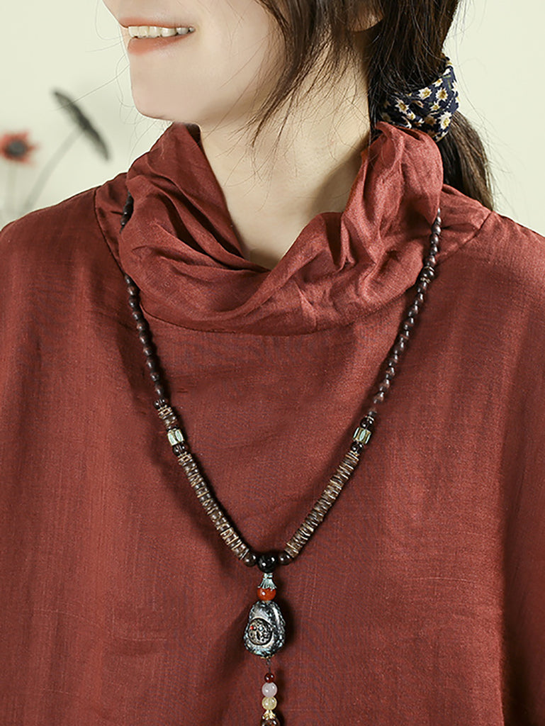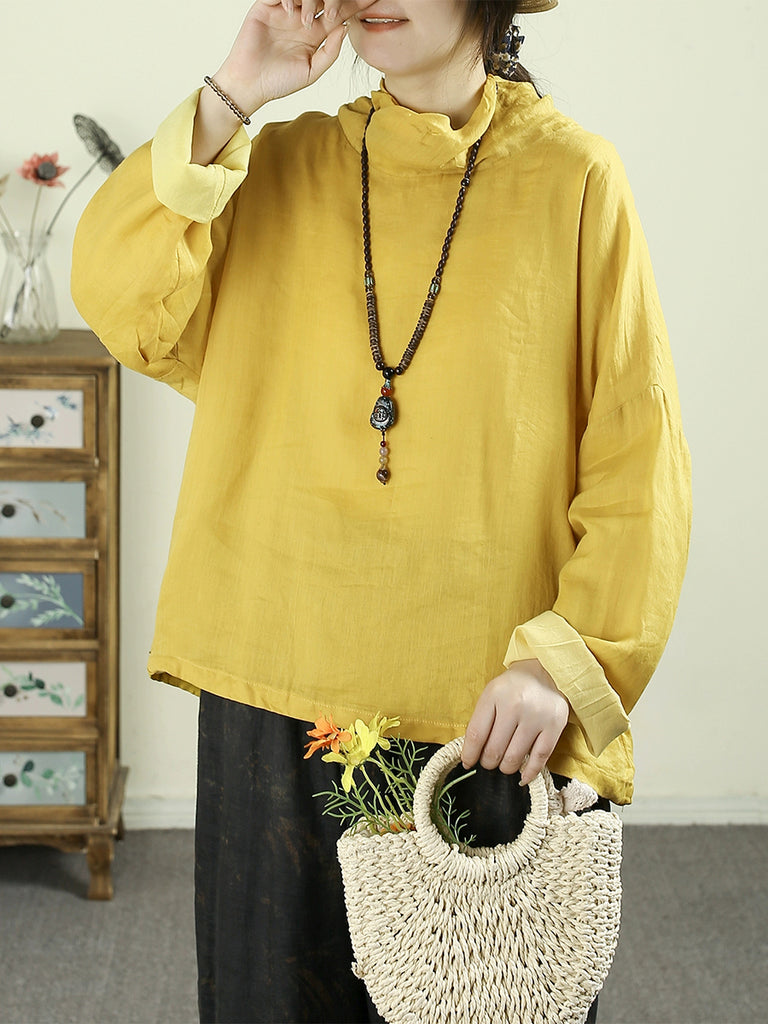 Women Vintage Pure Color Turtleneck 100%Ramie Blouse