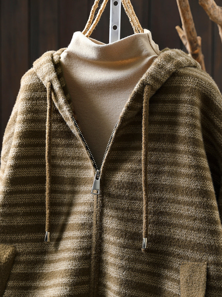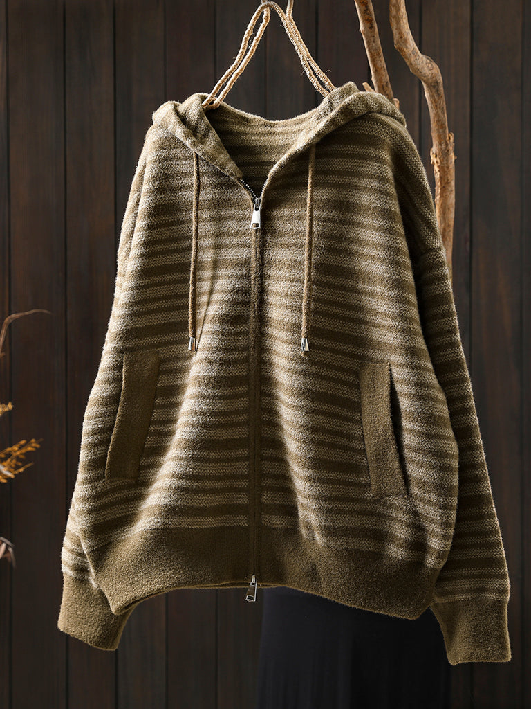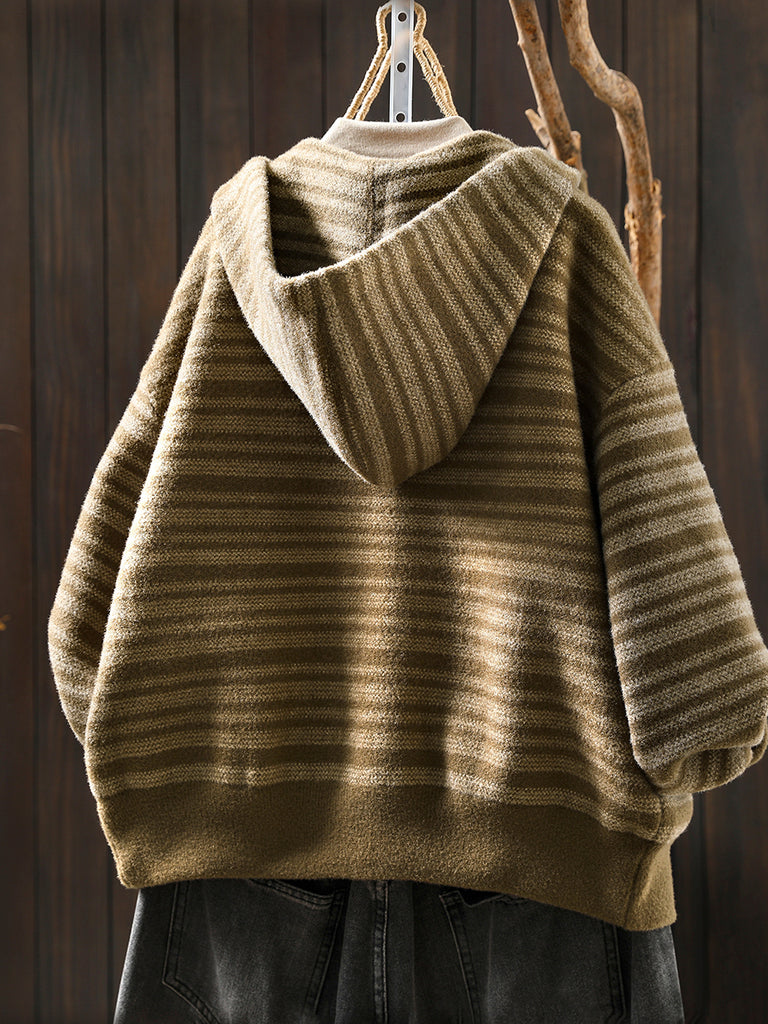 Women Autumn Artsy Stripe Knitted Hooded Jacket