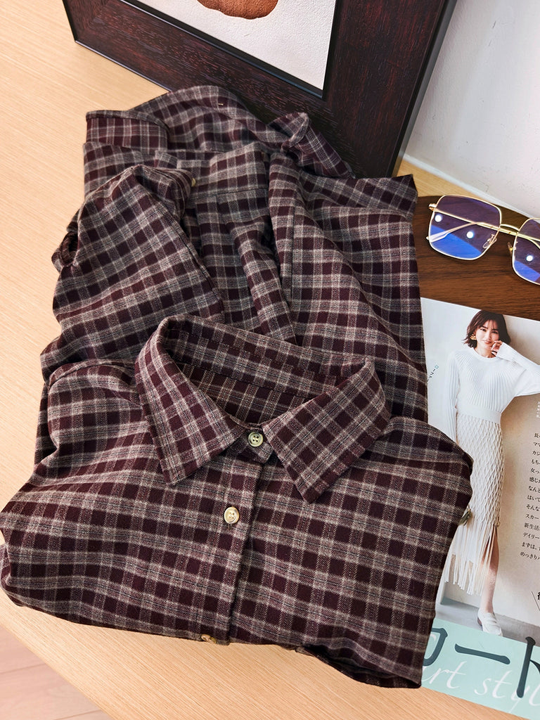 Women Autumn Vintage Plaid Turn-down Collar Shirt