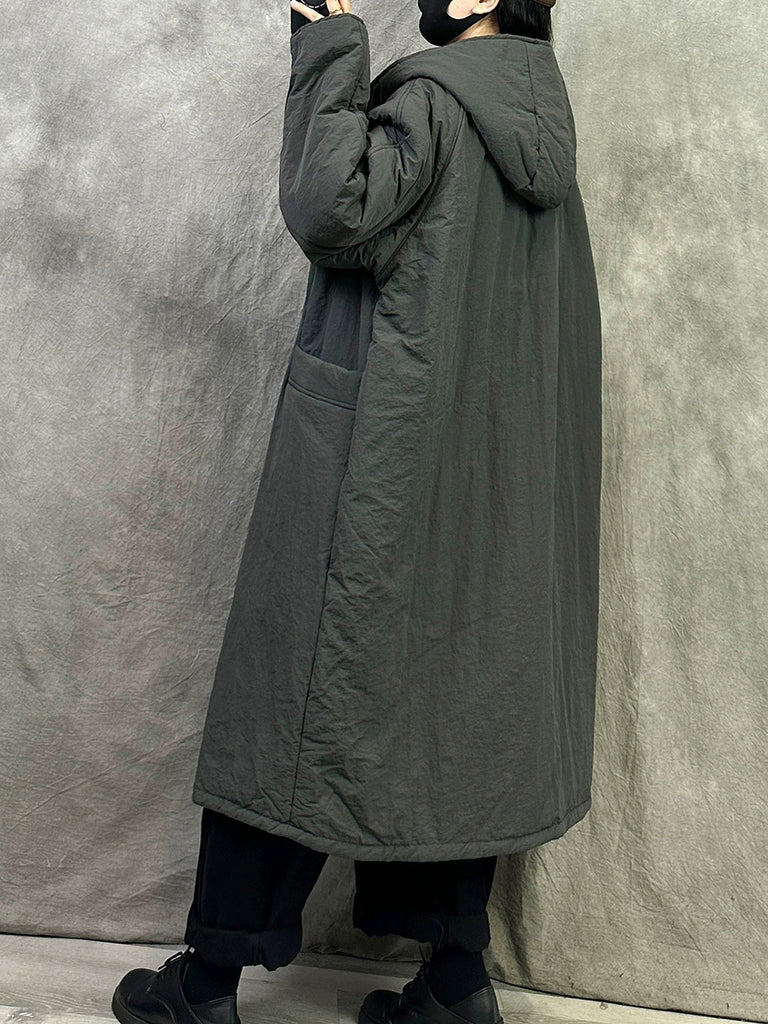 Crafted from cotton, this long coat features a solid color design and a hooded collar for added warmth. It boasts full raglan sleeves with a vintage touch, making it an ideal choice for autumn and winter seasons.