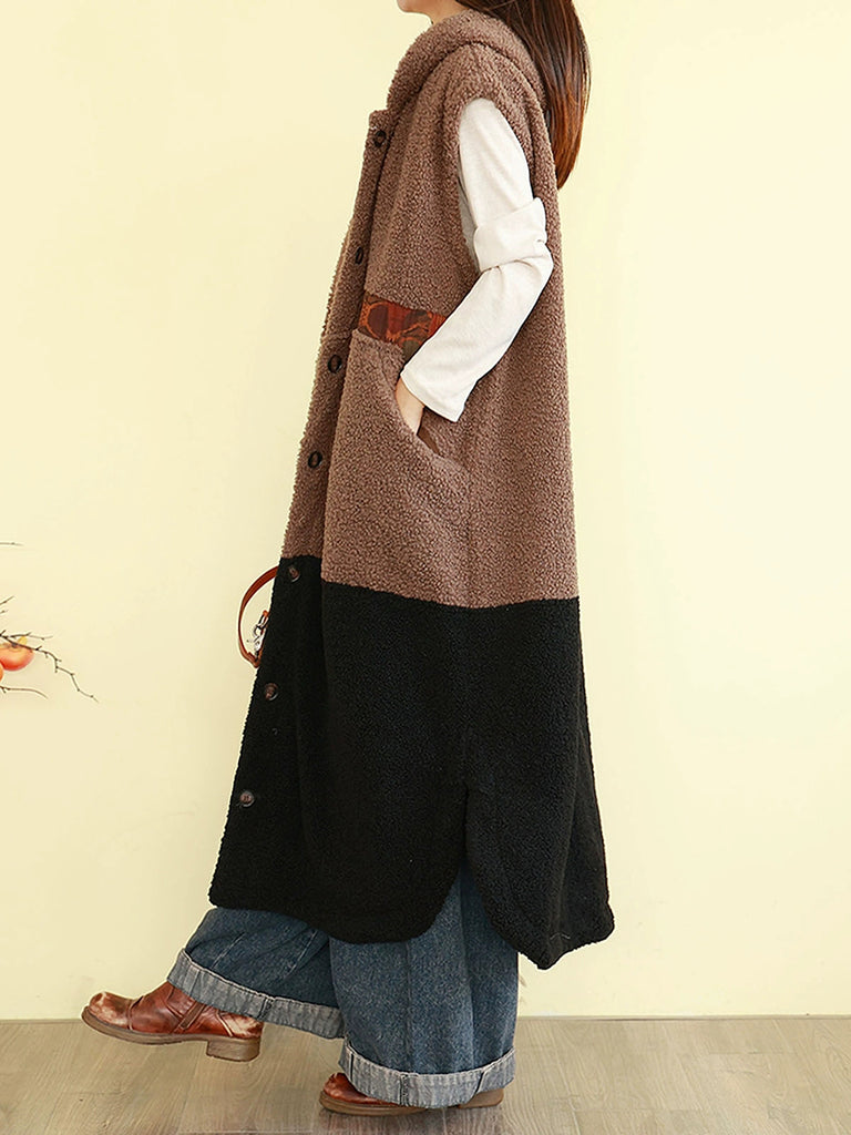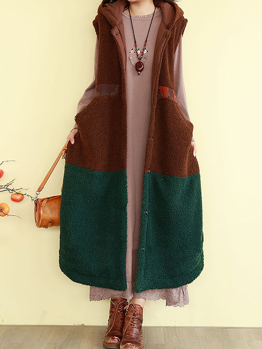 Women Winter Fleece Colorblock Hooded Padded Vest Coat