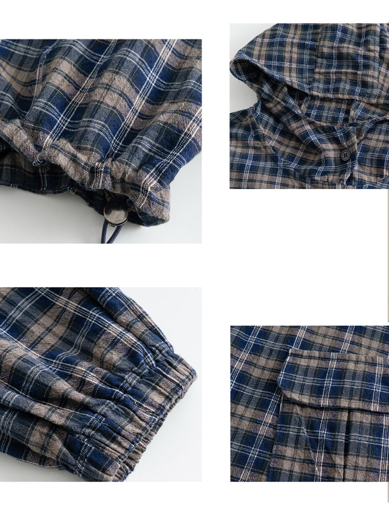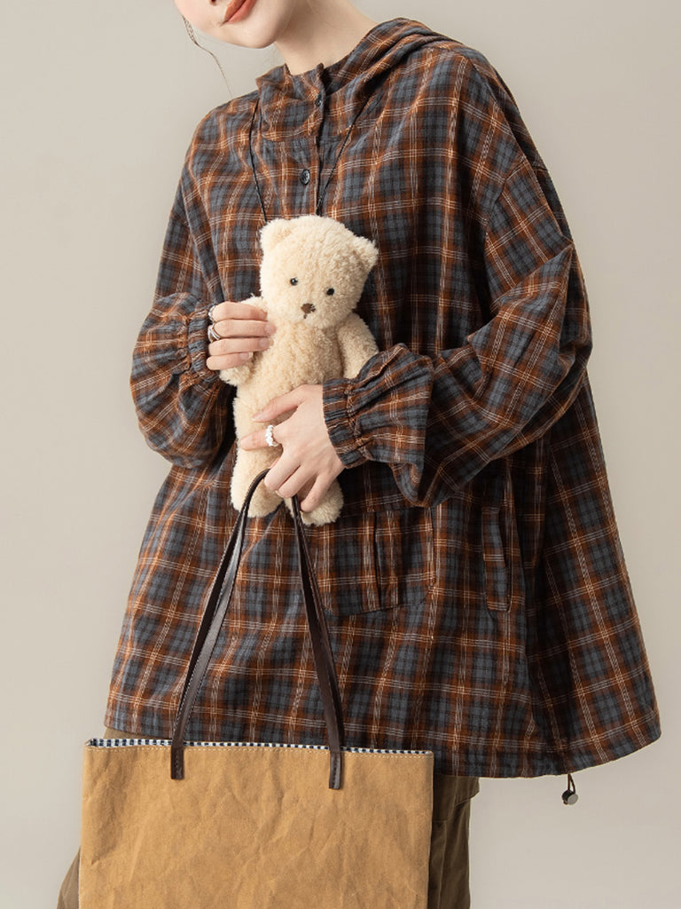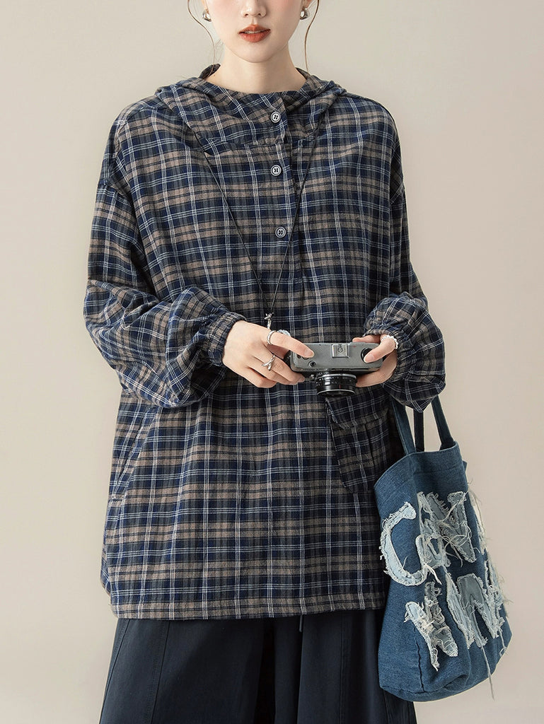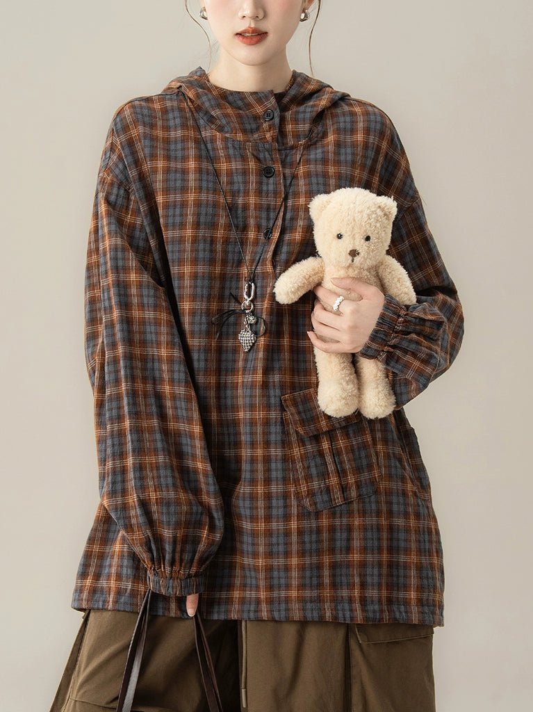 Featuring a plaid pattern and a hooded collar, this blouse offers full raglan sleeves with a vintage-inspired design. Ideal for autumn and winter, it combines classic style with comfortable coverage.