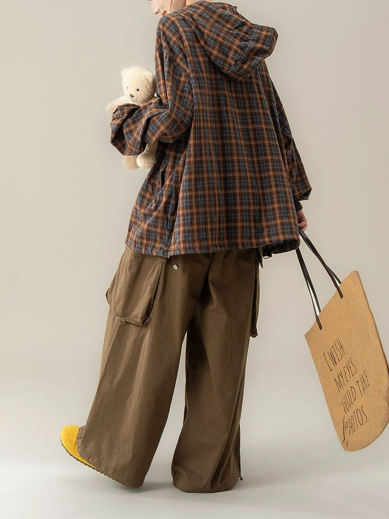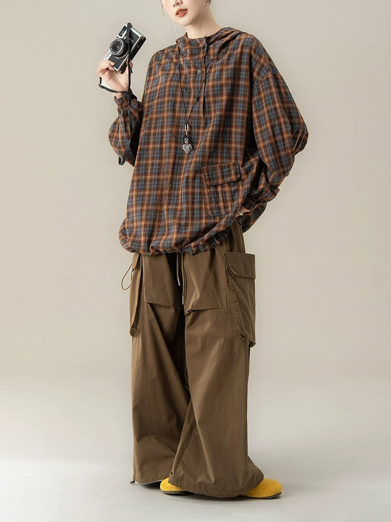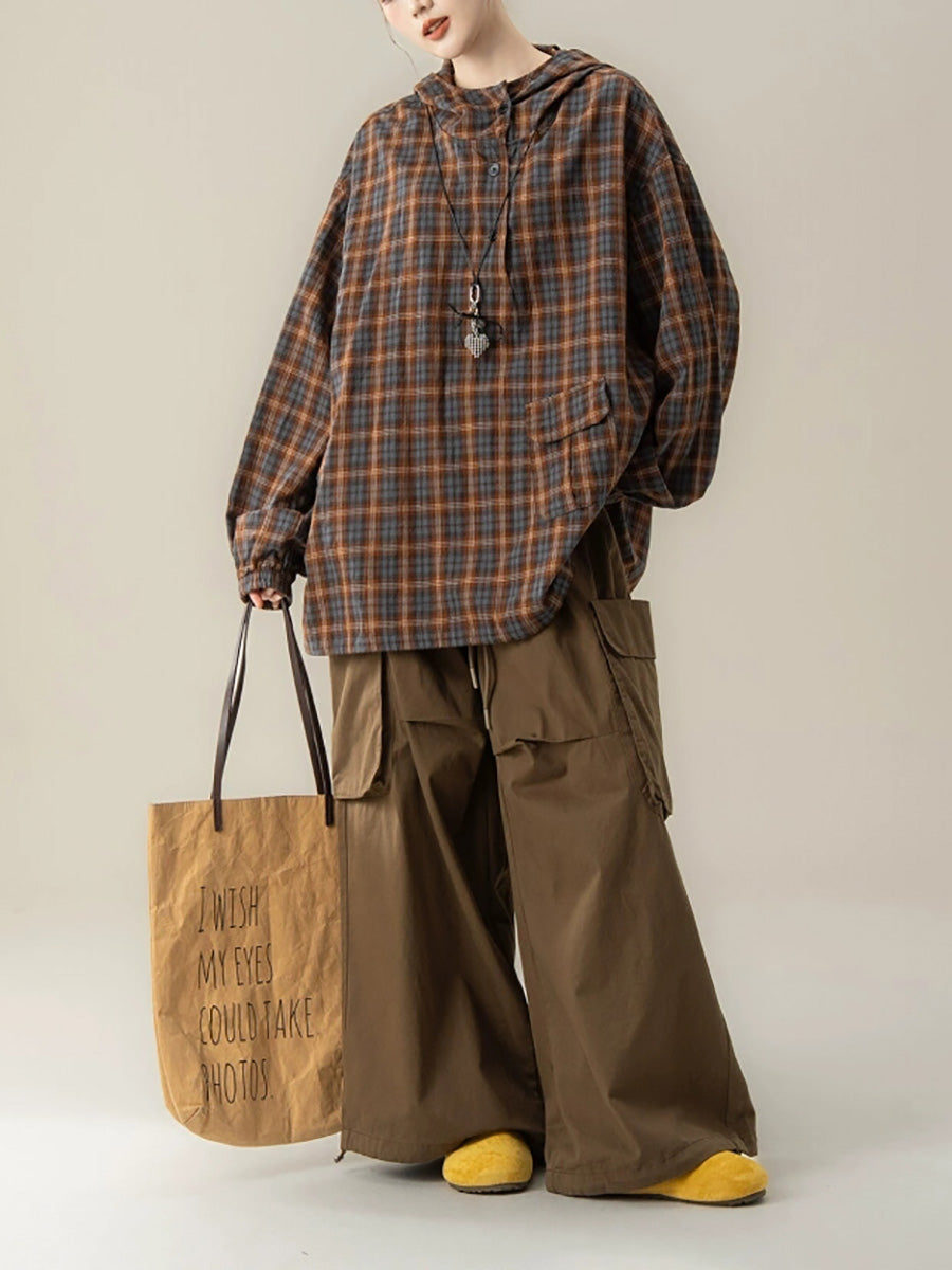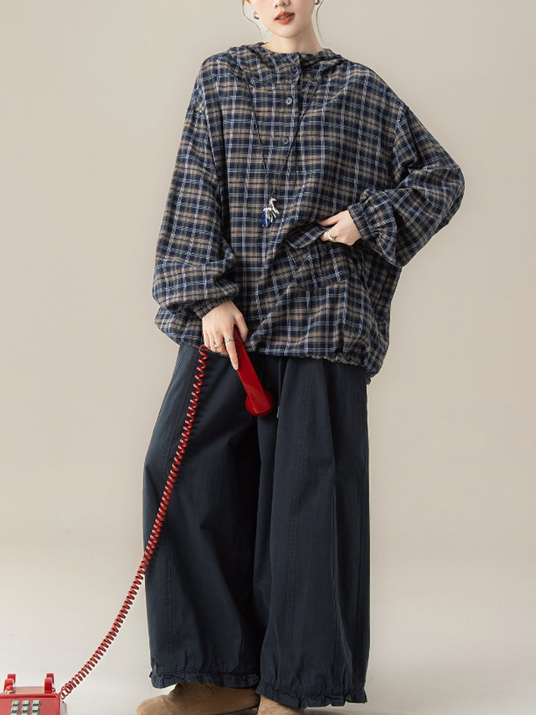 Featuring a plaid pattern and a hooded collar, this blouse offers full raglan sleeves with a vintage-inspired design. Ideal for autumn and winter, it combines classic style with comfortable coverage.