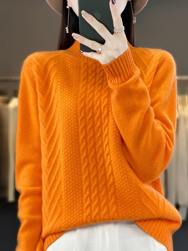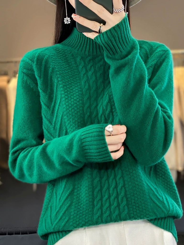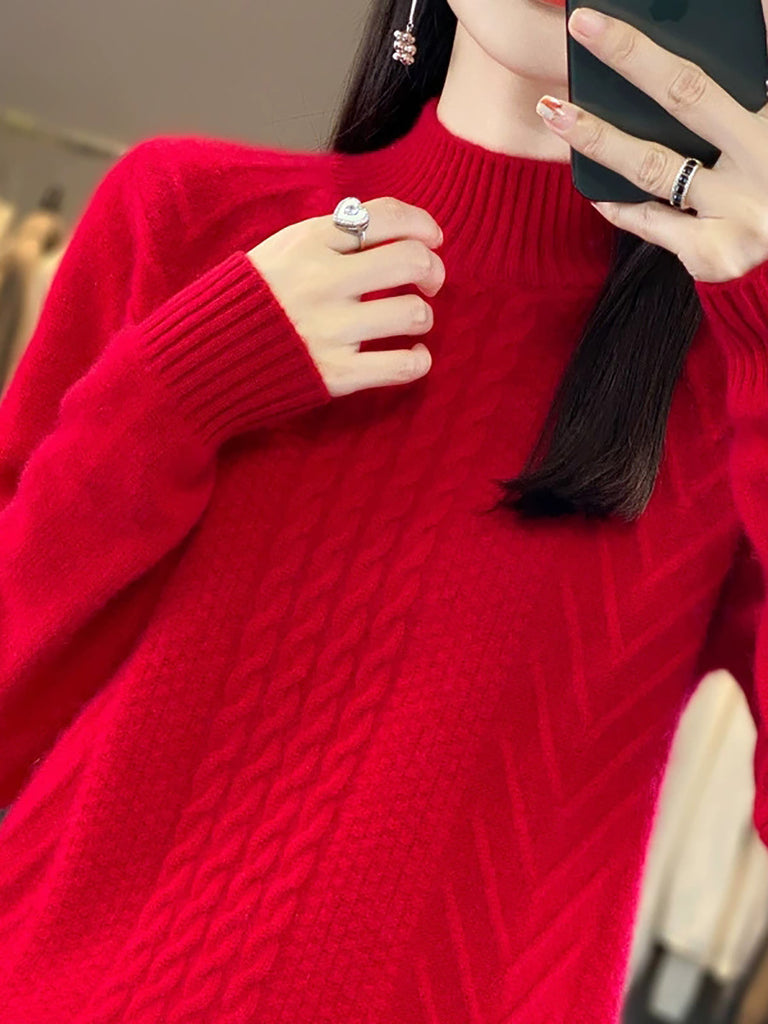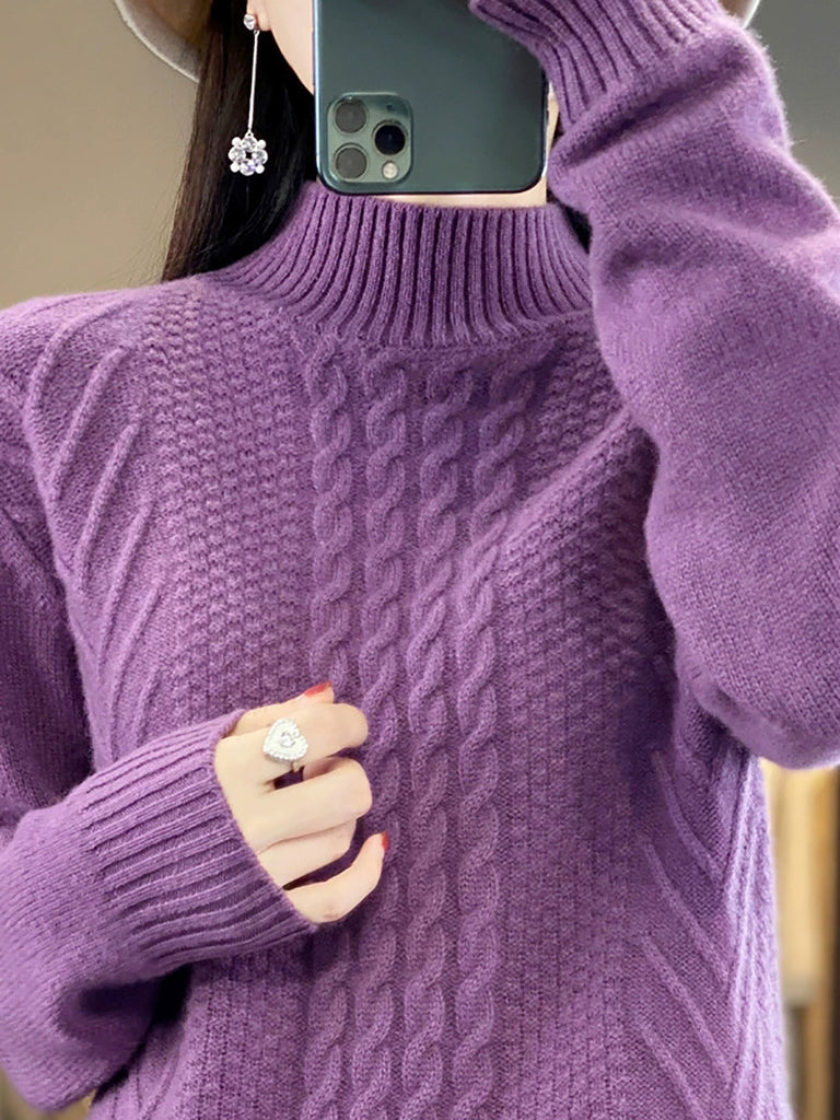 Women Autumn Retro Pure Color Knitted Half-Turtleneck Sweater
