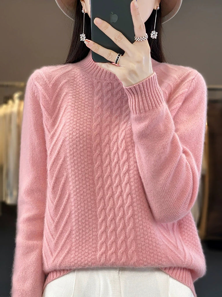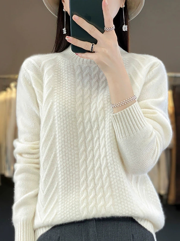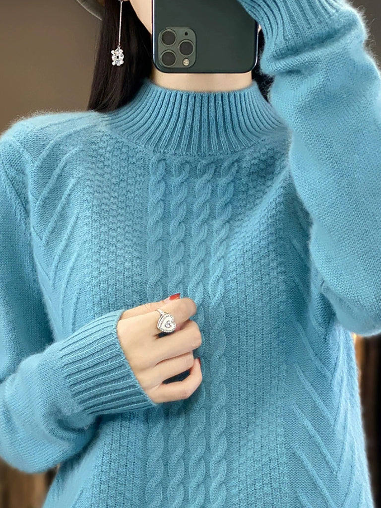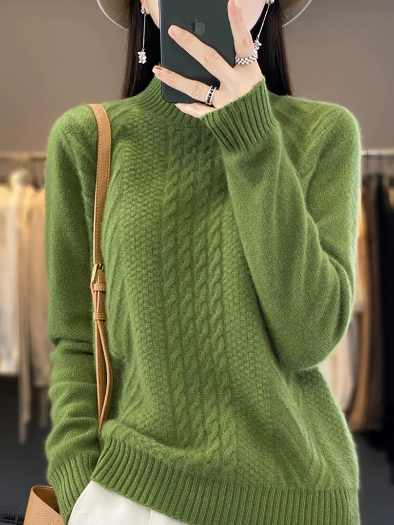 Women Autumn Retro Pure Color Knitted Half-Turtleneck Sweater