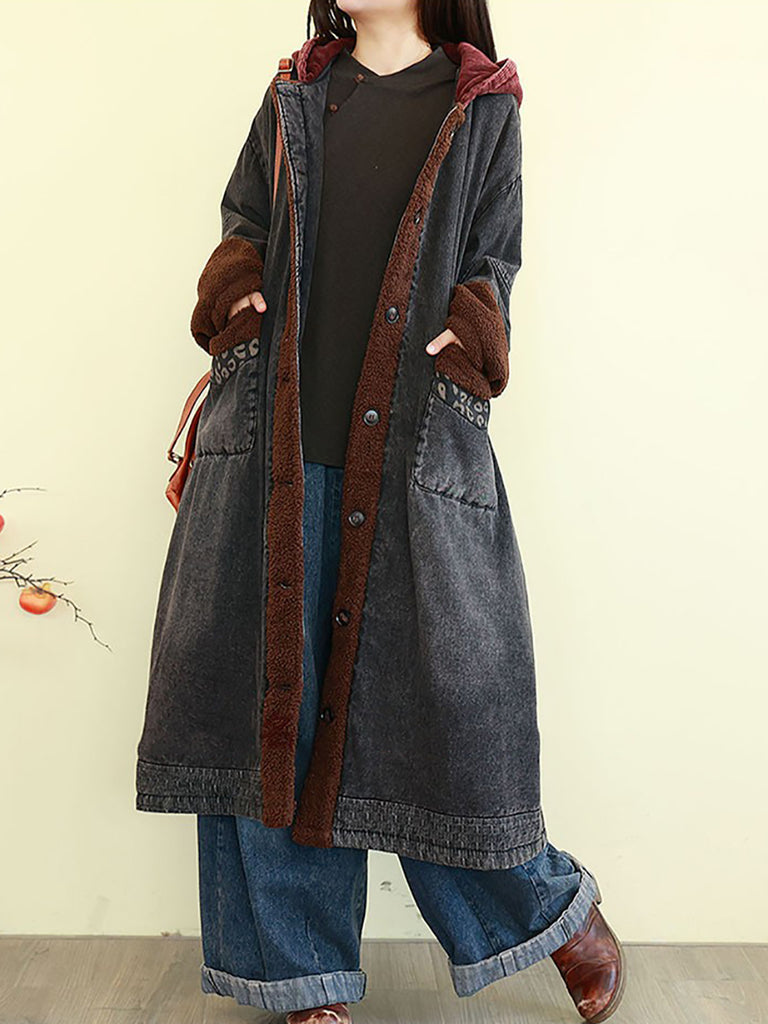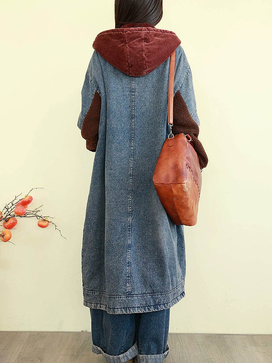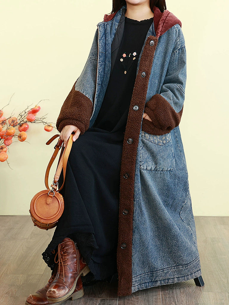 Women Winter Vintage Spliced Denim Padded Hooded Coat