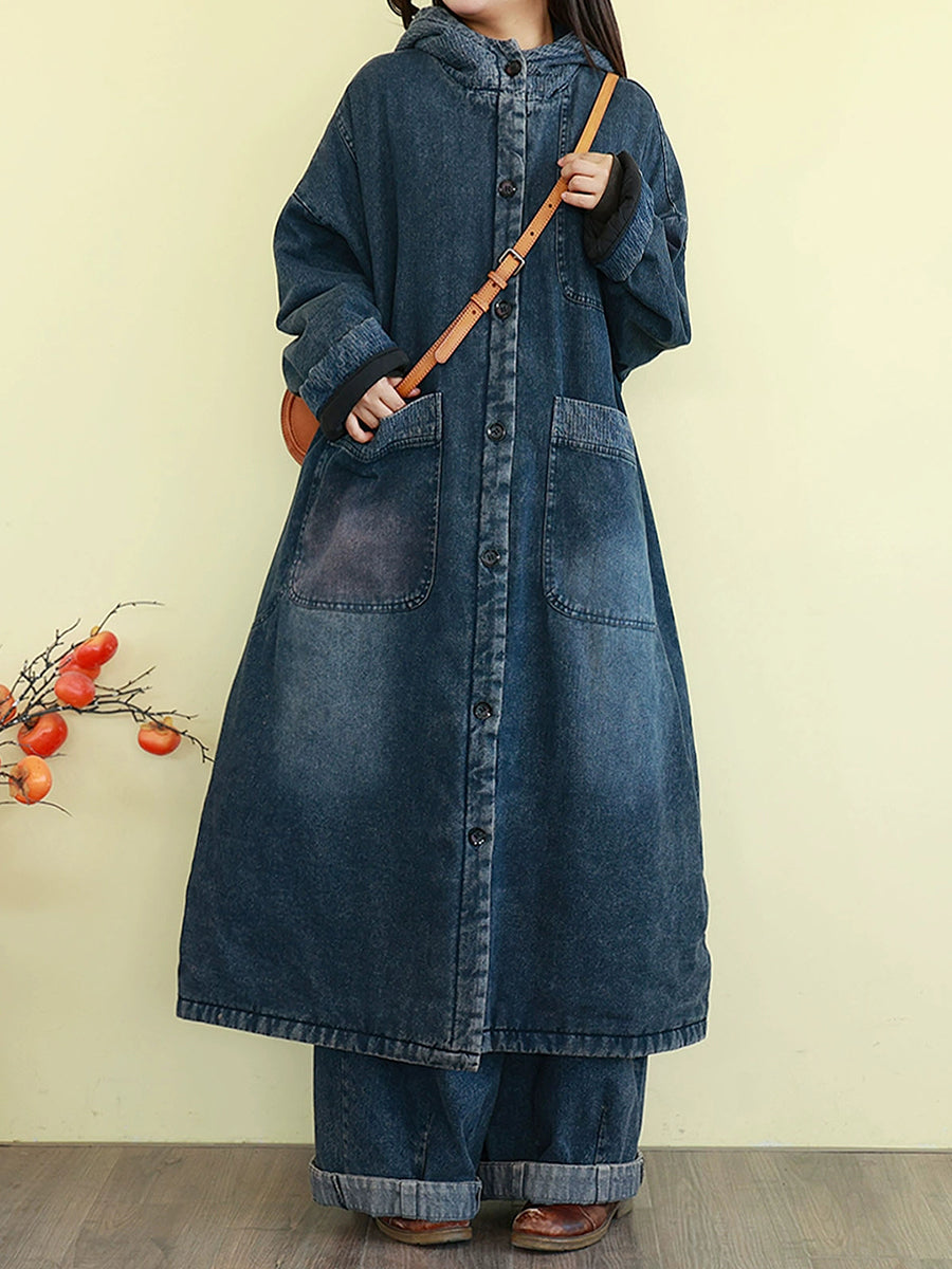 Women Winter Vintage Washed Denim Padded Hooded Coat