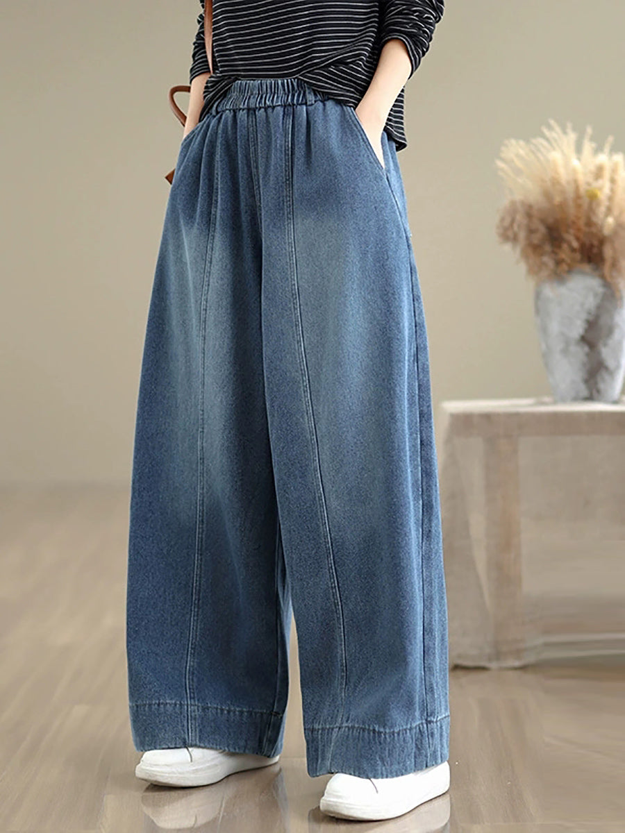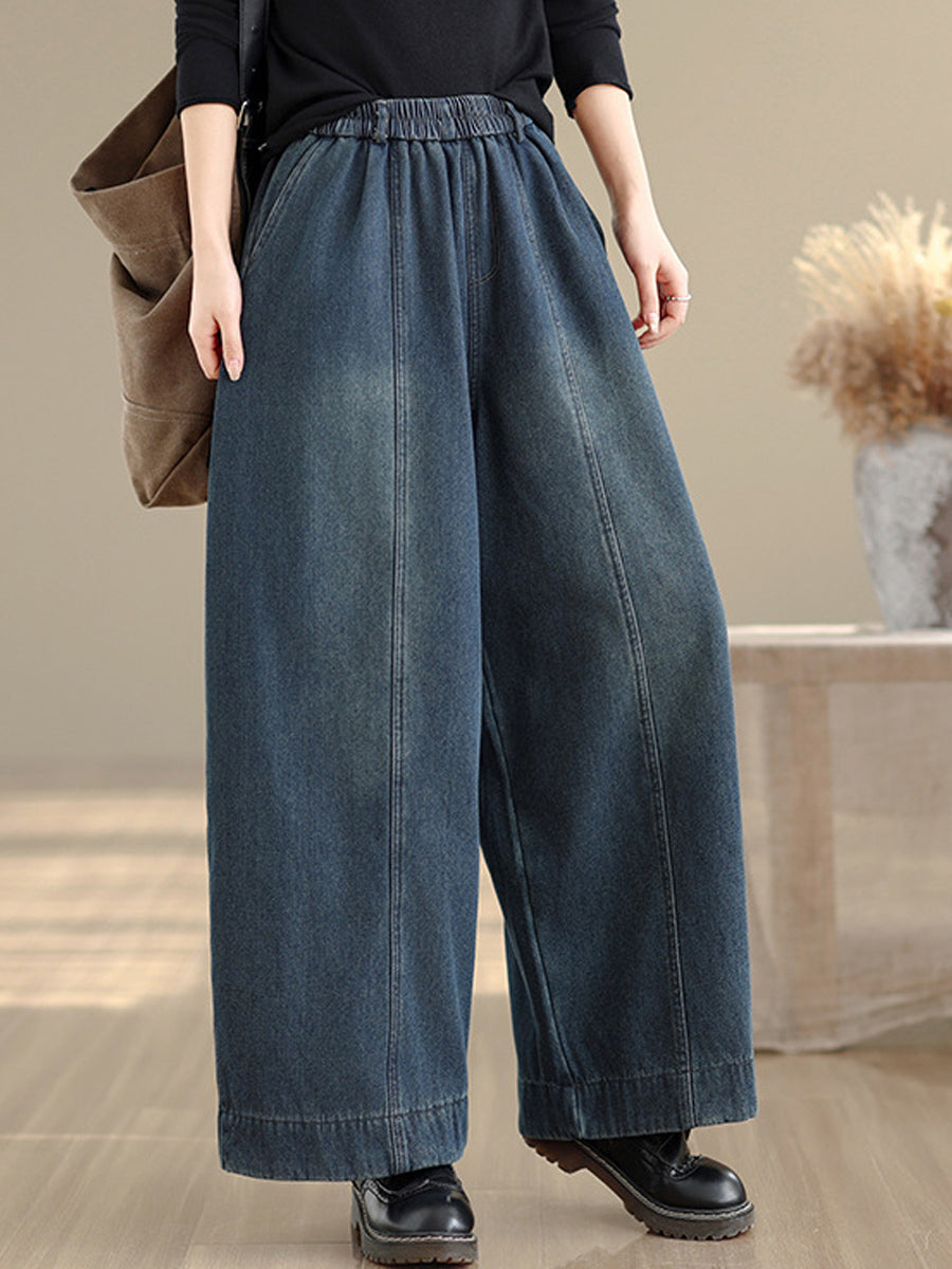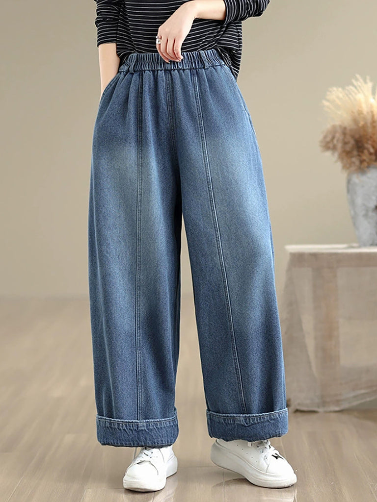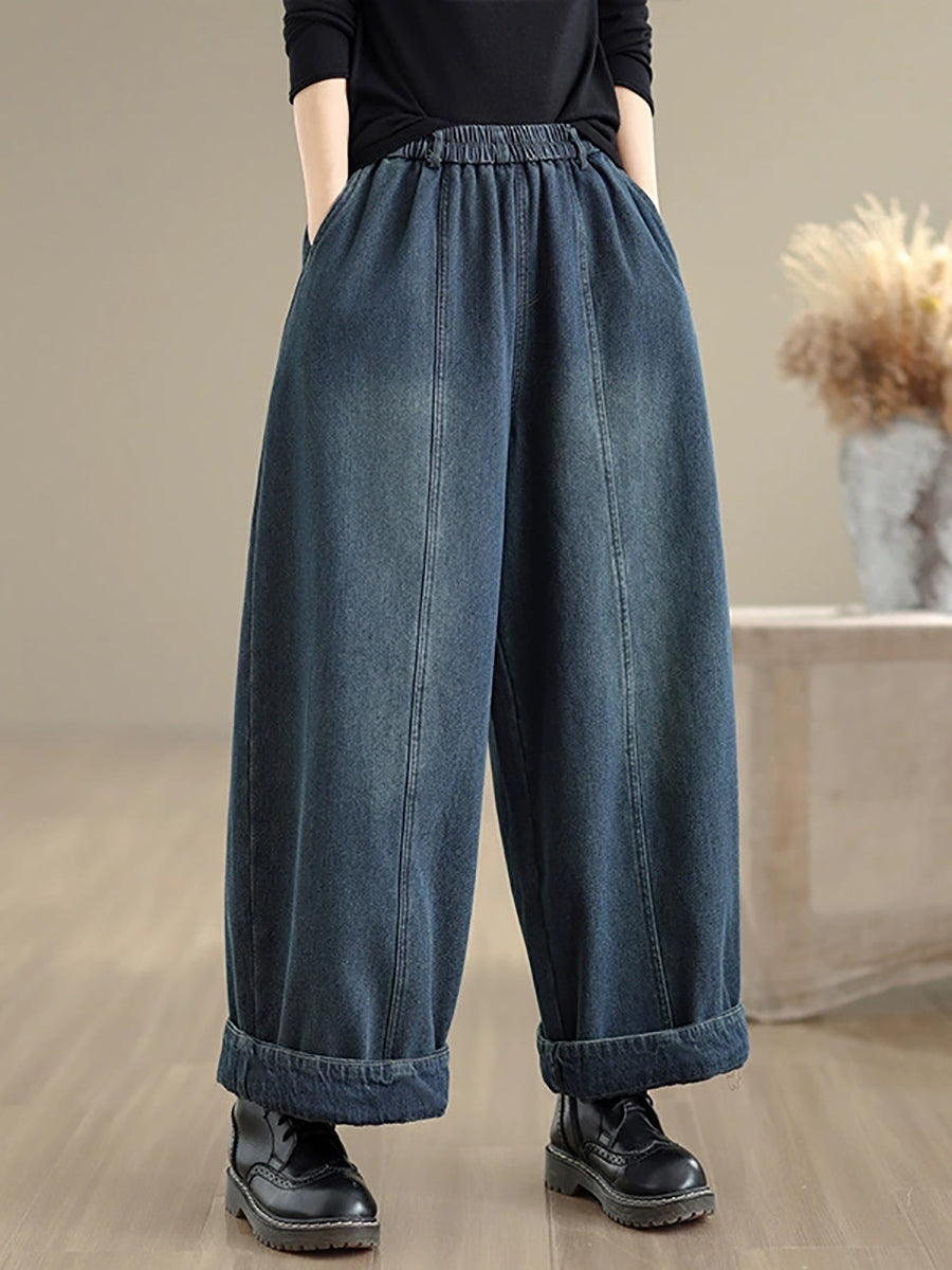 Women Autumn Retro Denim Fleece-lined Straight Pants