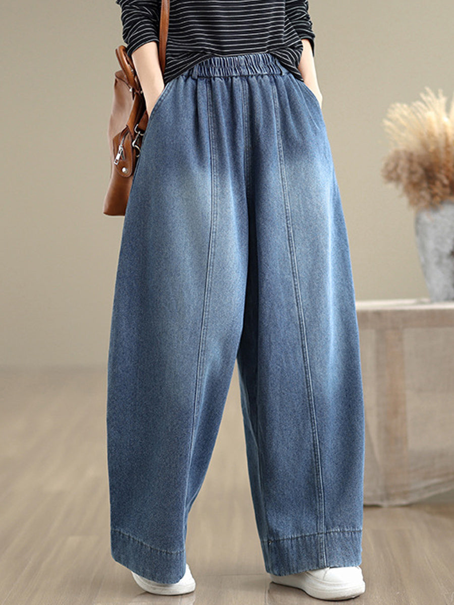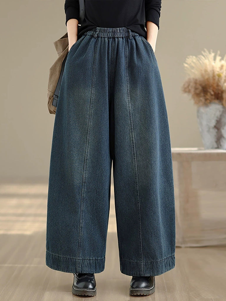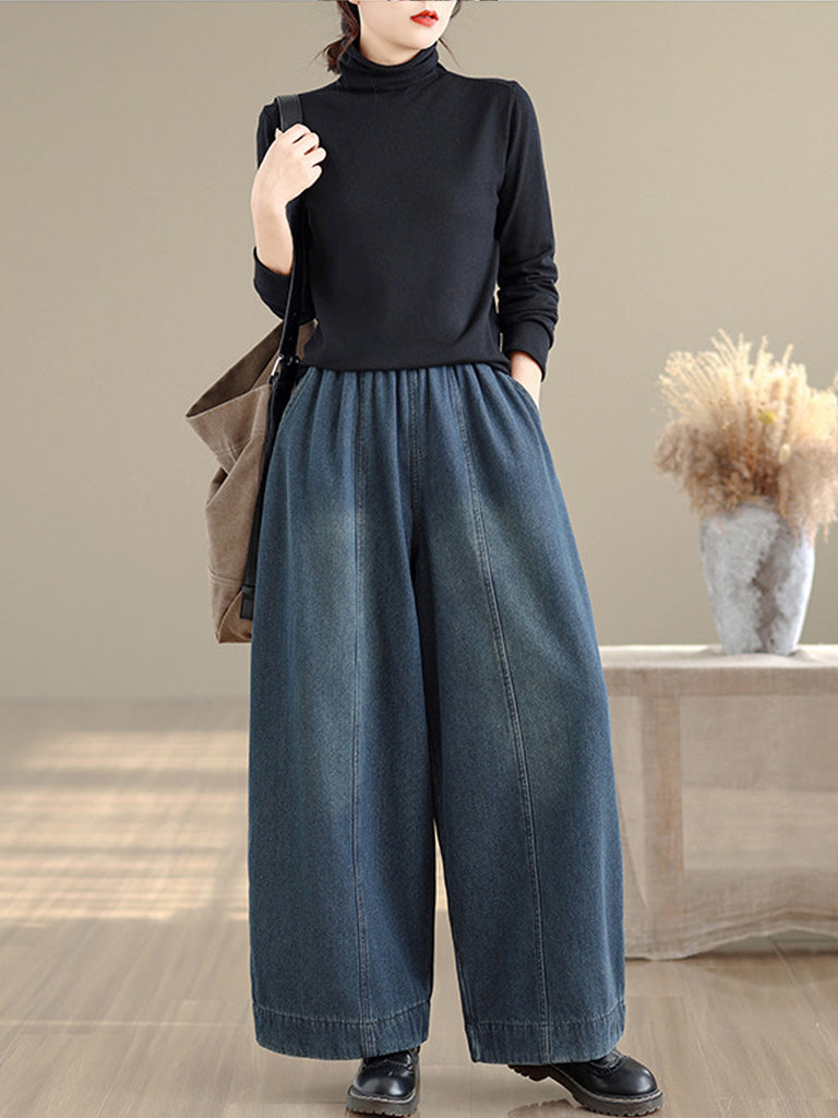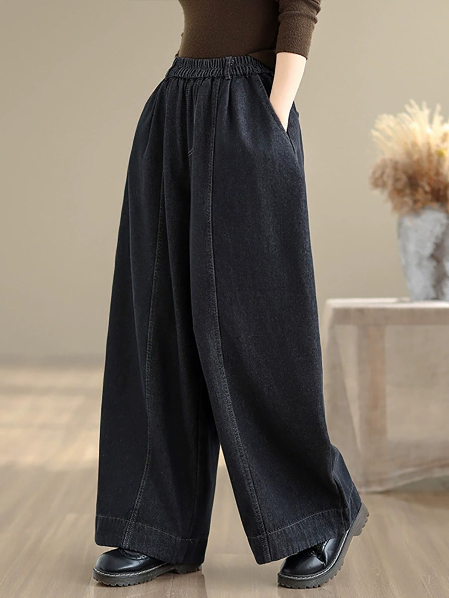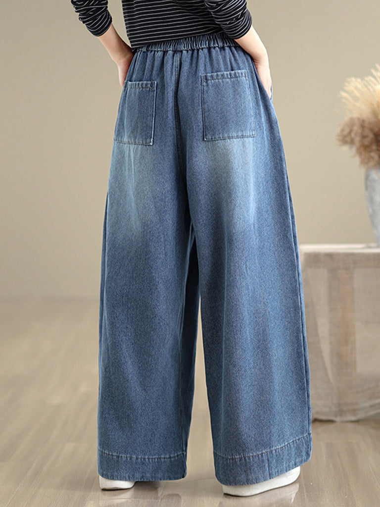 Women Autumn Retro Denim Fleece-lined Straight Pants
