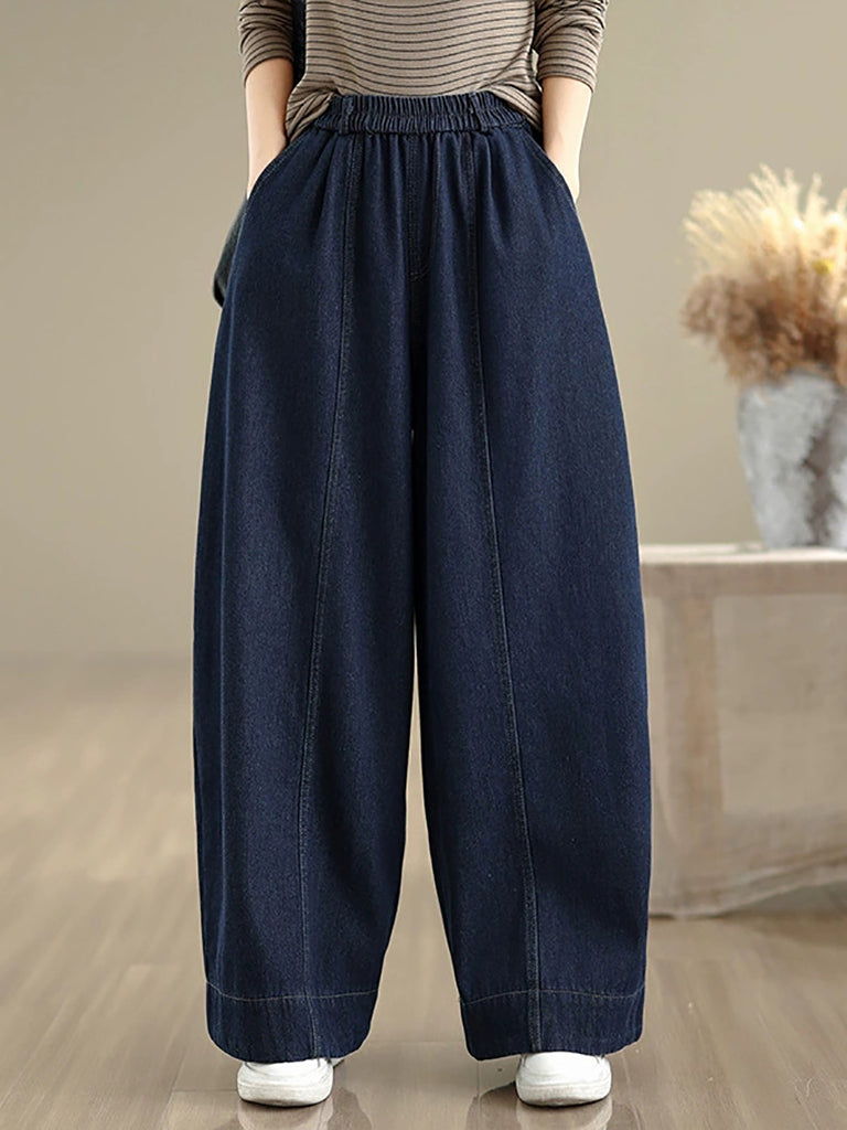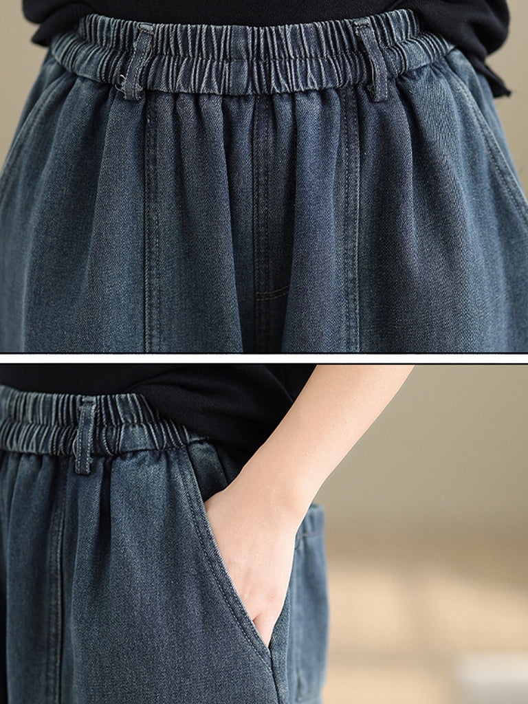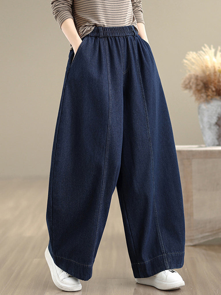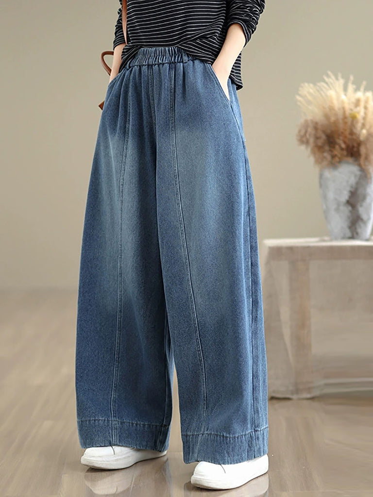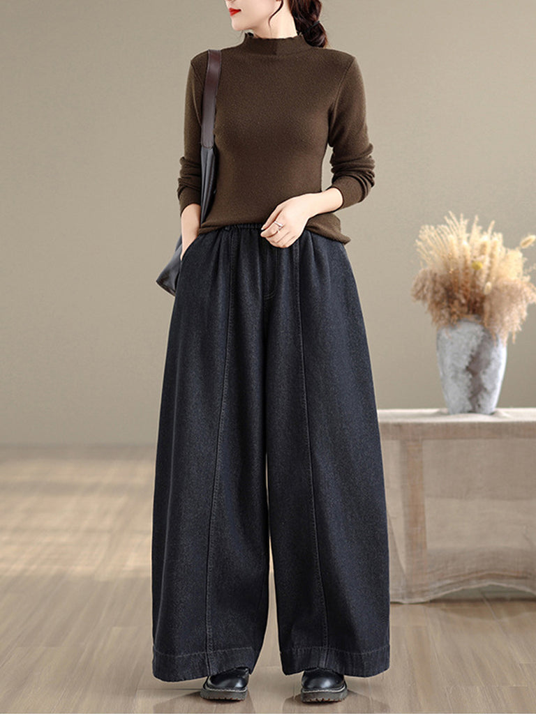 Women Autumn Retro Denim Fleece-lined Straight Pants