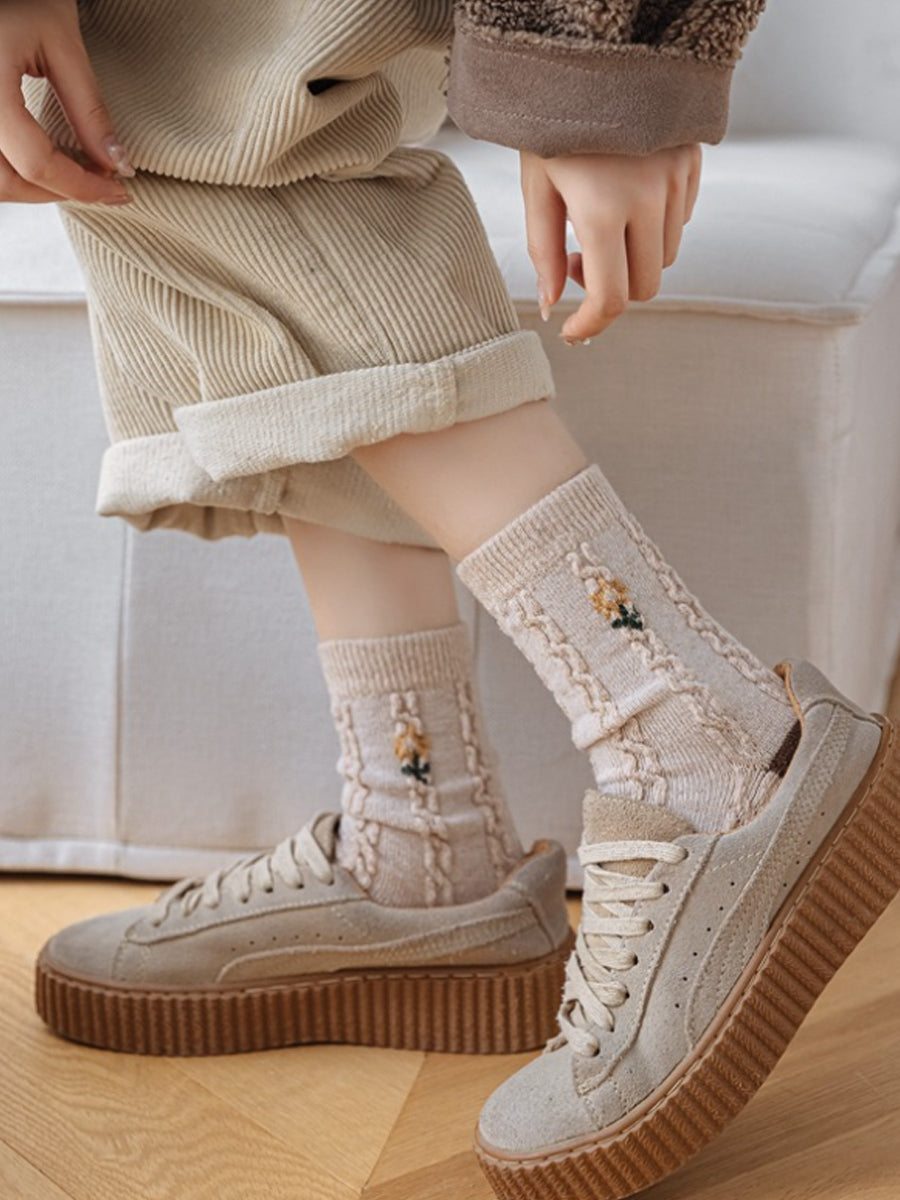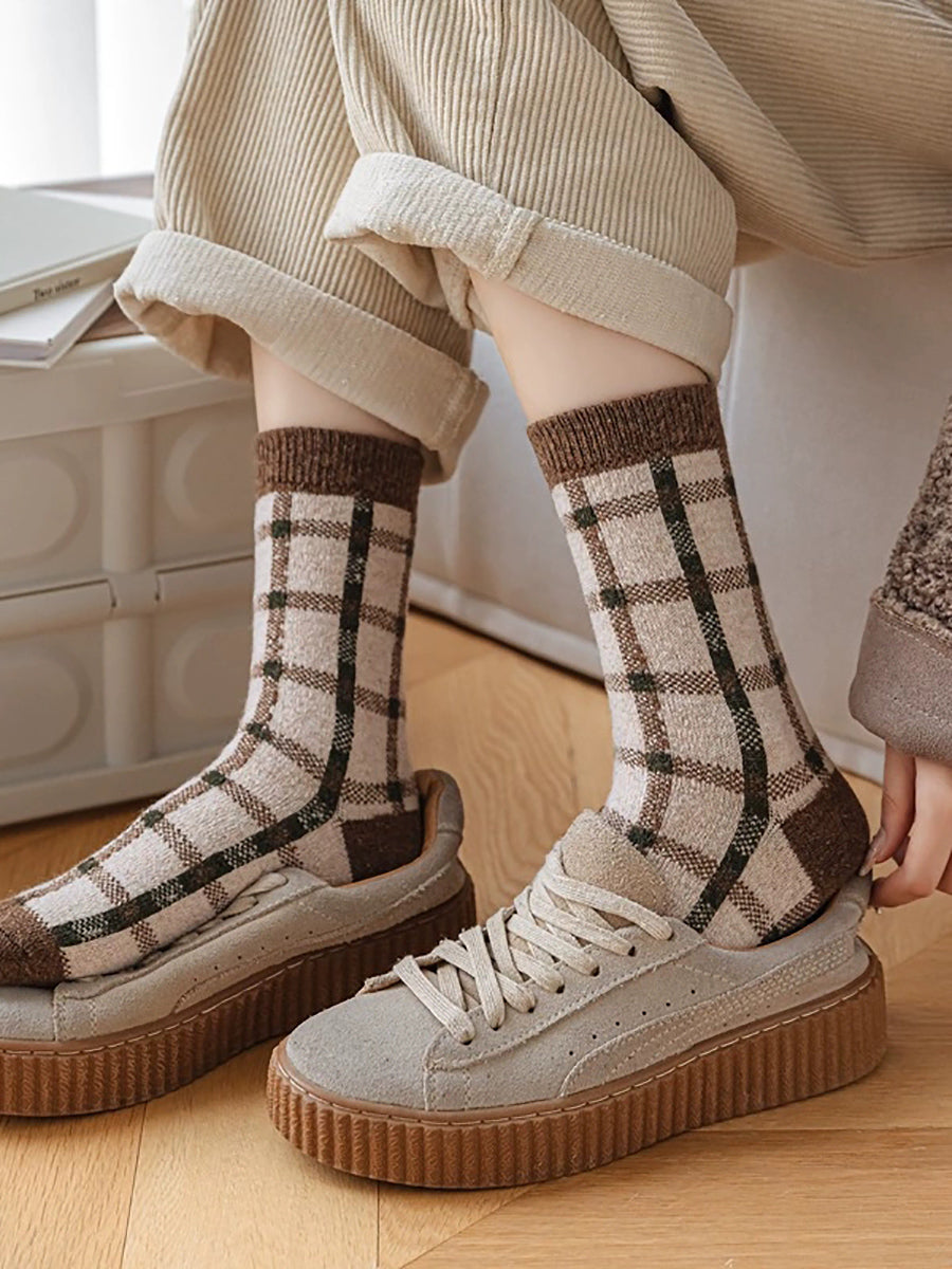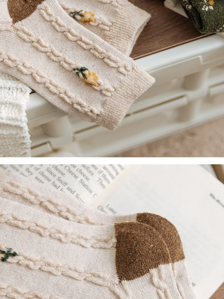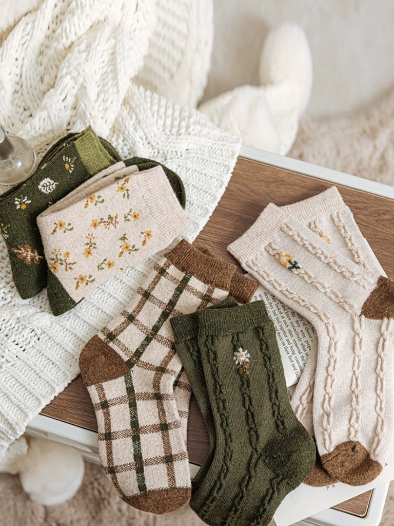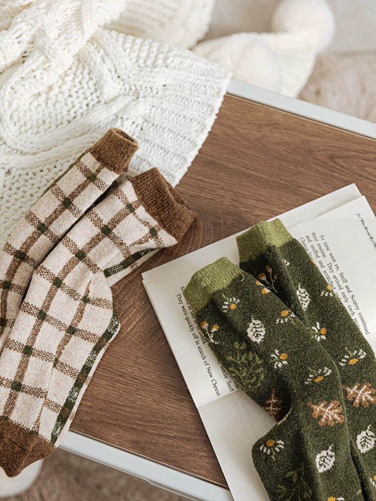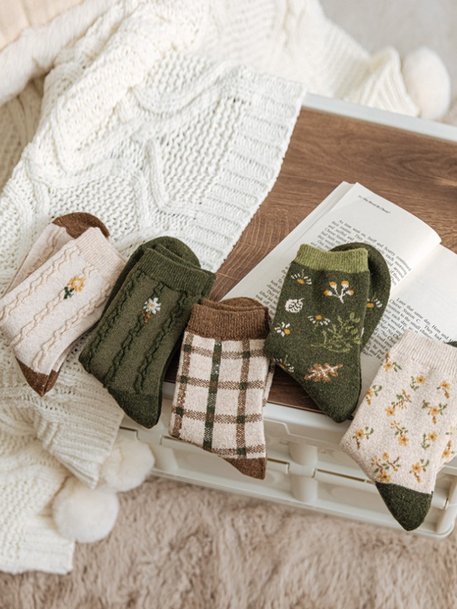 5 Pairs Women Winter Artsy Plaid Flower Jacquard Socks