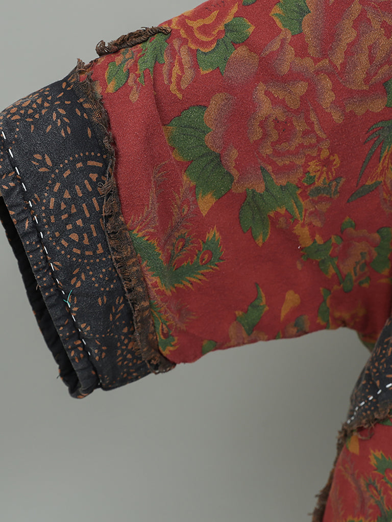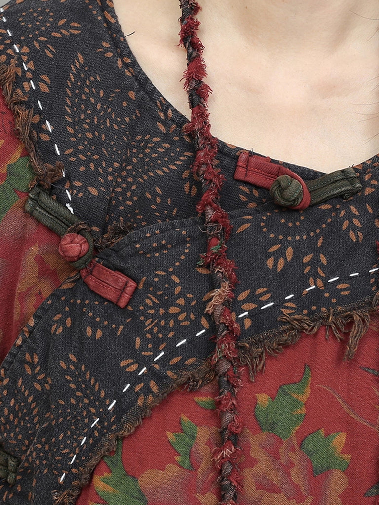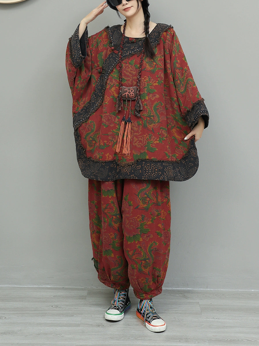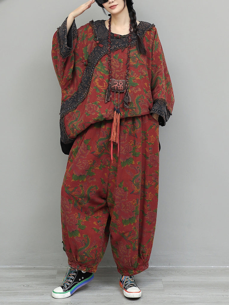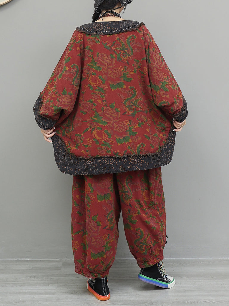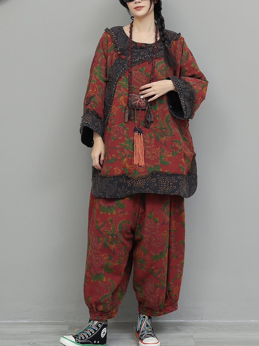 Women Winter Retro Flower Spliced O-Neck Suits