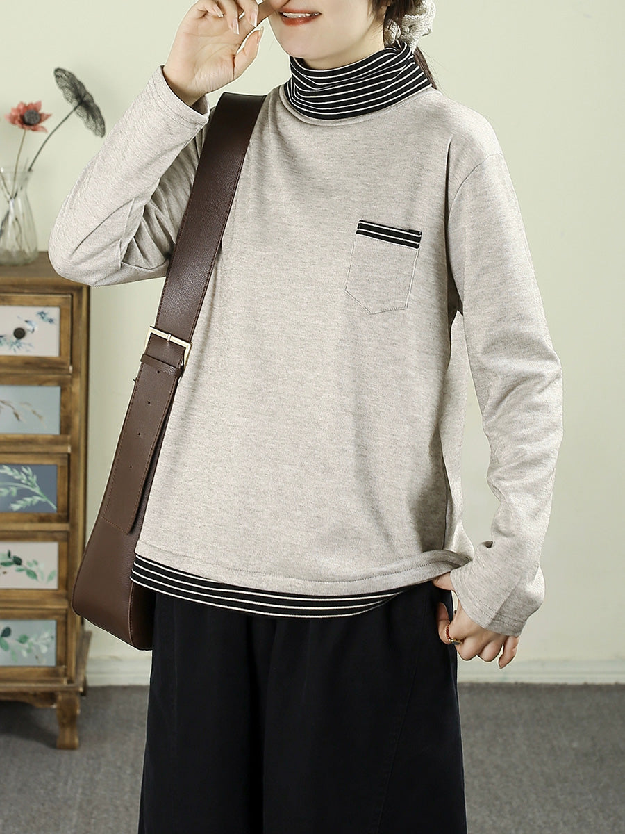 Women Winter Stripe Spliced Turtleneck Fleece-lined Blouse