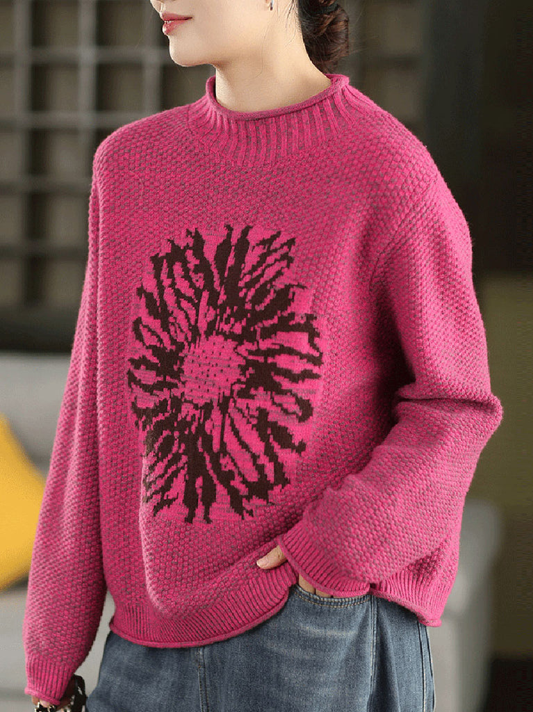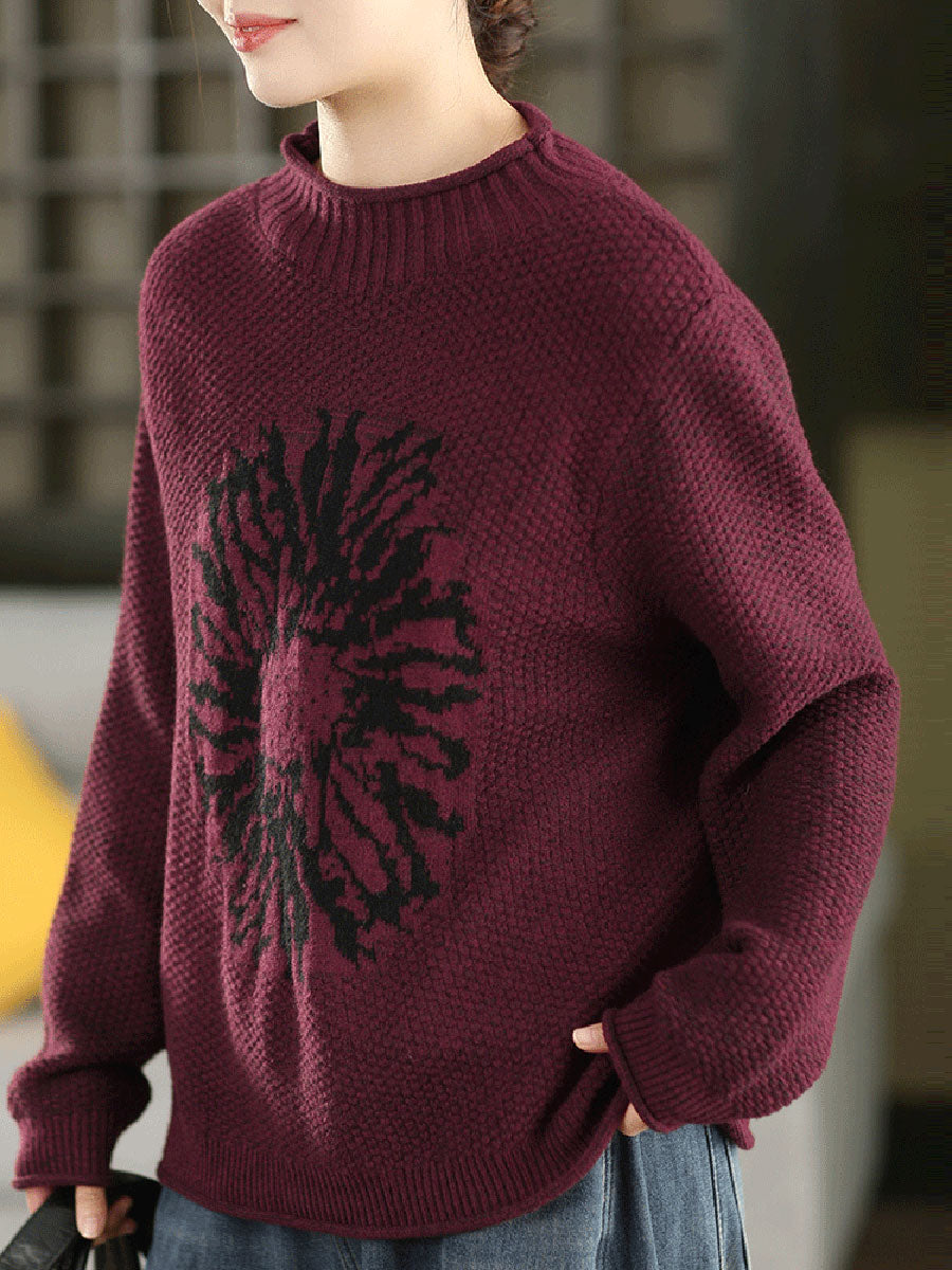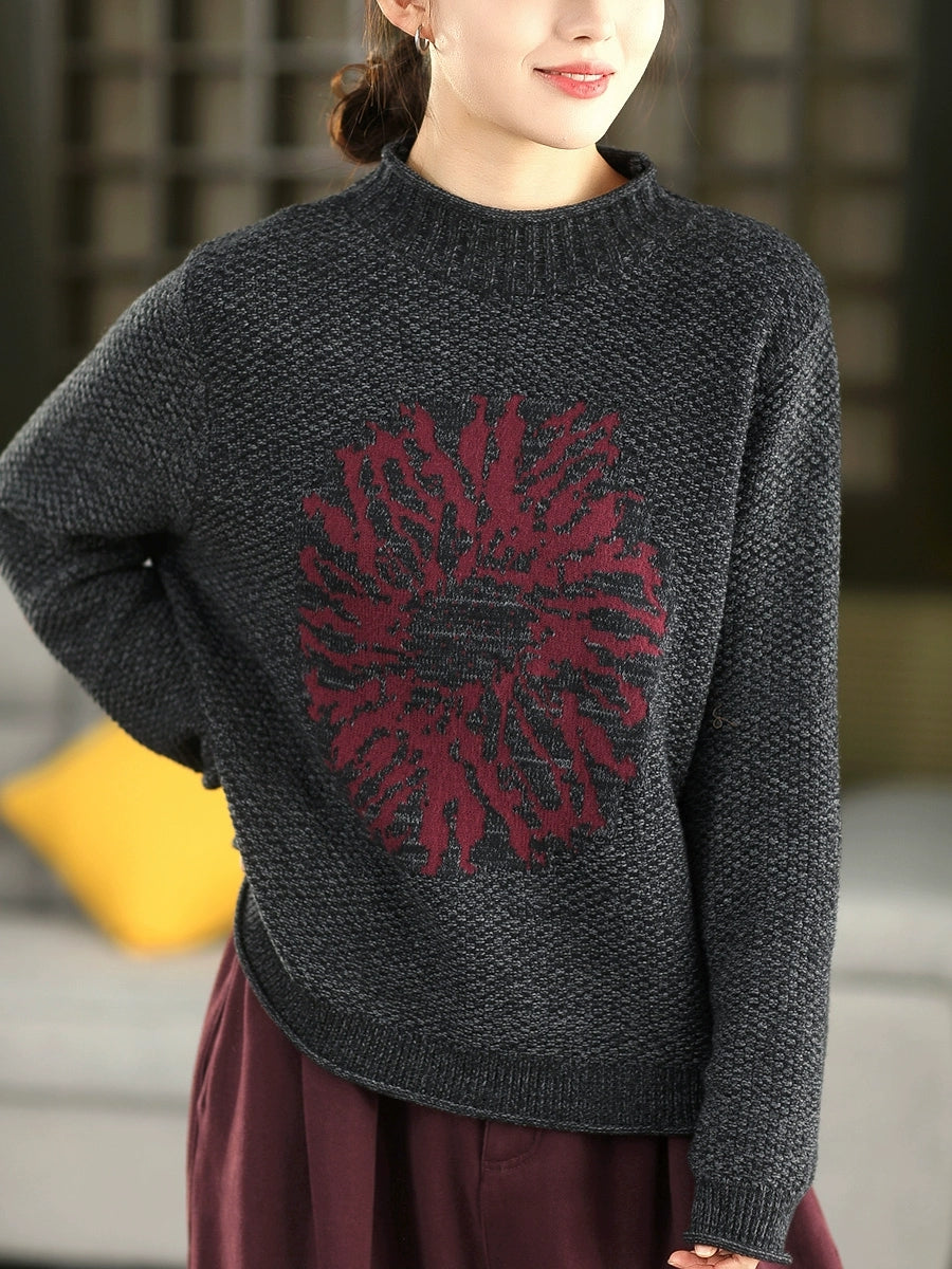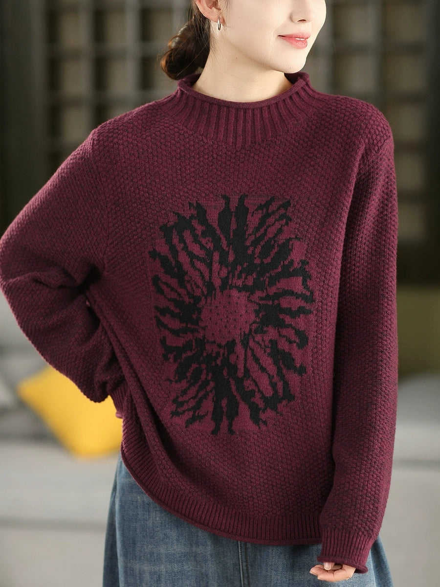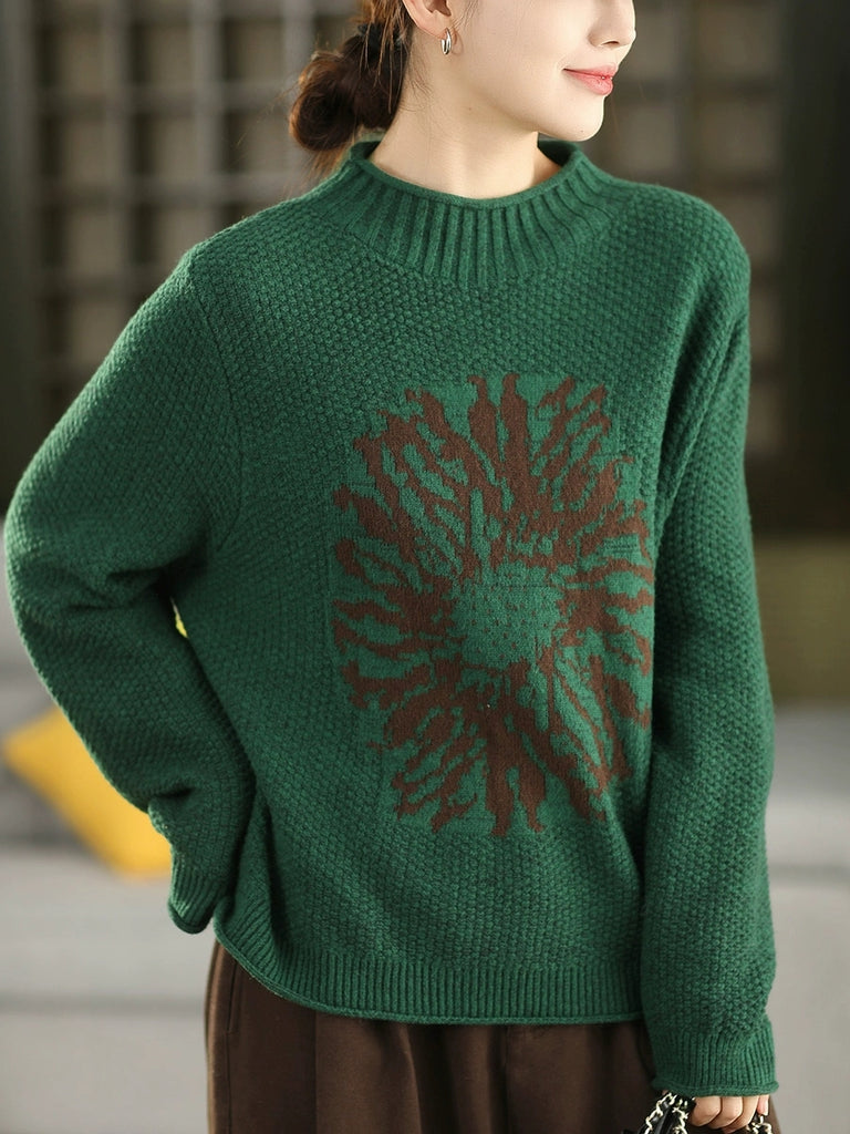 Women Autumn Artsy Flower Half-Turtleneck Sweater