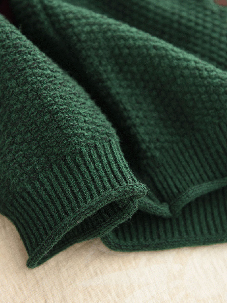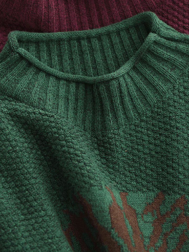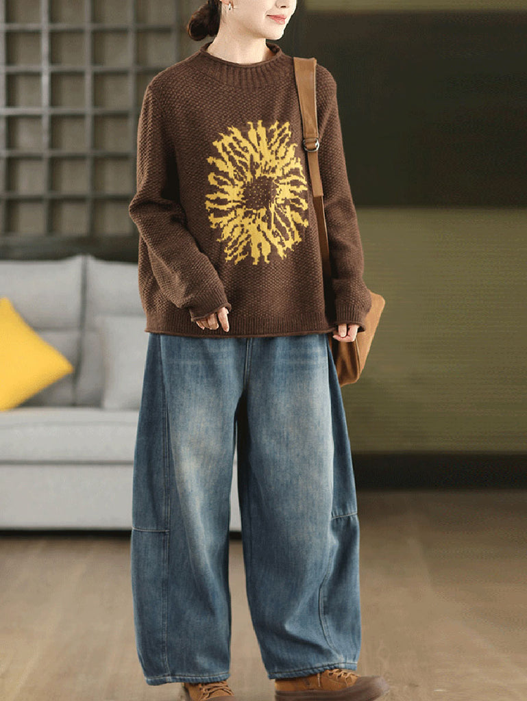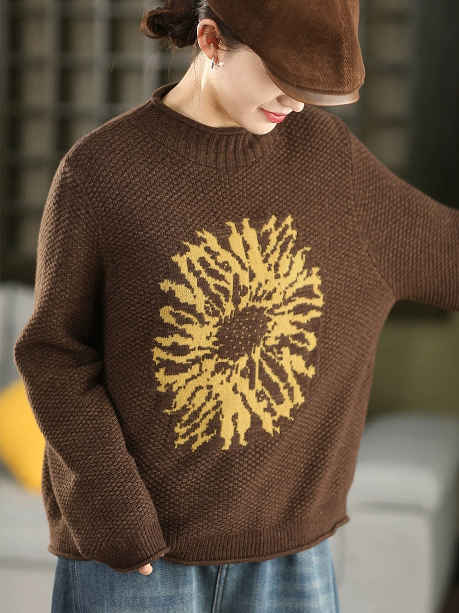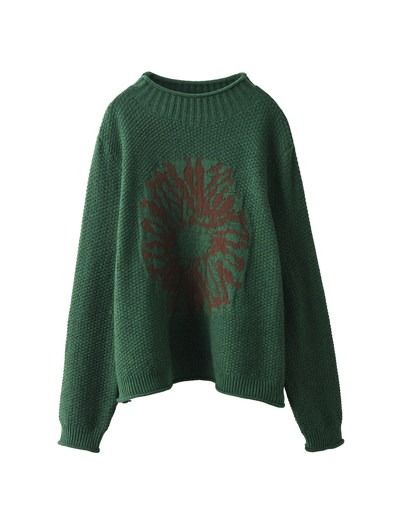 Women Autumn Artsy Flower Half-Turtleneck Sweater