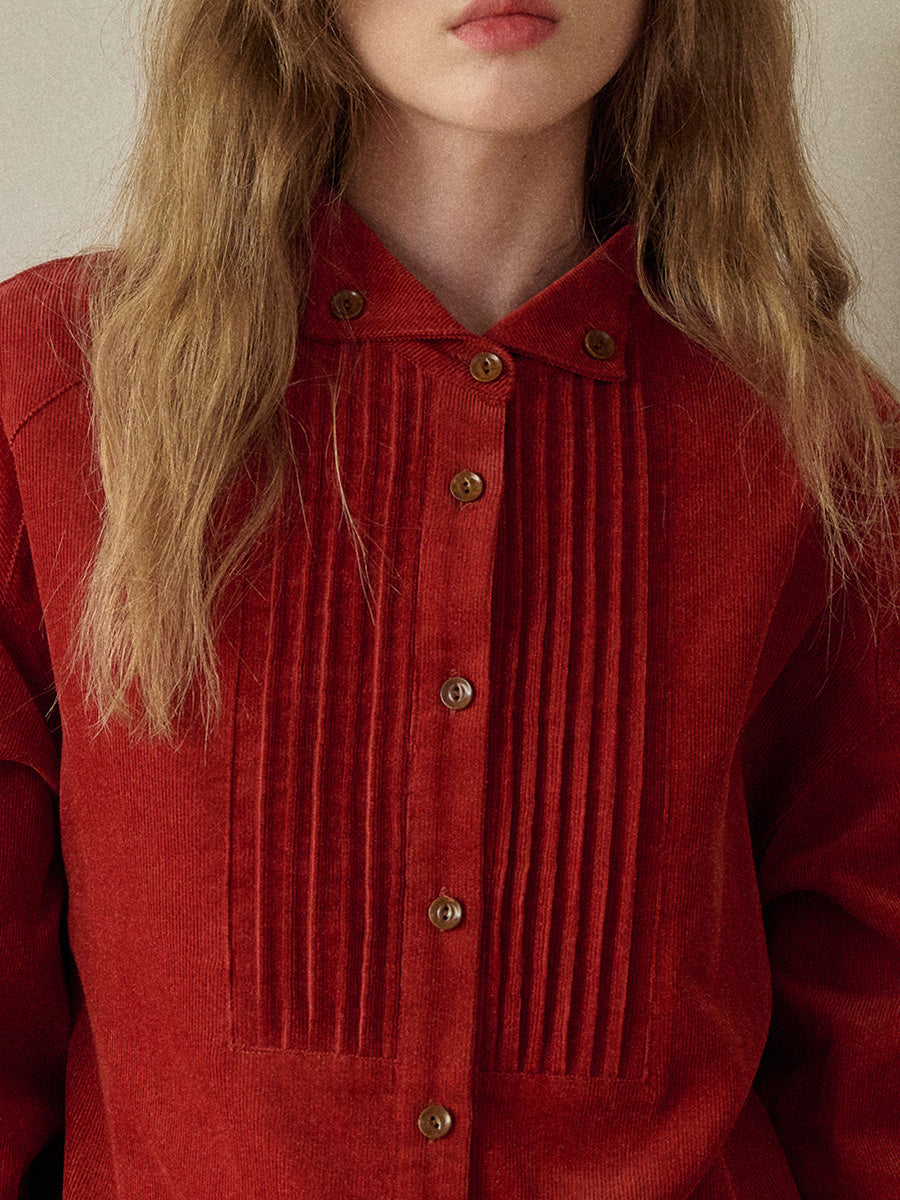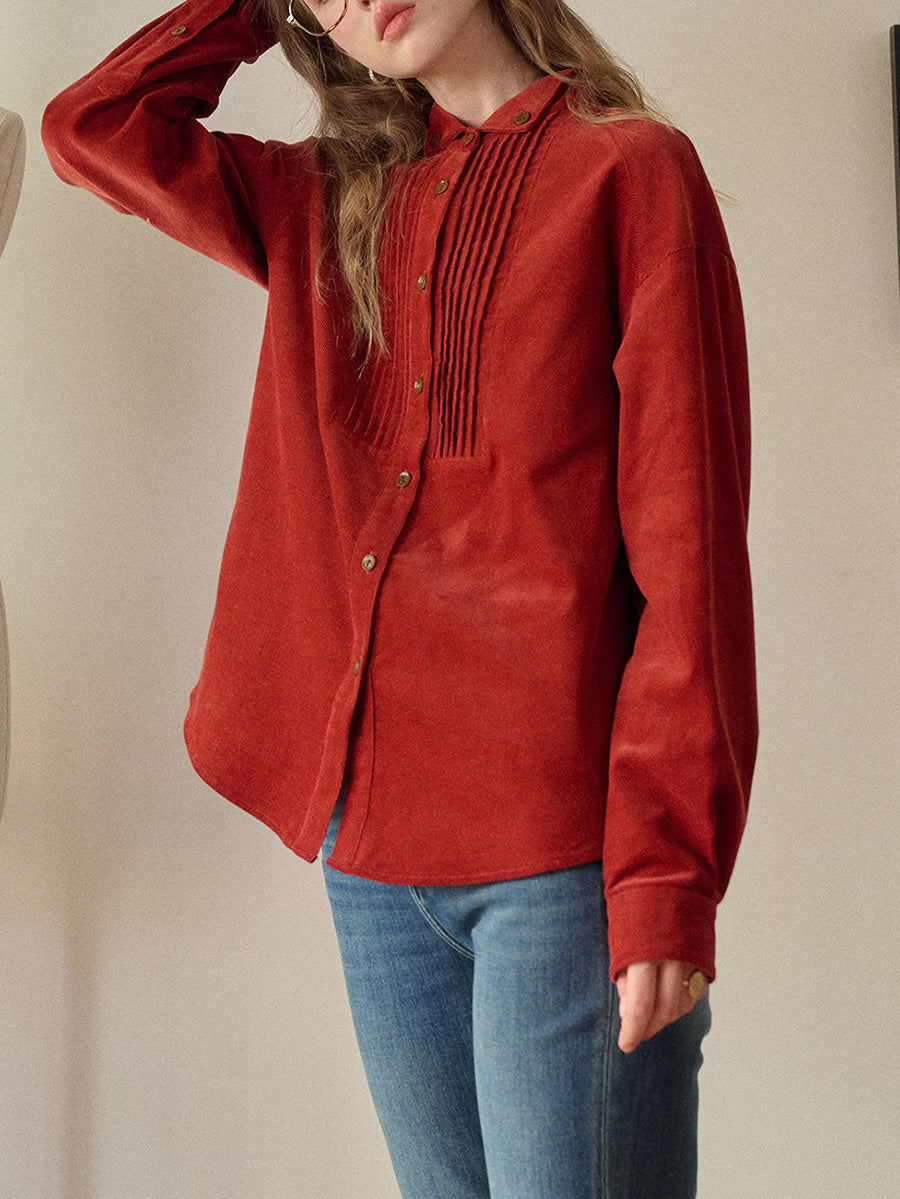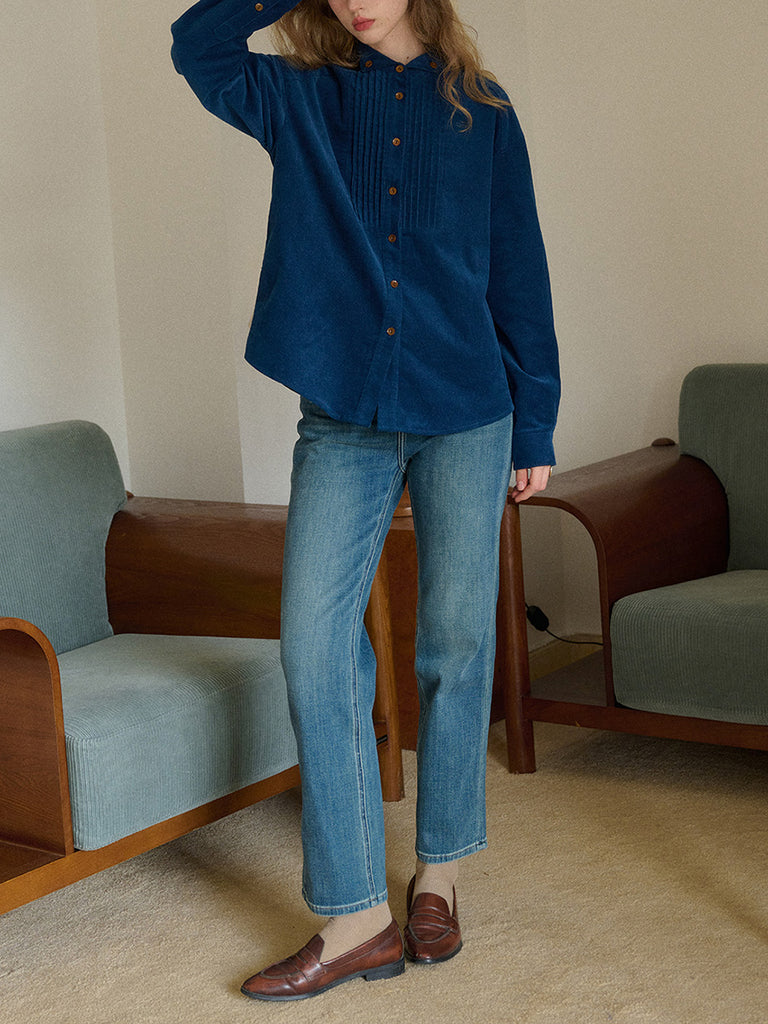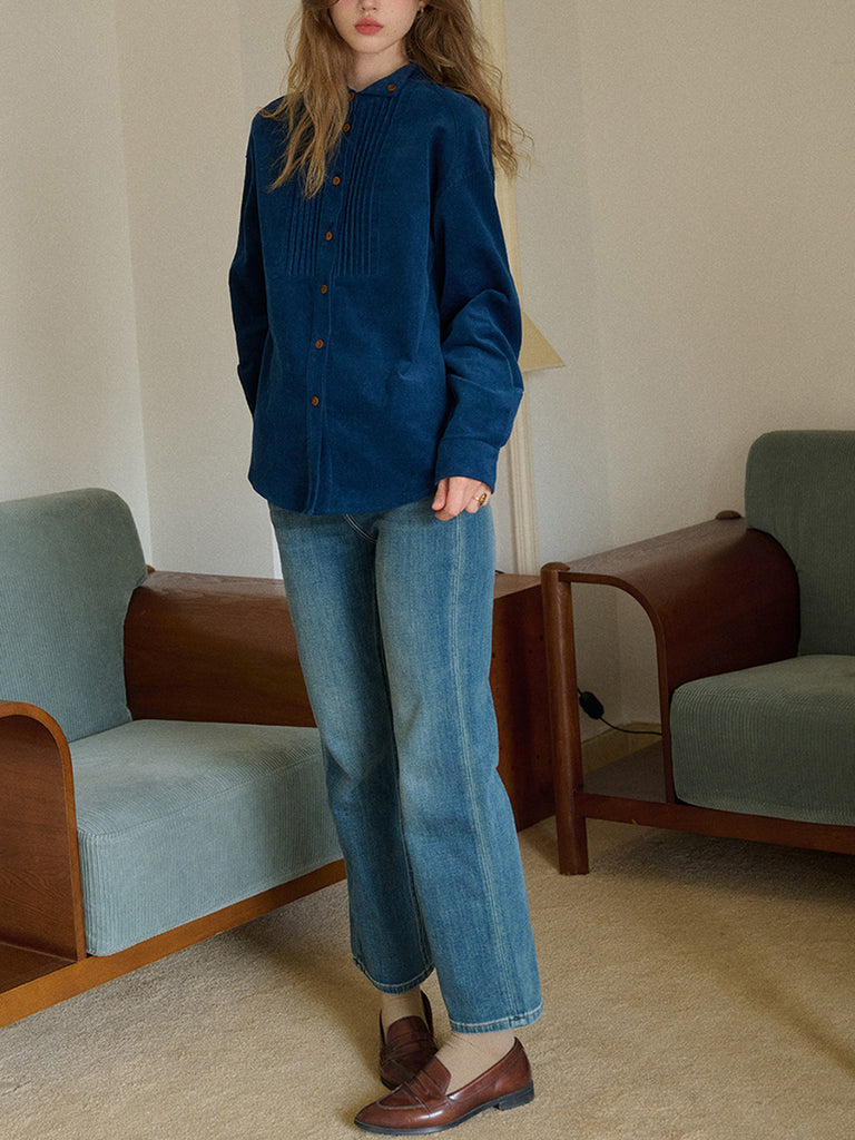 Women Artsy Winter Pure Color 100%Cotton Shirred Shirt
