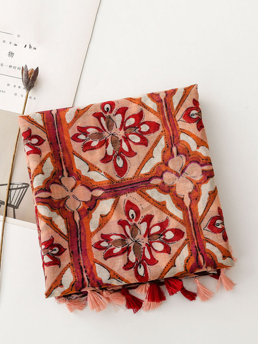 Women Ethnic Flower Spliced Tassel Shawl Scarf