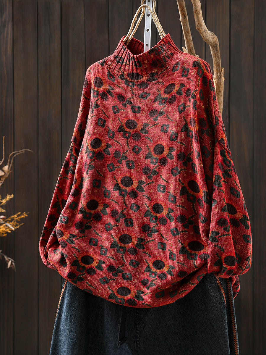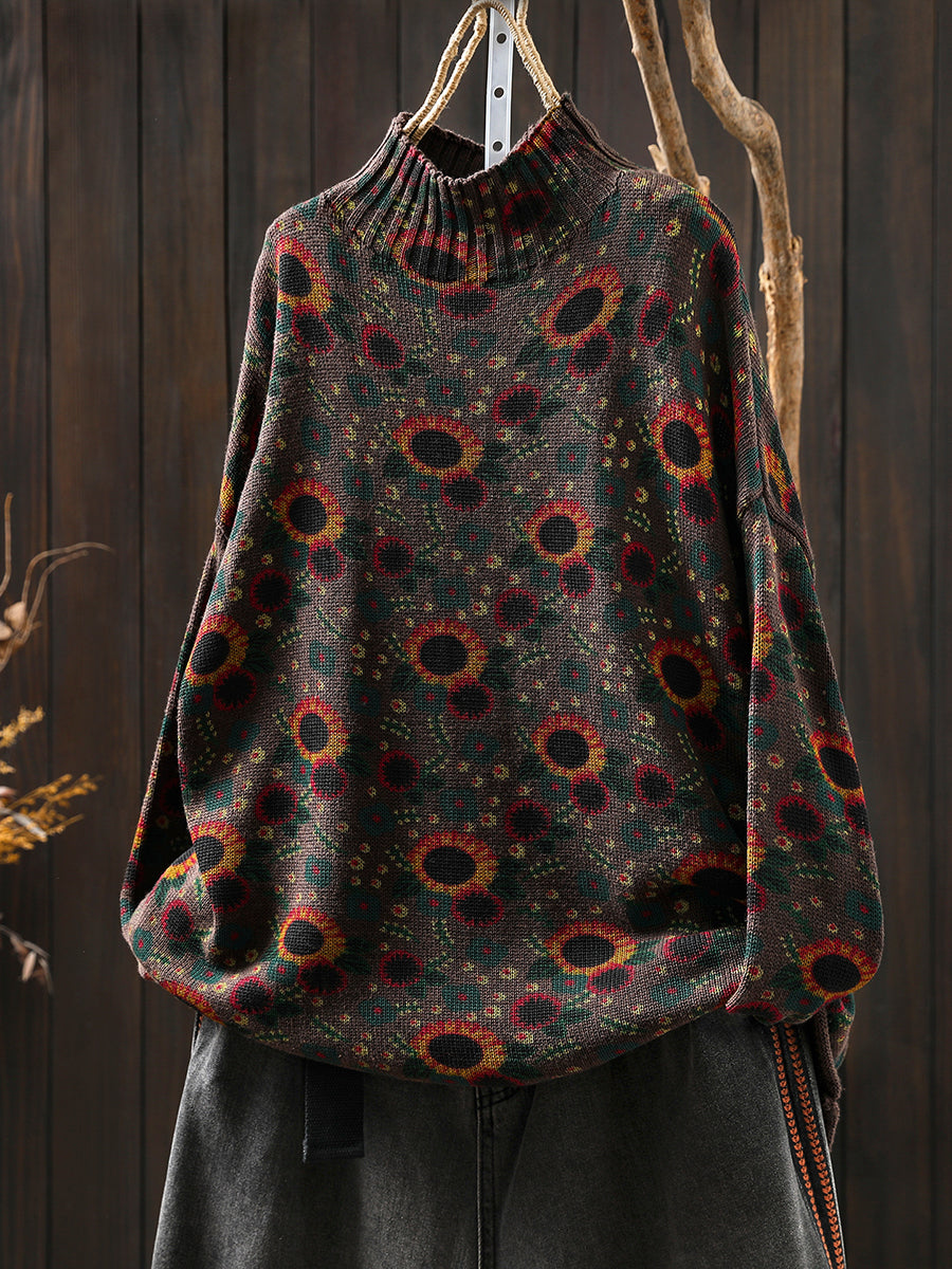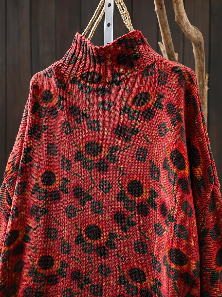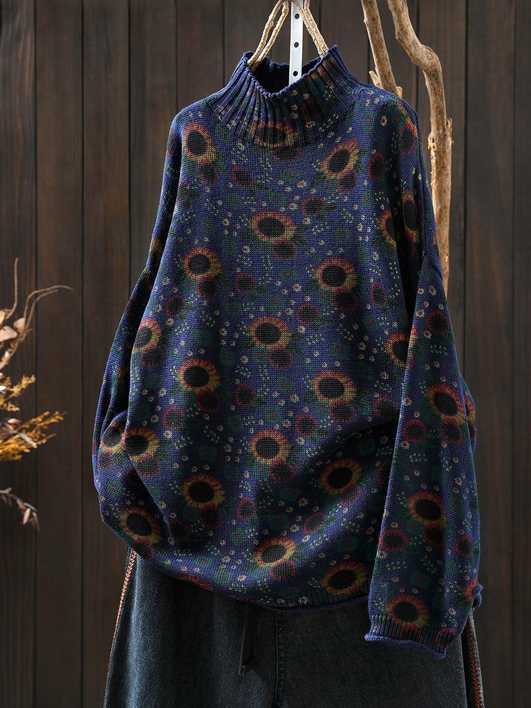 Women Autumn Artsy Sunflower Half-Turtleneck Sweater