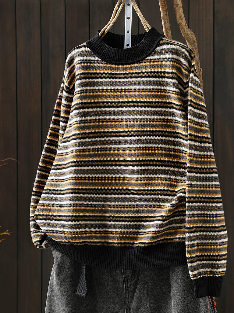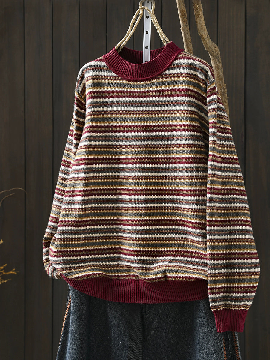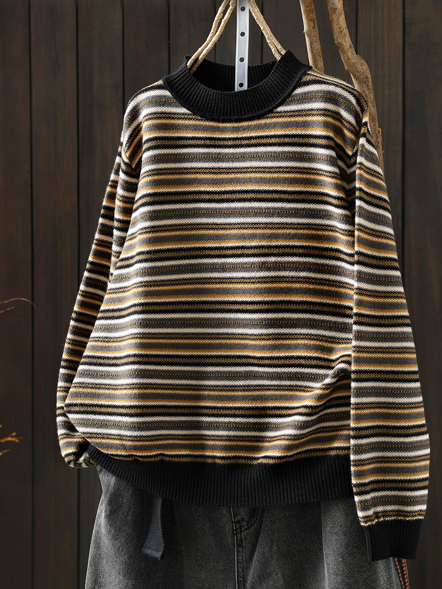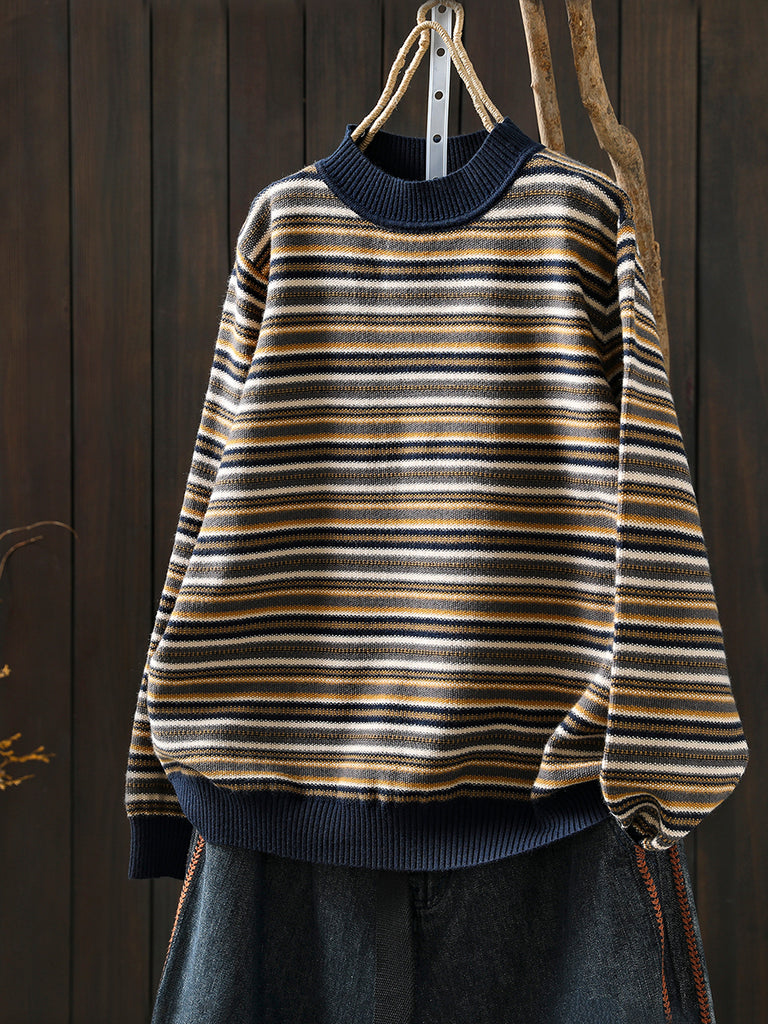 Women Autumn Artsy Stripe Half-Turtleneck Sweater