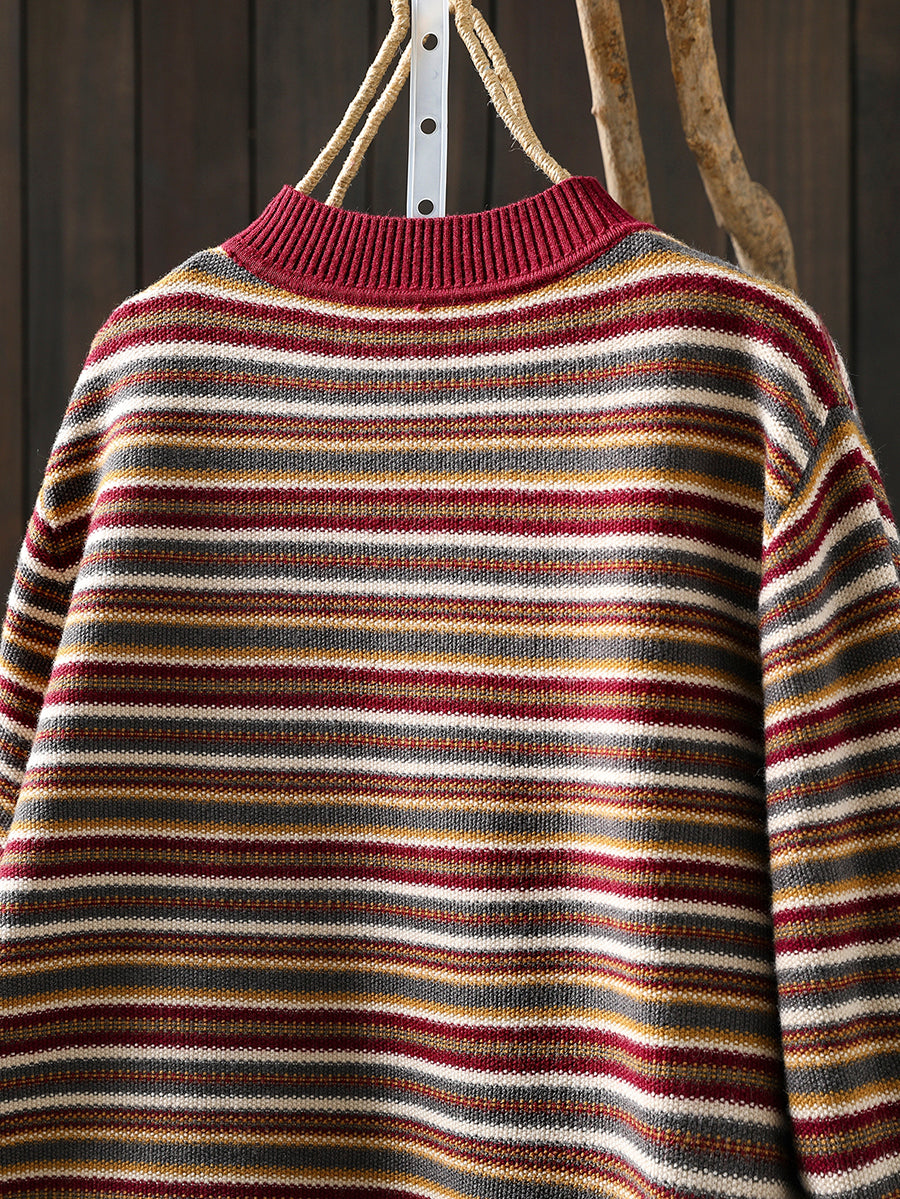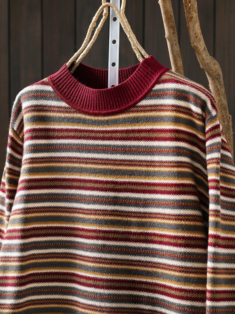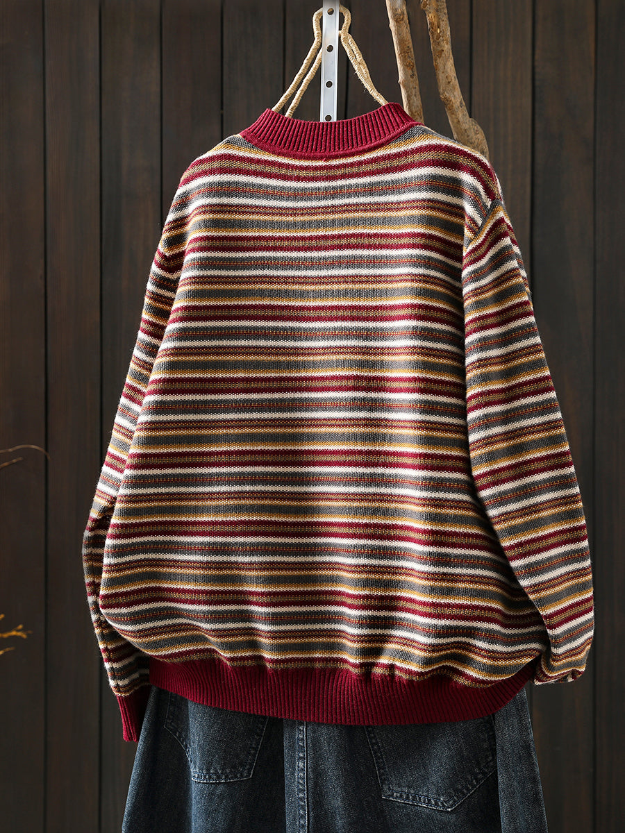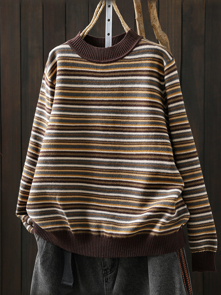 Women Autumn Artsy Stripe Half-Turtleneck Sweater