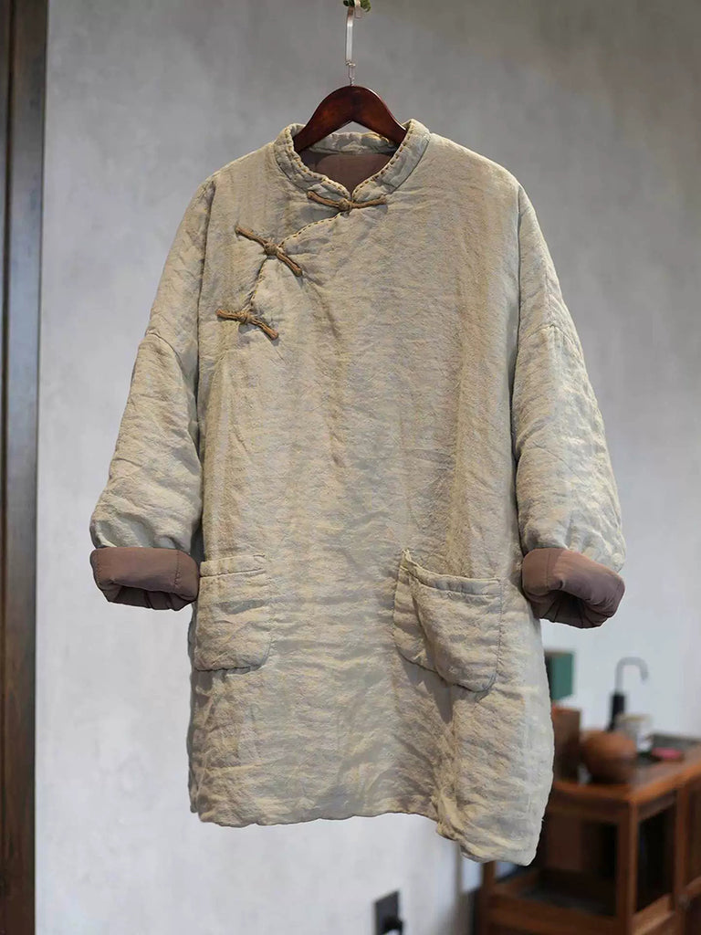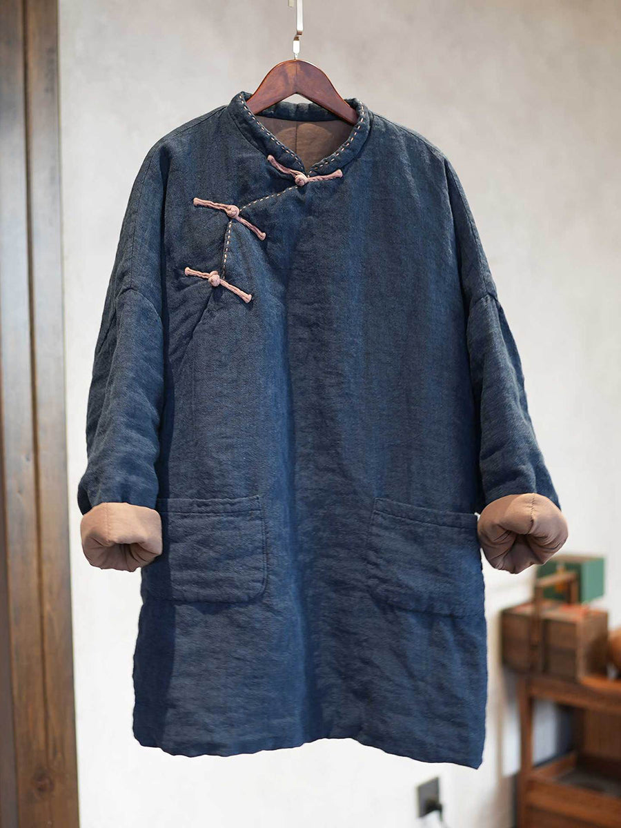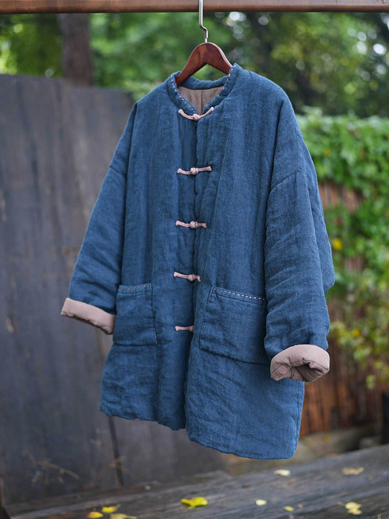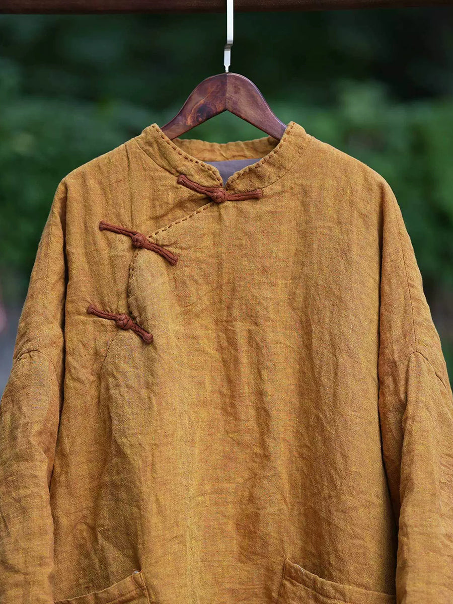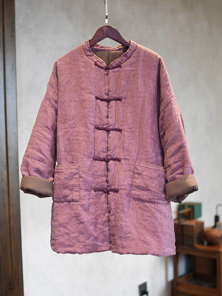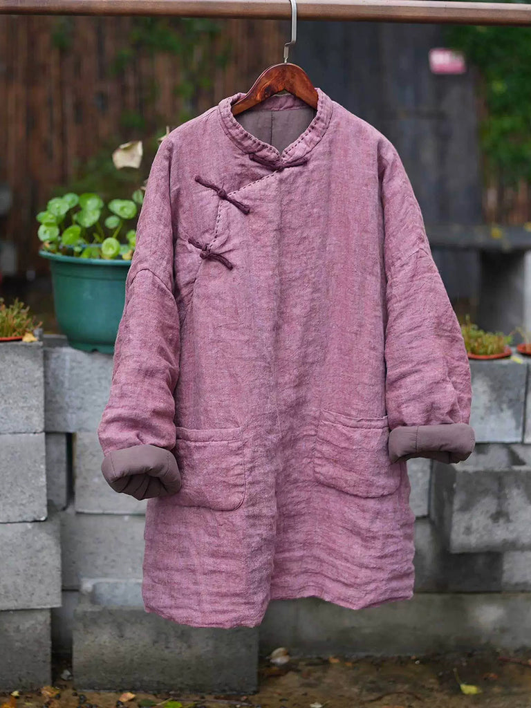 Women Winter Ethnic Pure Color Stand Collar Linen Padded Coat
