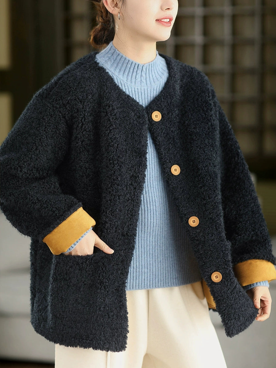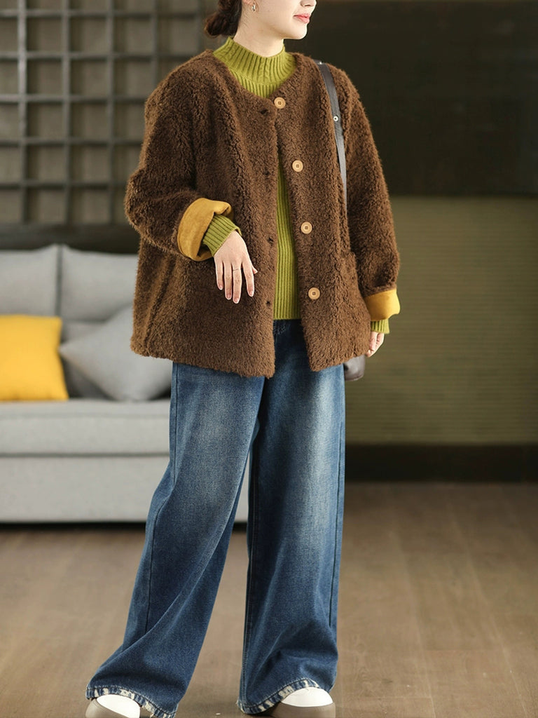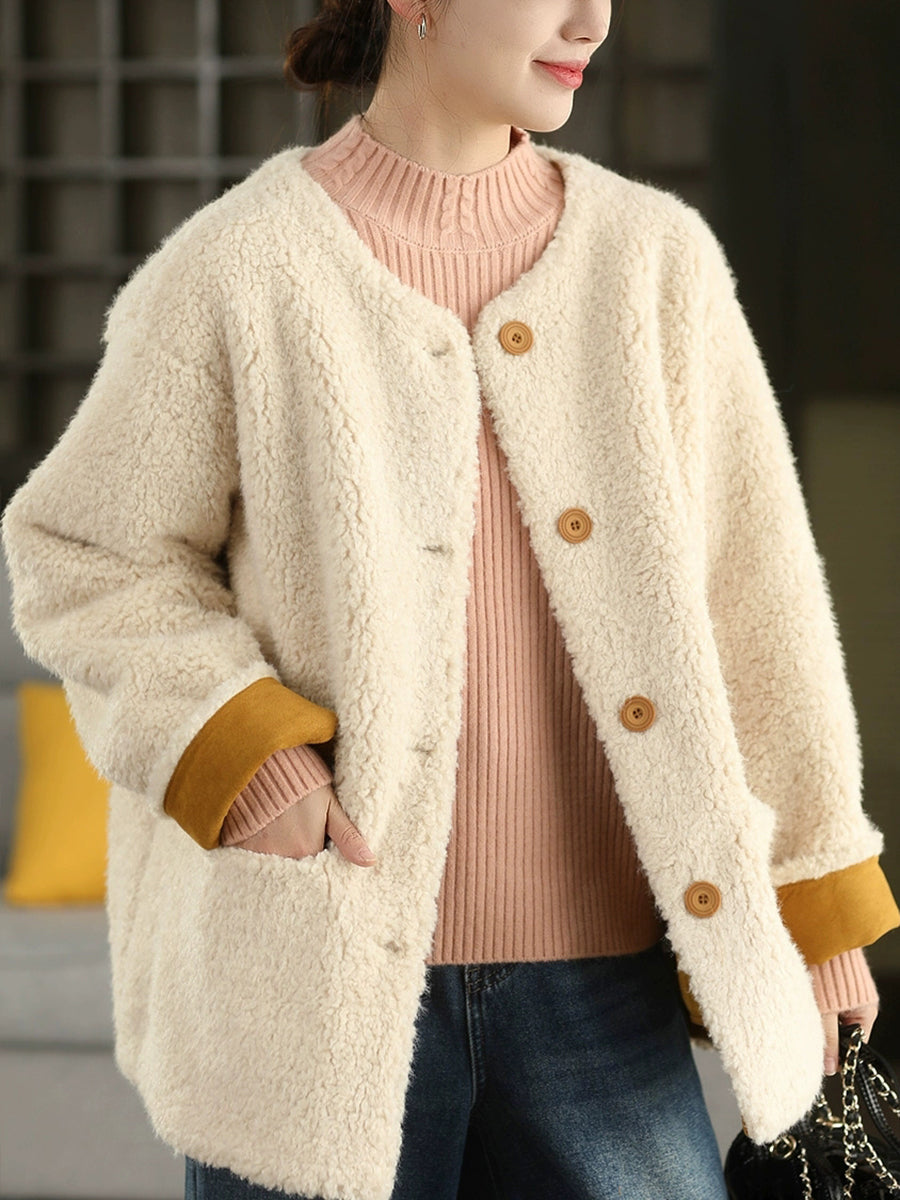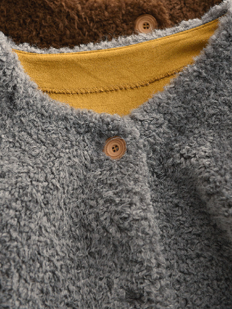 Women Winter Retro Pure Color Fleece O-Neck Coat