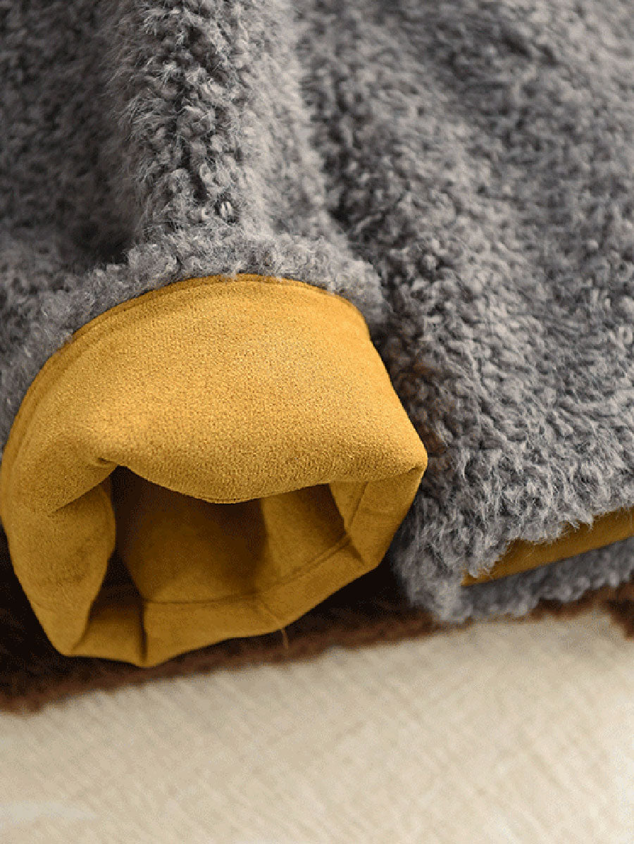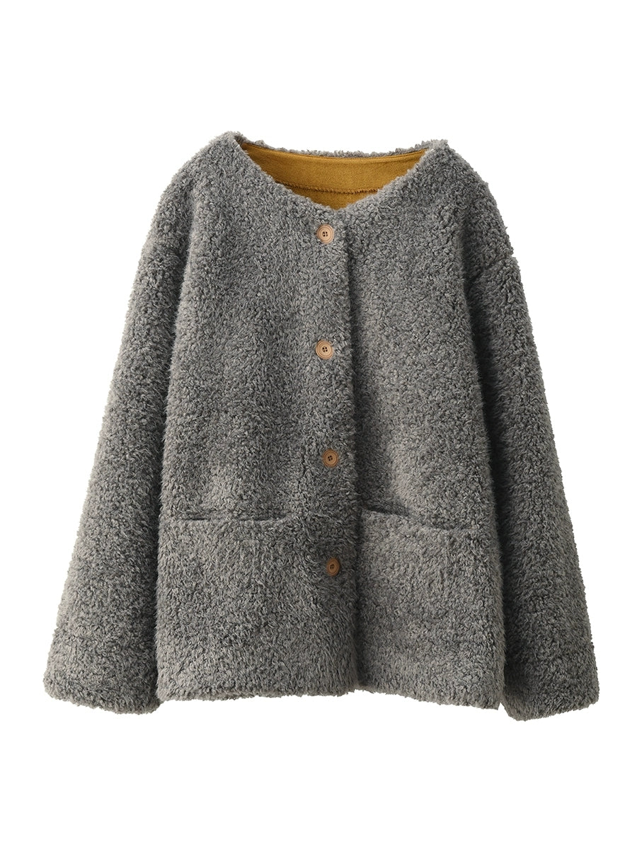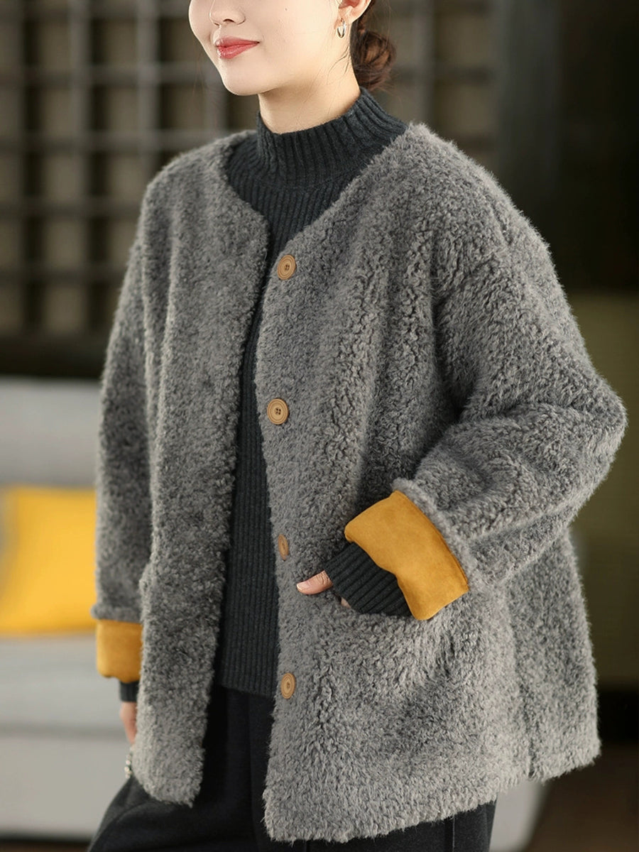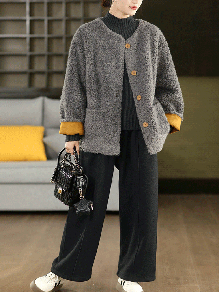 Women Winter Retro Pure Color Fleece O-Neck Coat