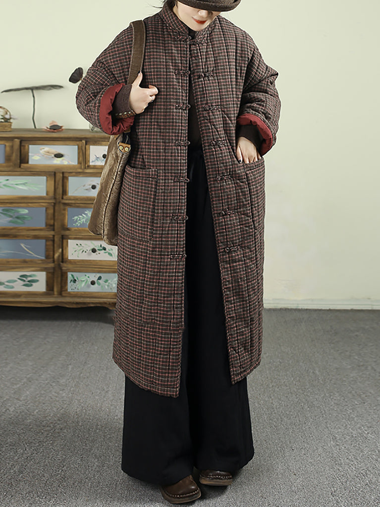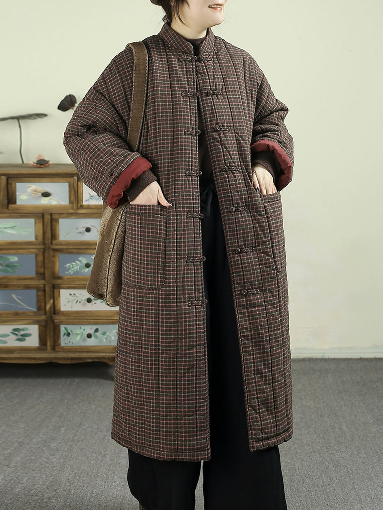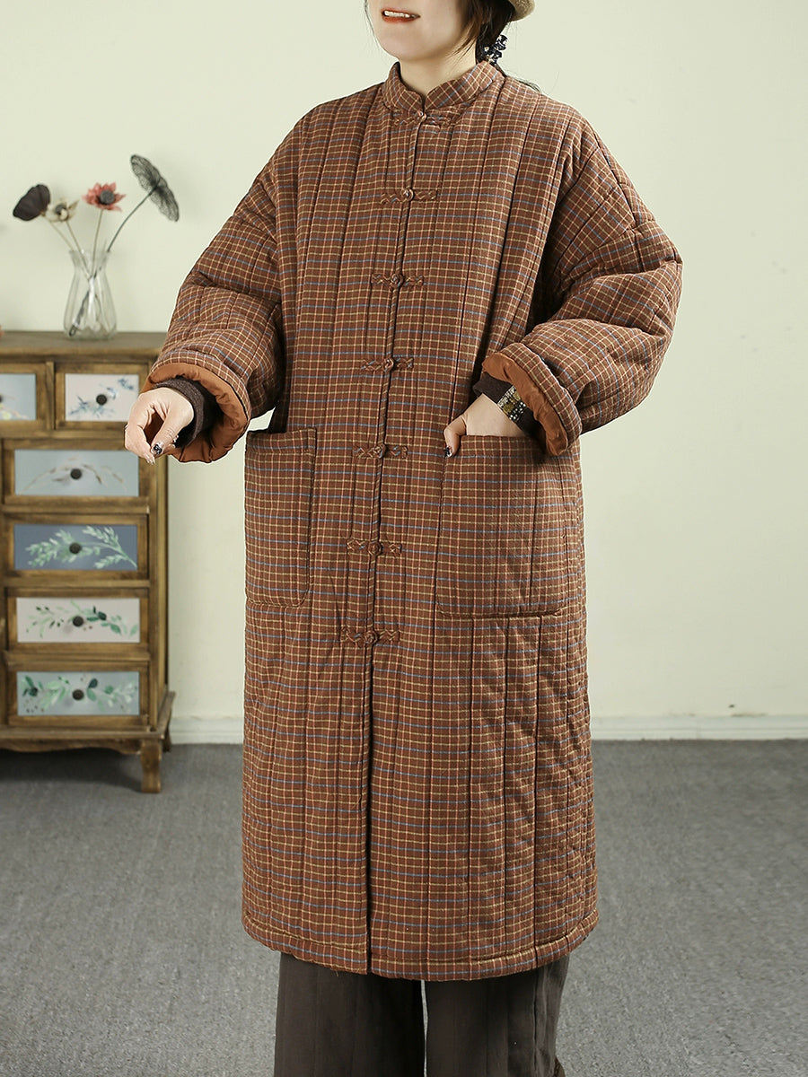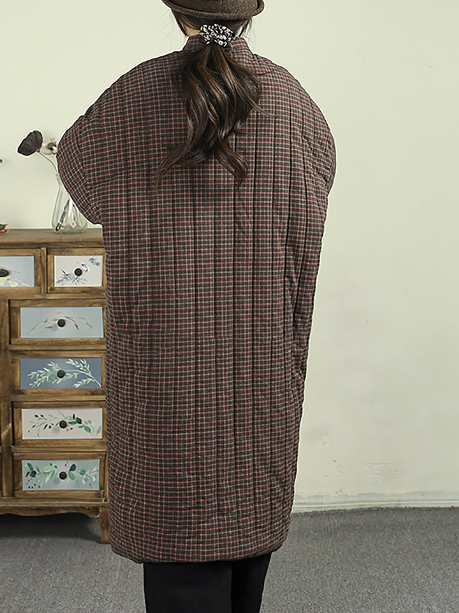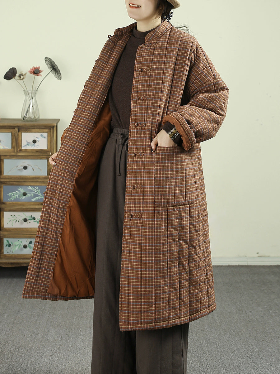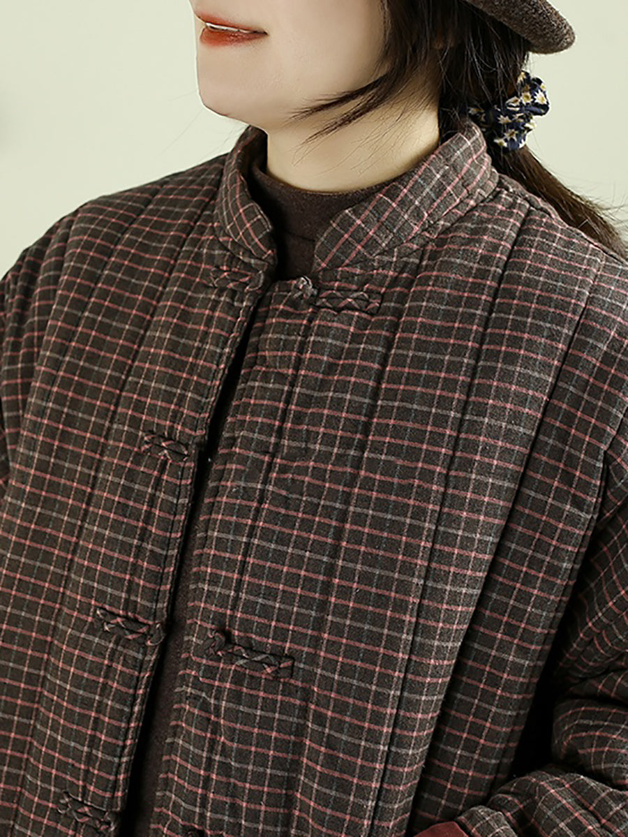 Women Winter Retro Plaid Stand Collar Padded Coat