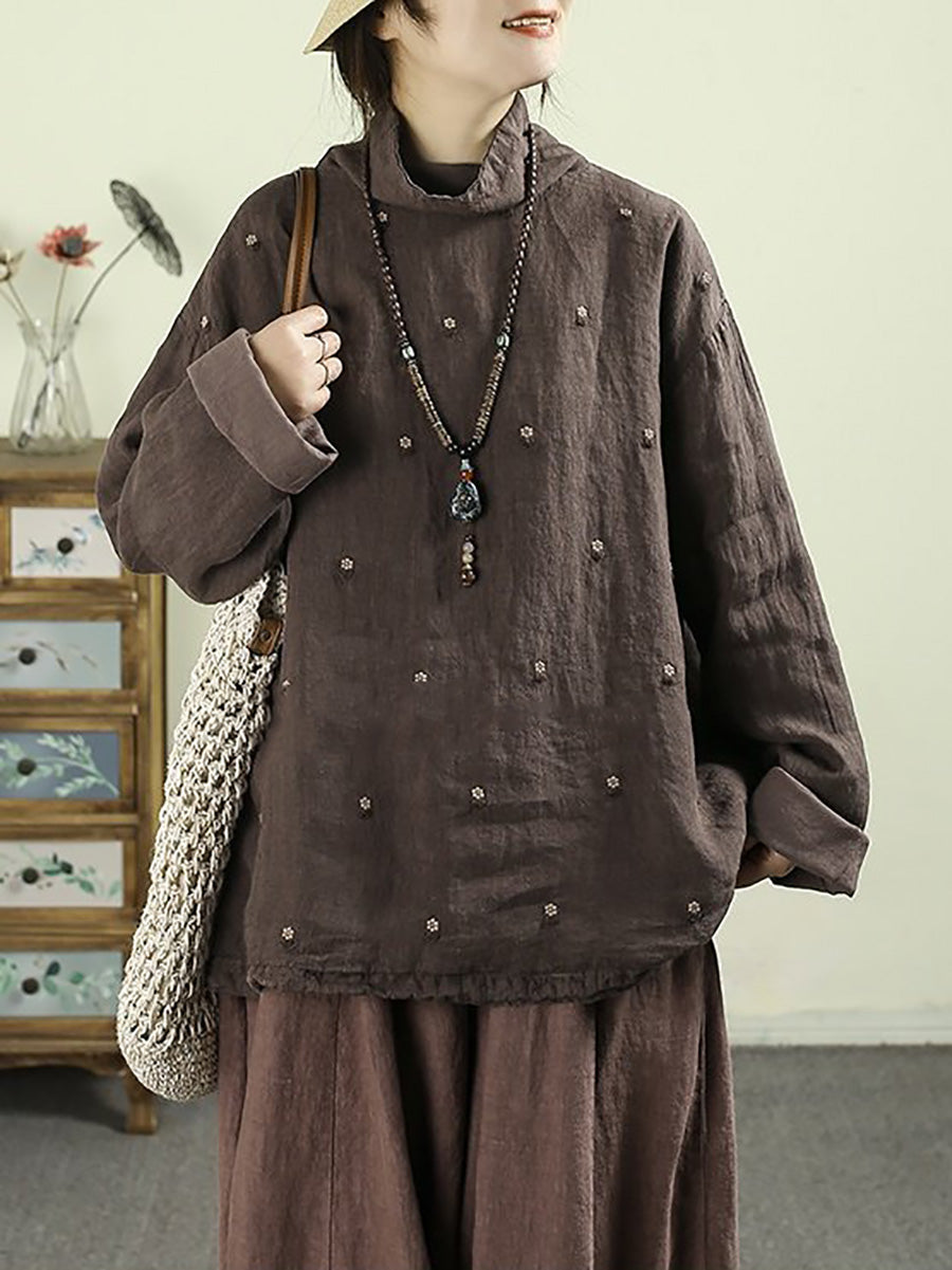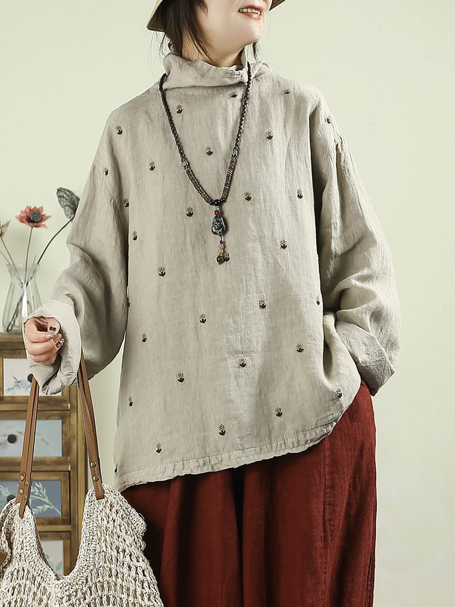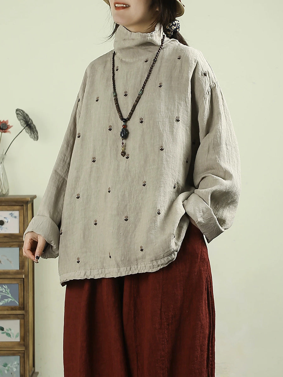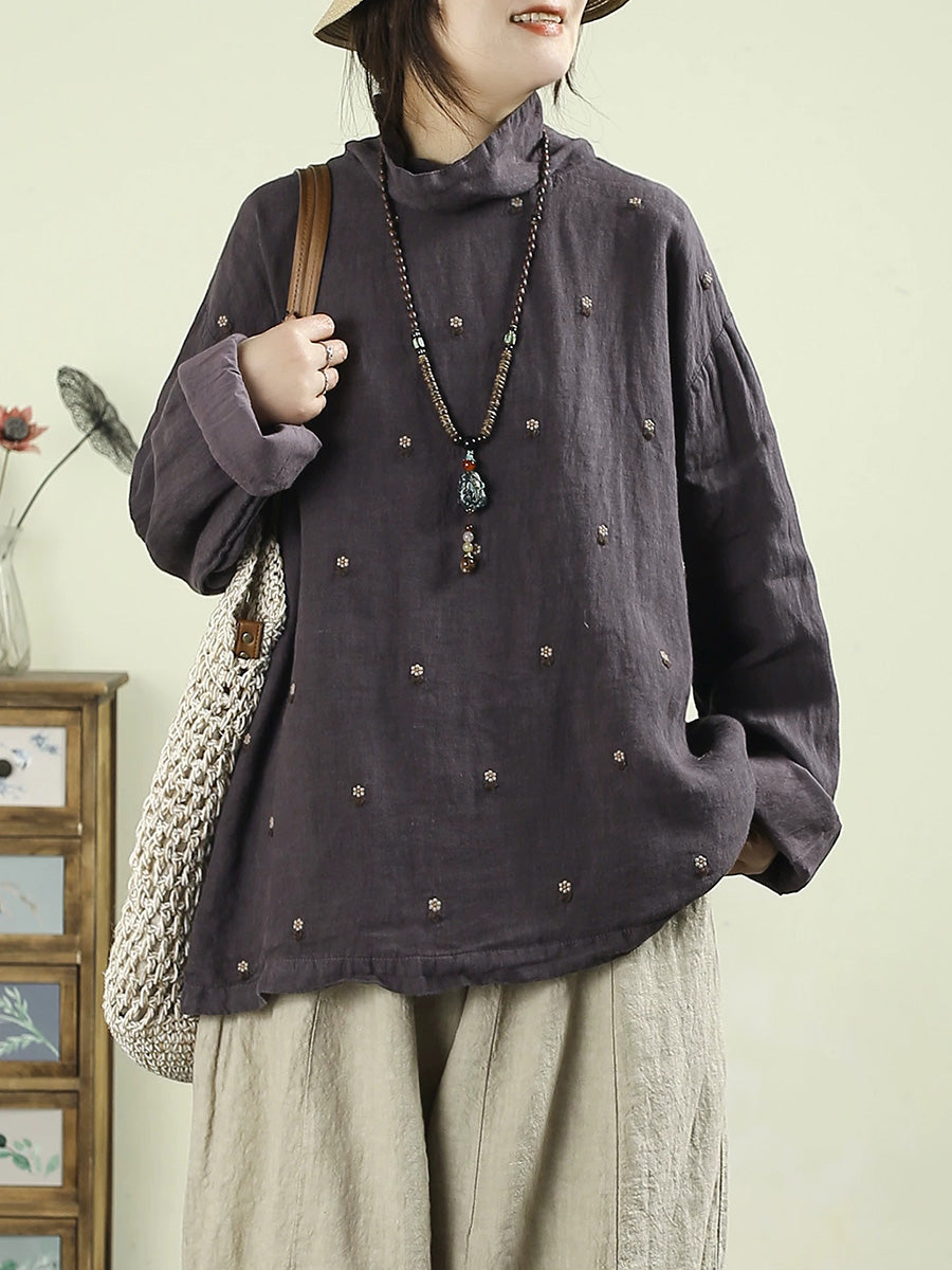 Women Spring Floral Embroidery 100%Linen Turtleneck Blouse