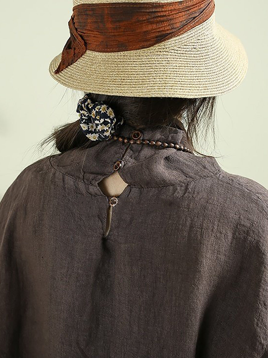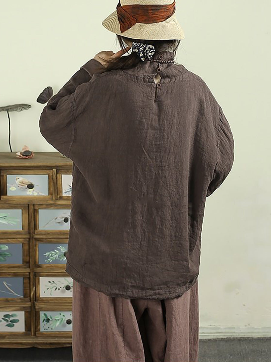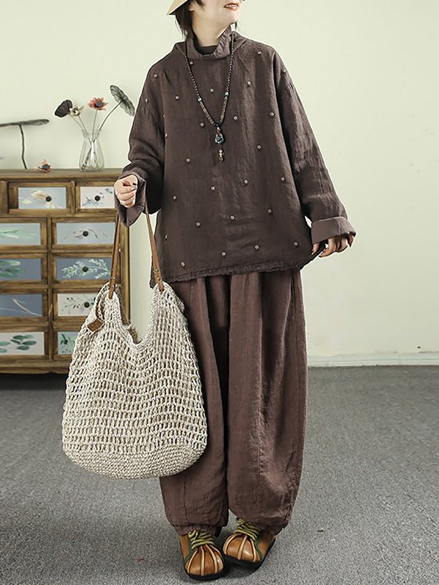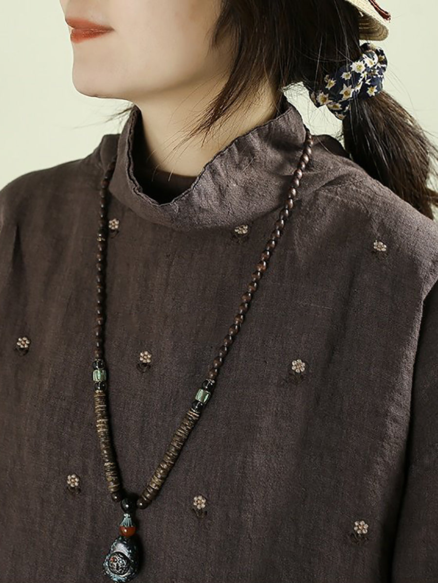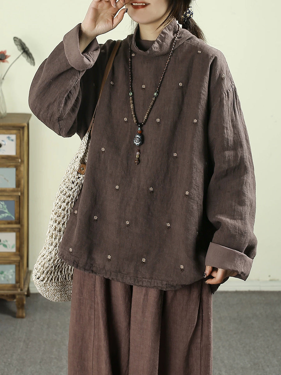 Women Spring Floral Embroidery 100%Linen Turtleneck Blouse
