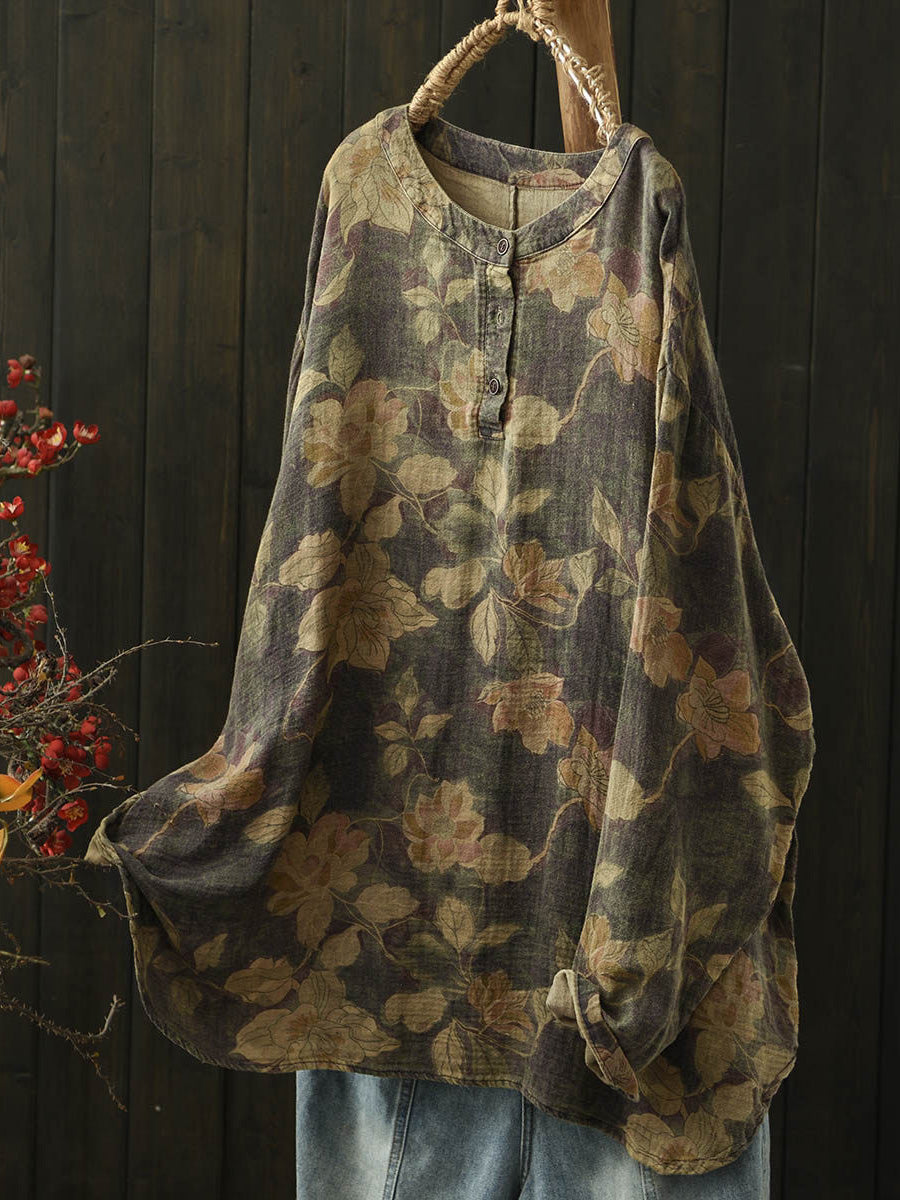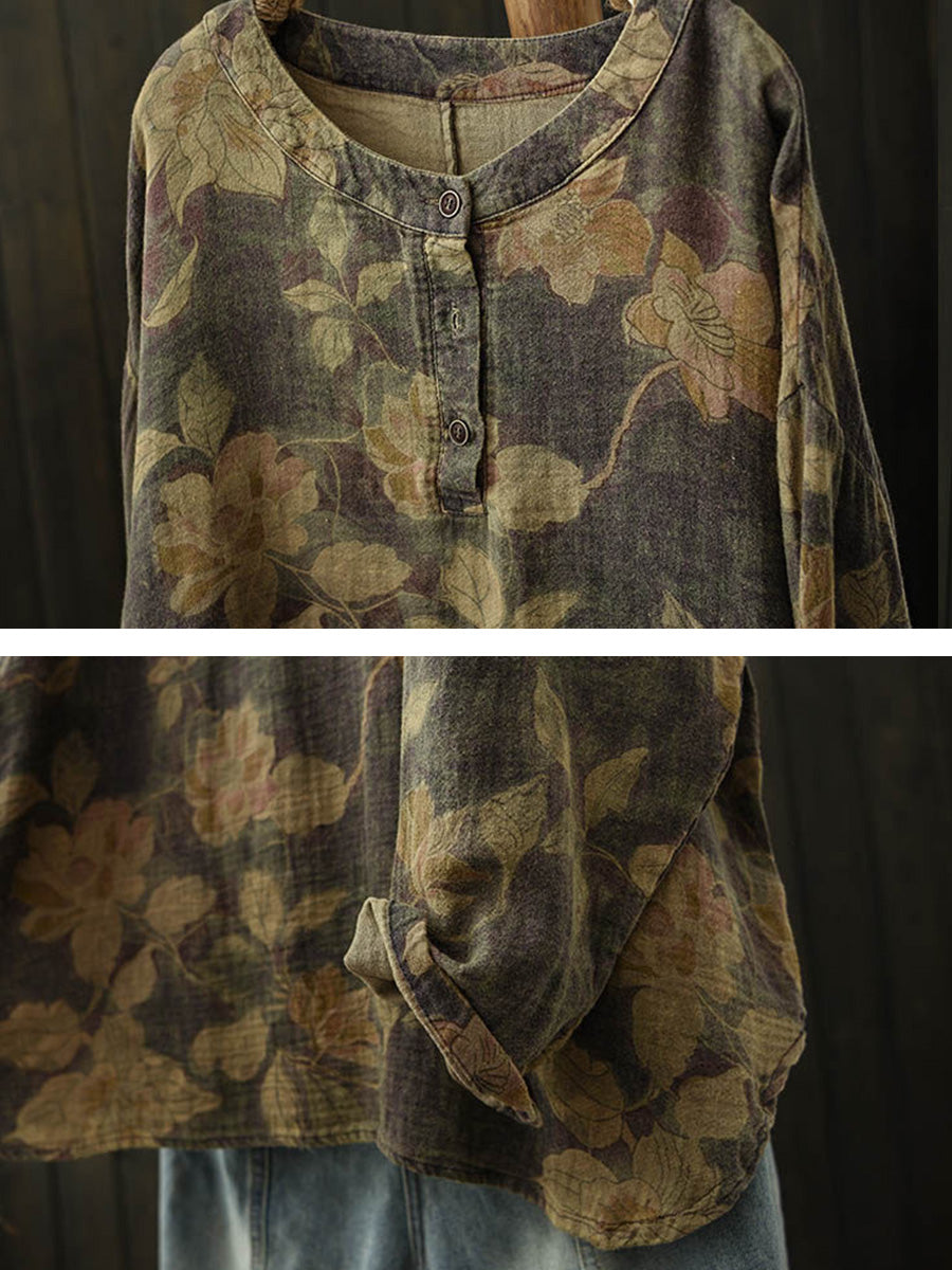 Women Vintage Spring Flower O-Neck Cotton Blouse