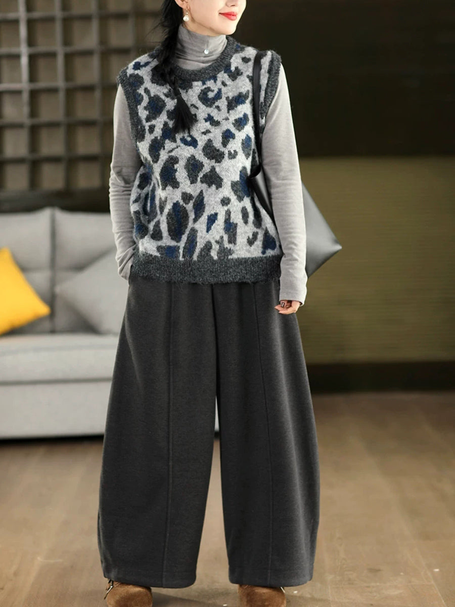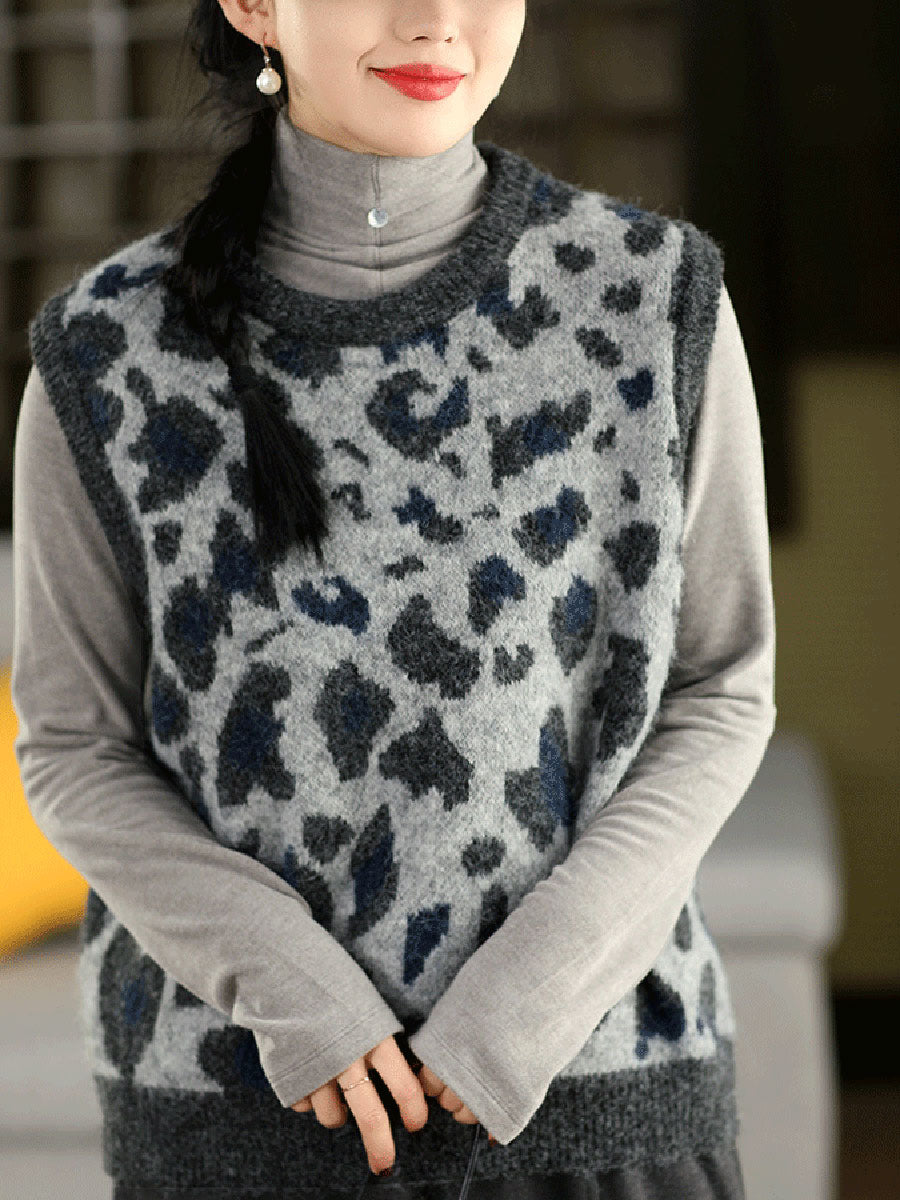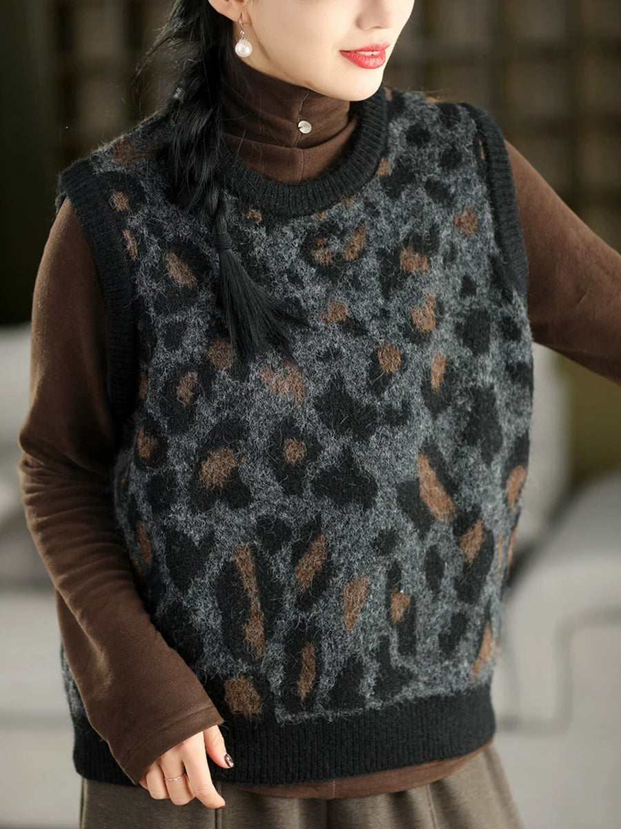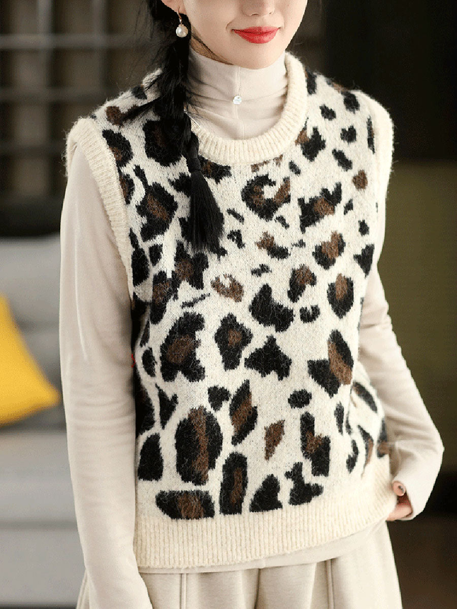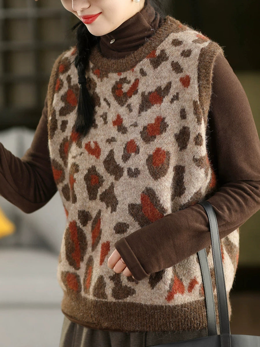 Women Spring Fashion Leopard Jacquard O-Neck Knitted Vest