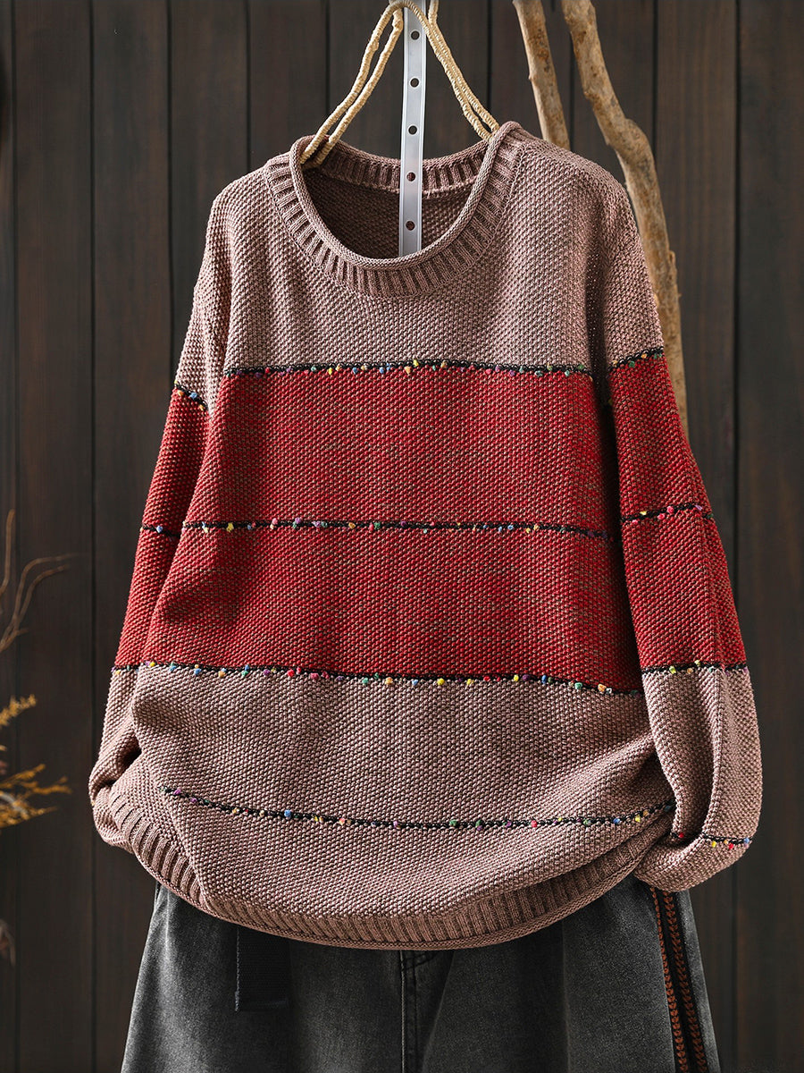 Women Spring Retro Colorblock O-Neck Sweater