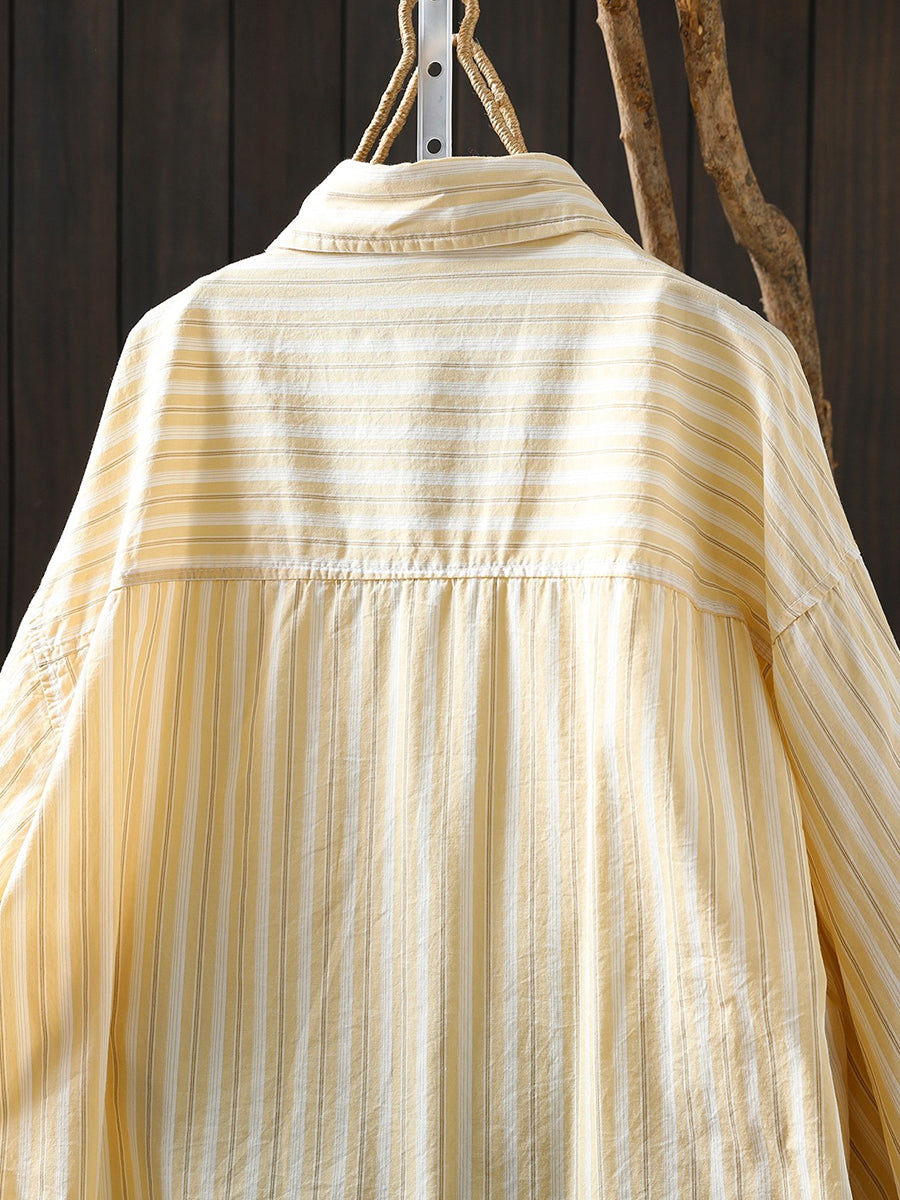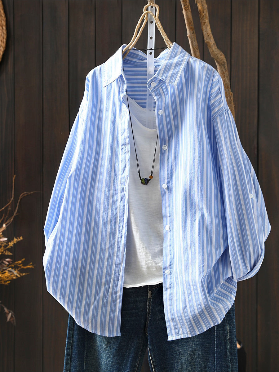 Women Spring Artsy Stripe 100%Cotton Turn-down Collar Shirt