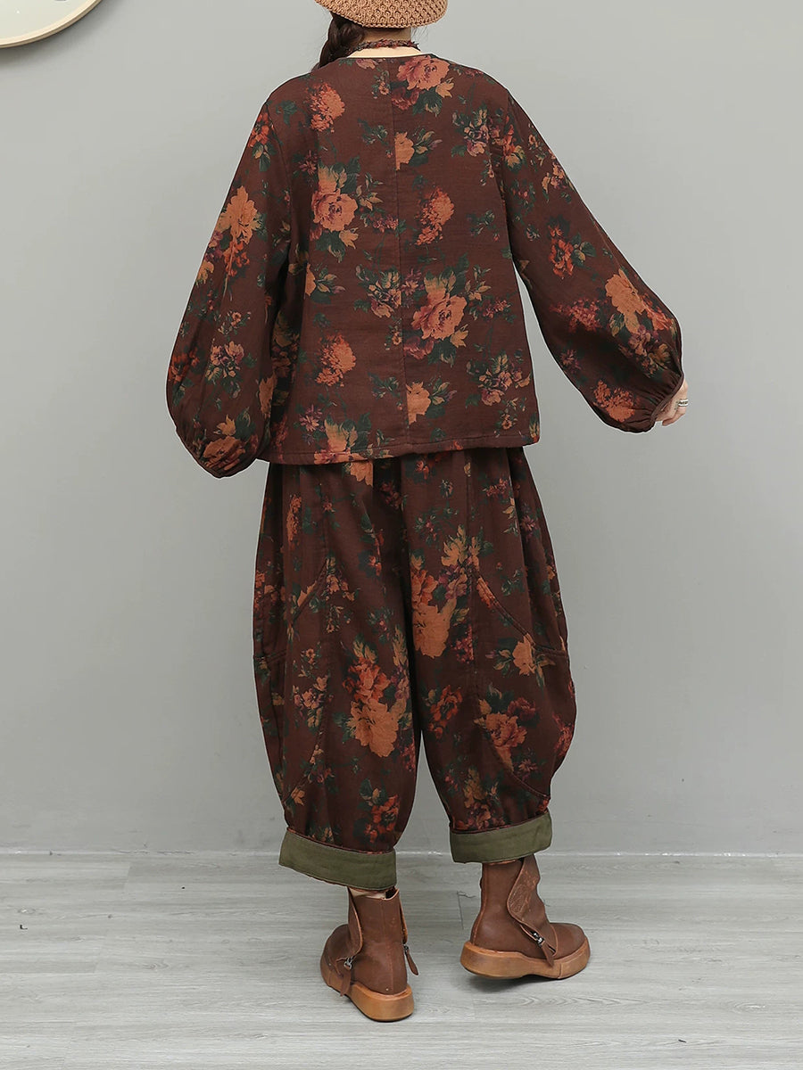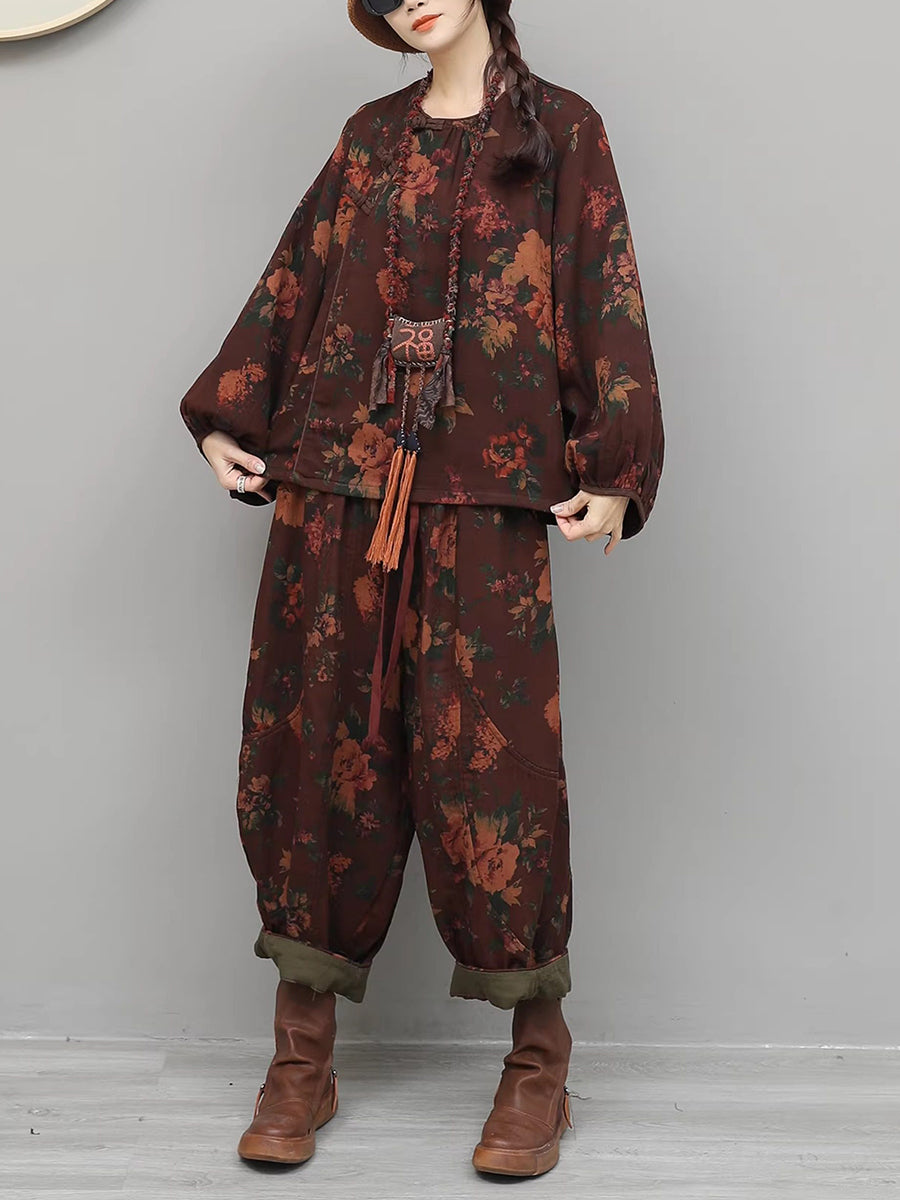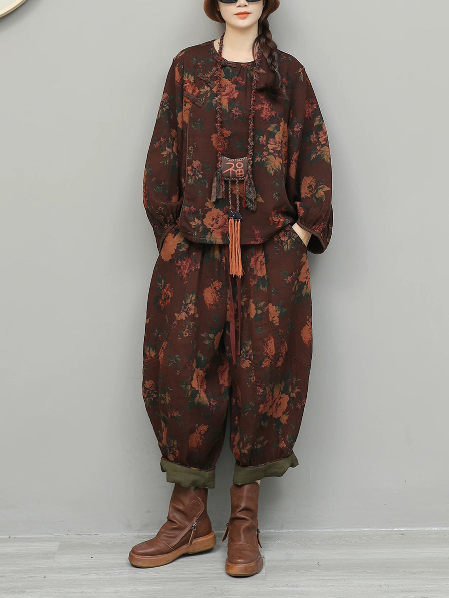 Women Spring Ethnic Flower Spliced O-Neck Suits