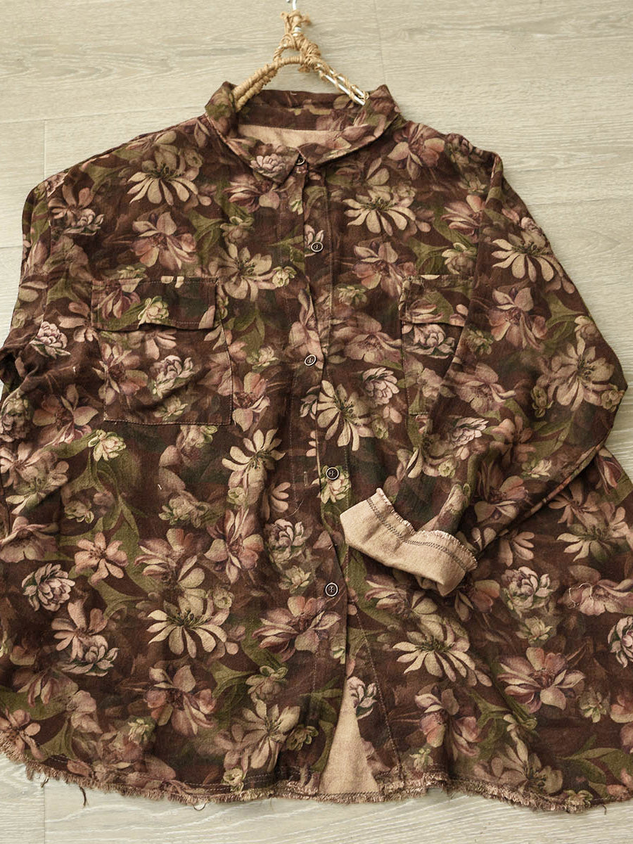 Women Winter Artsy Floral Turn-down Collar Cotton Shirt