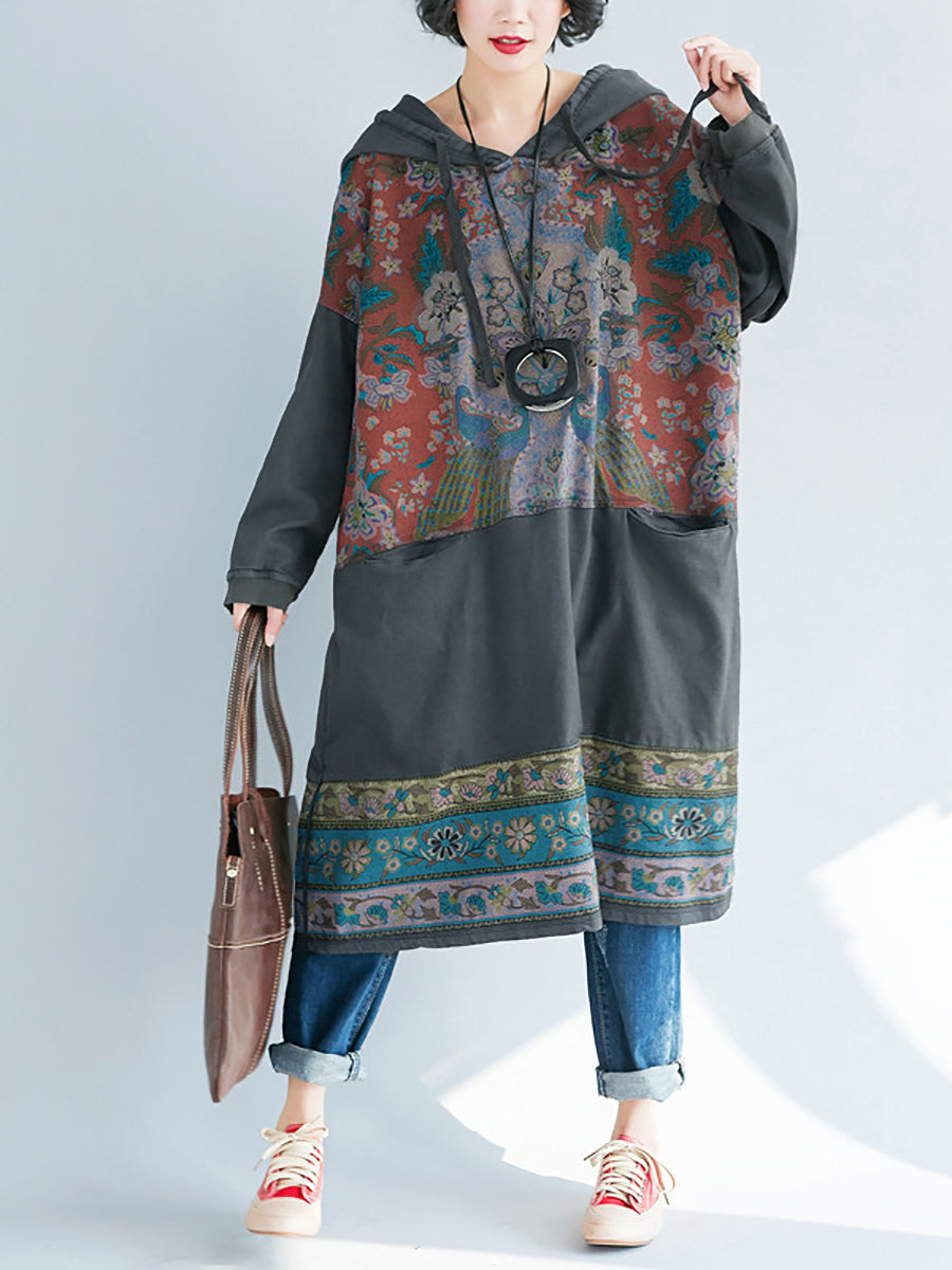 Women Ethnic Flower Spliced Long Pocket Hooded Dress