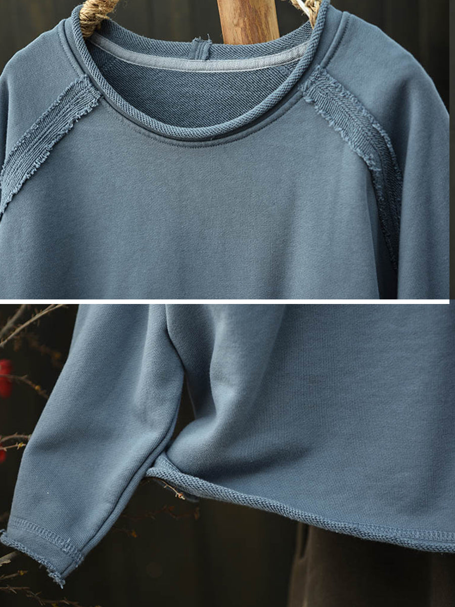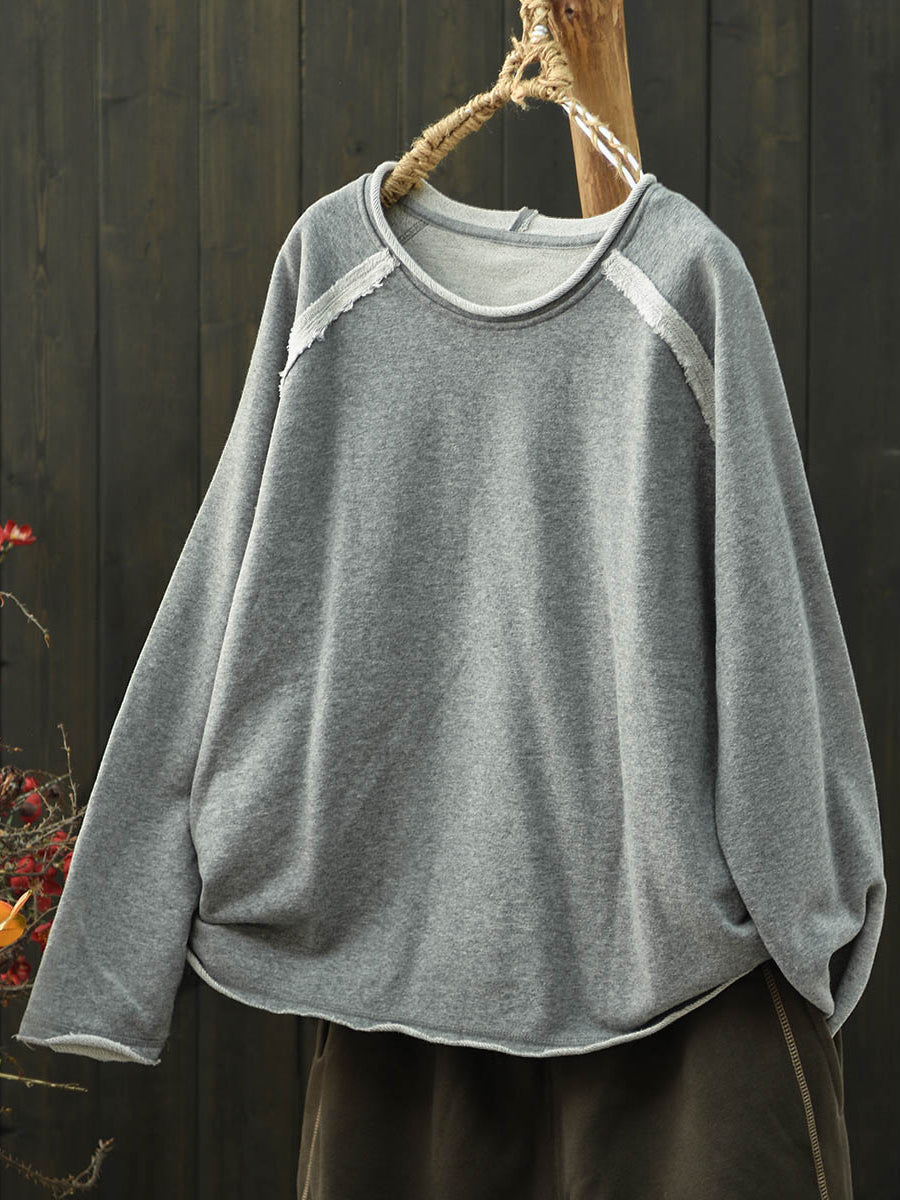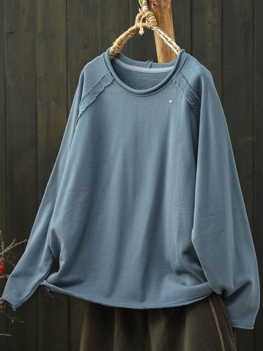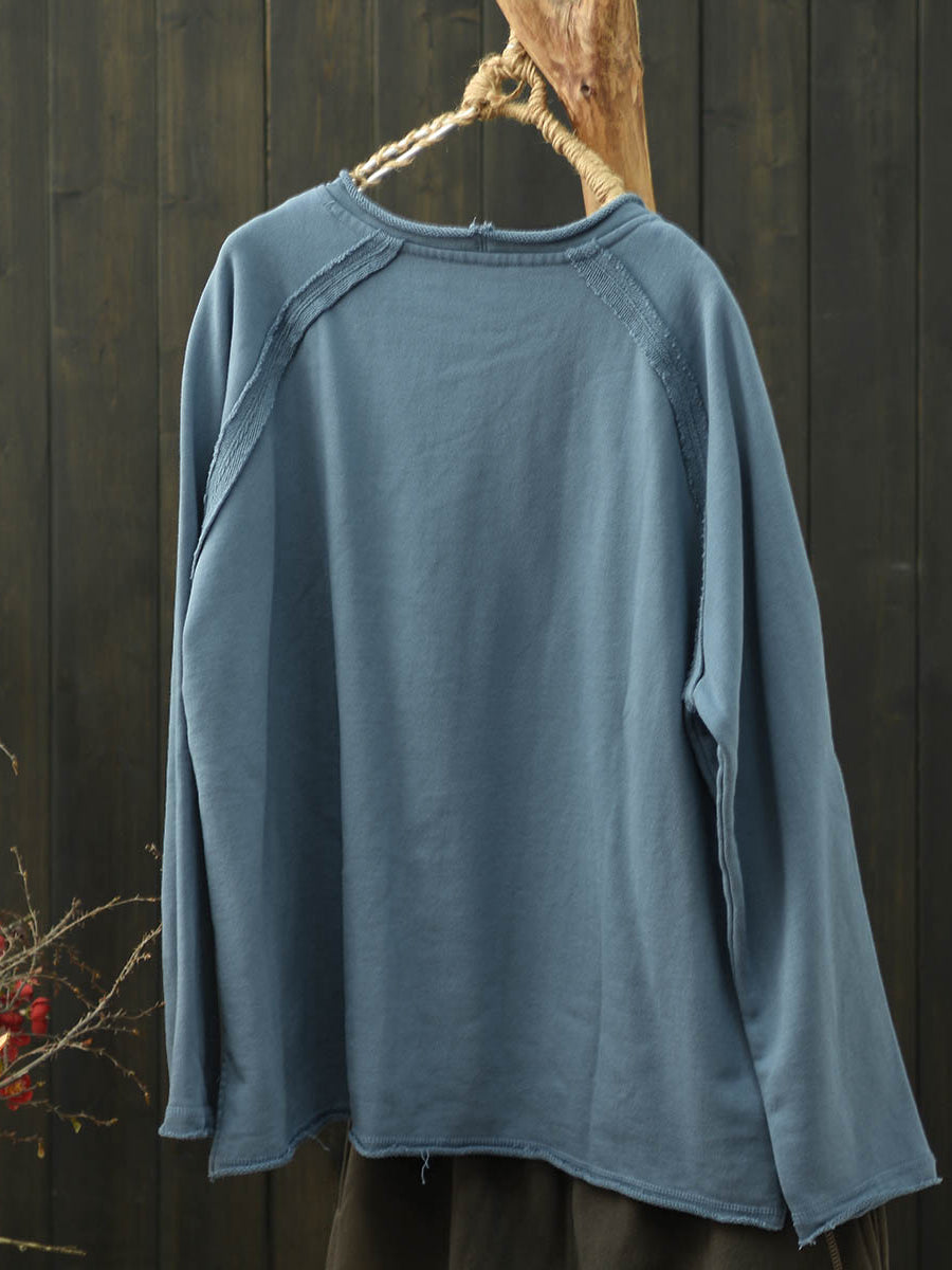 Women Artsy Autumn Pure Color Spliced O-Neck Cotton Blouse
