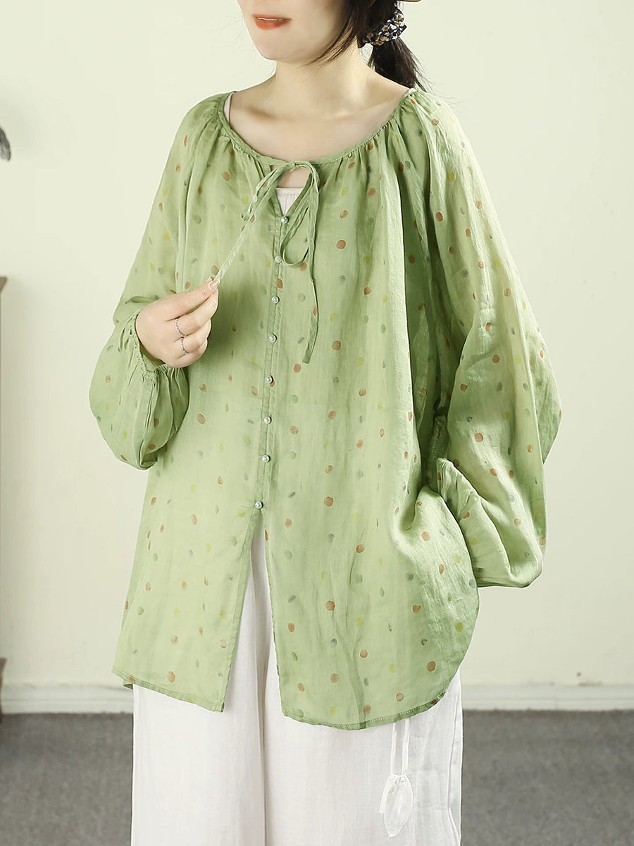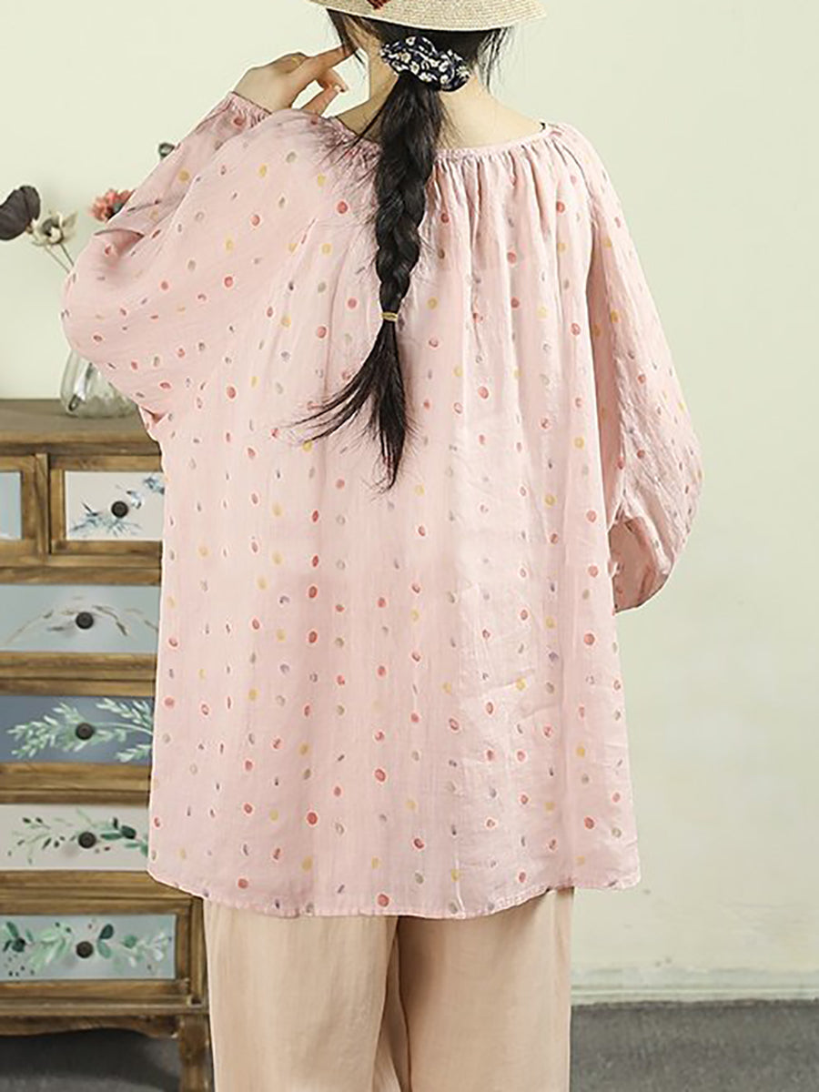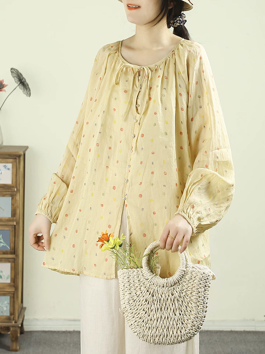 Women Artsy Spring Dot O-Neck 100%Ramie Shirt