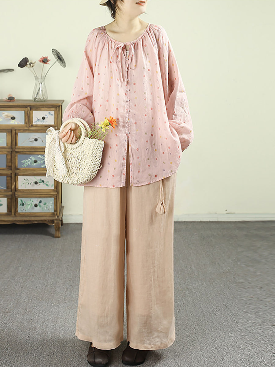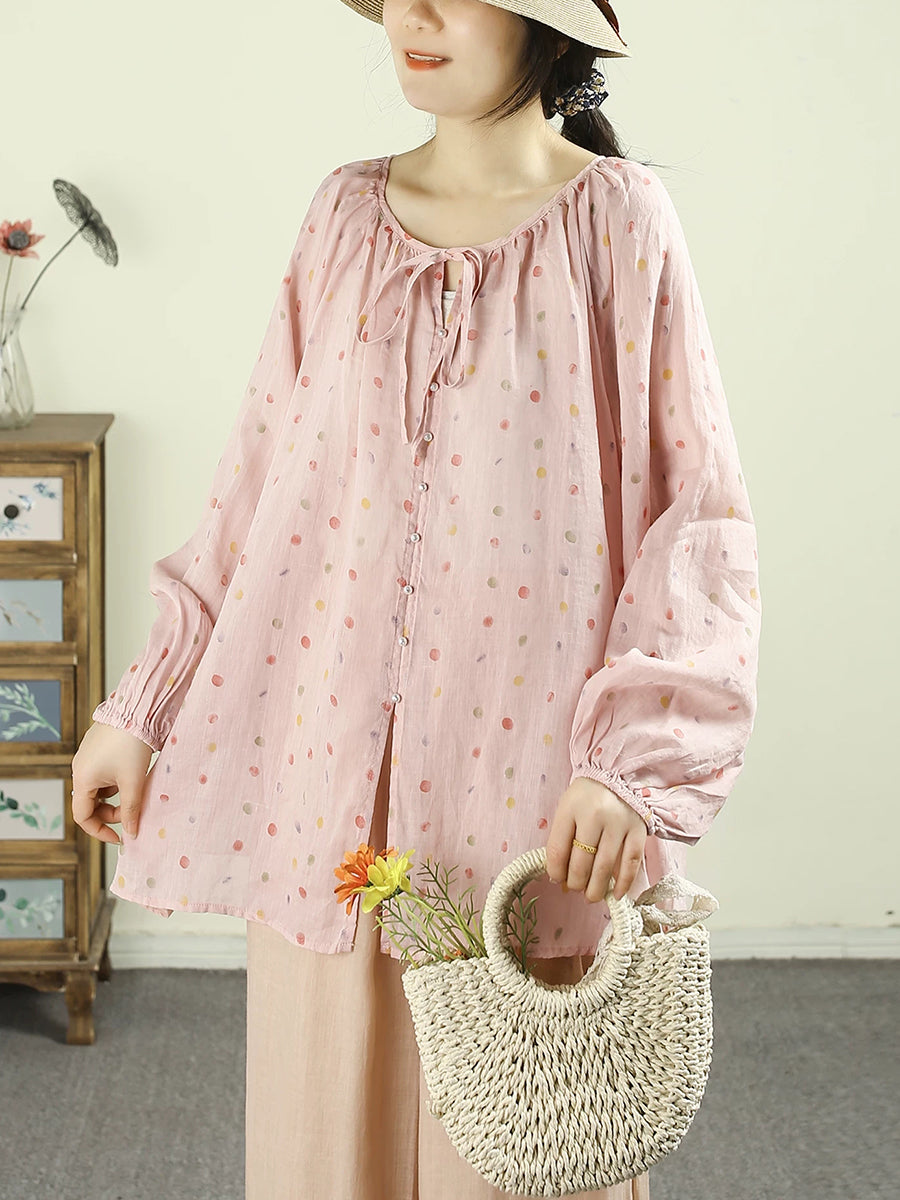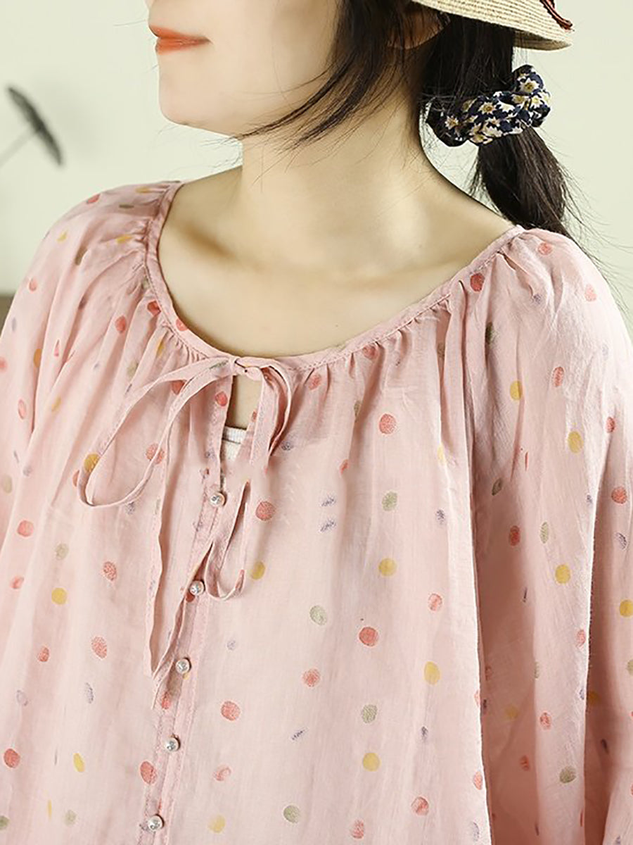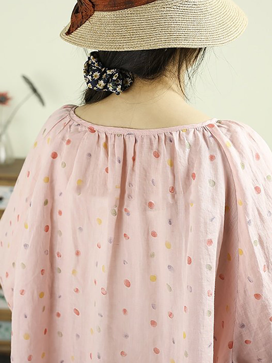Women Artsy Spring Dot O-Neck 100%Ramie Shirt