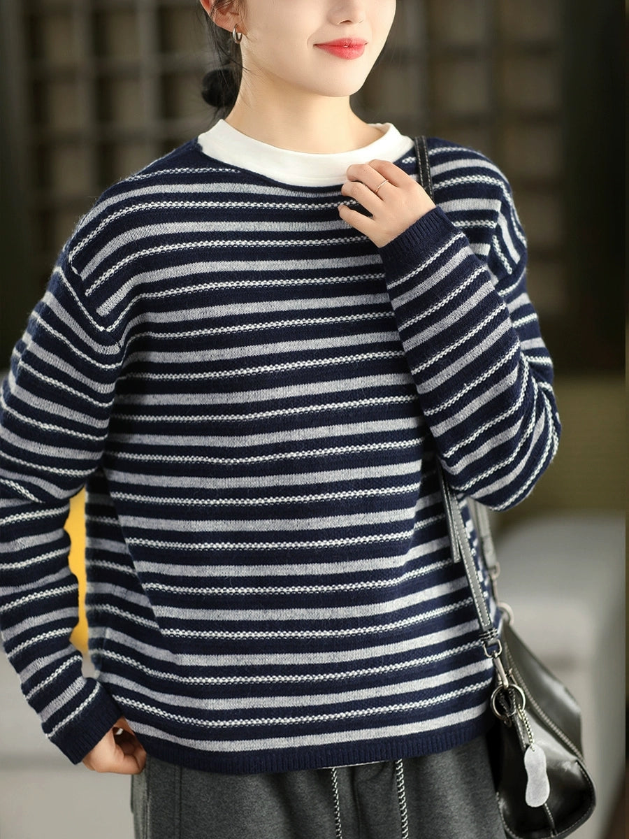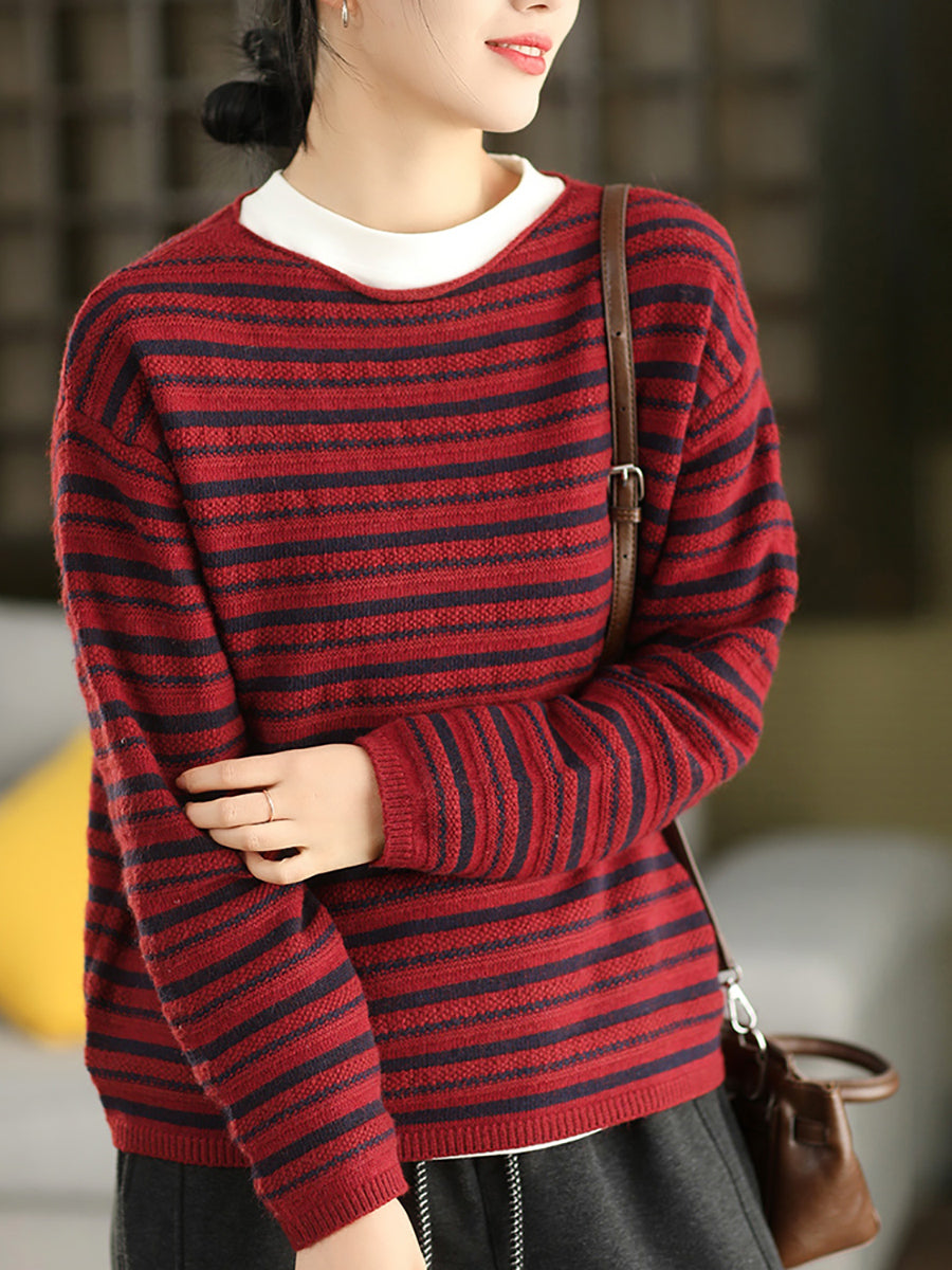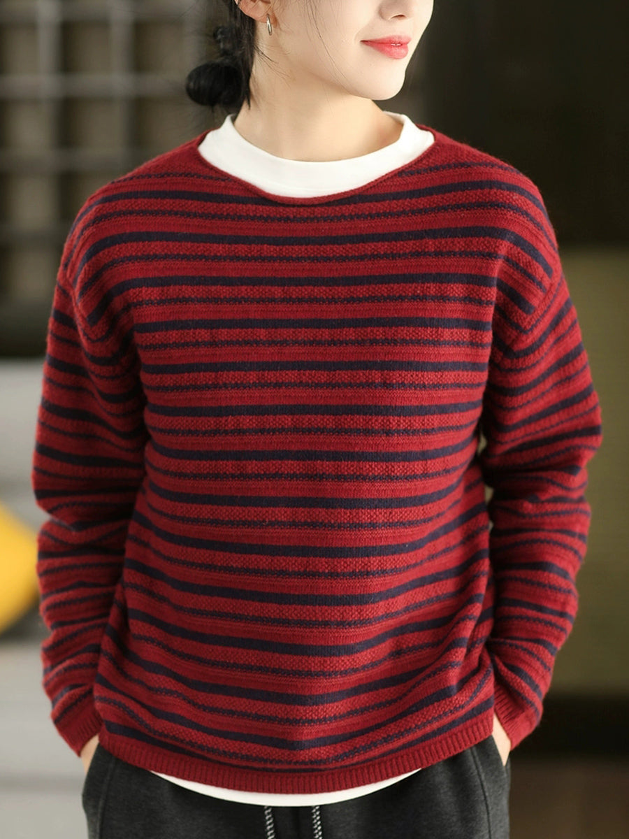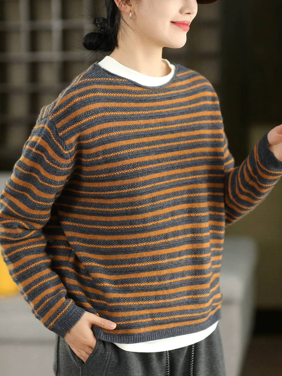 Women Autumn Vintage Stripe Knitted O-Neck Sweater