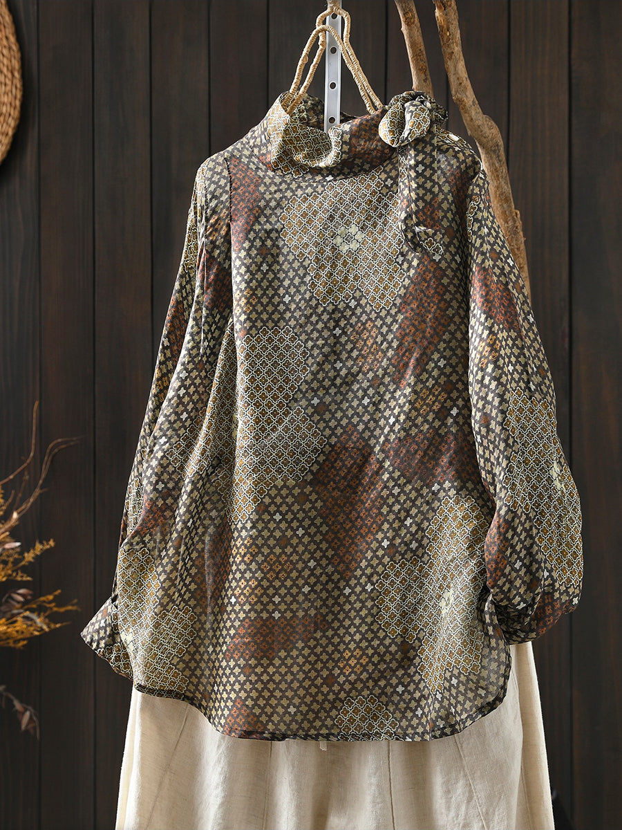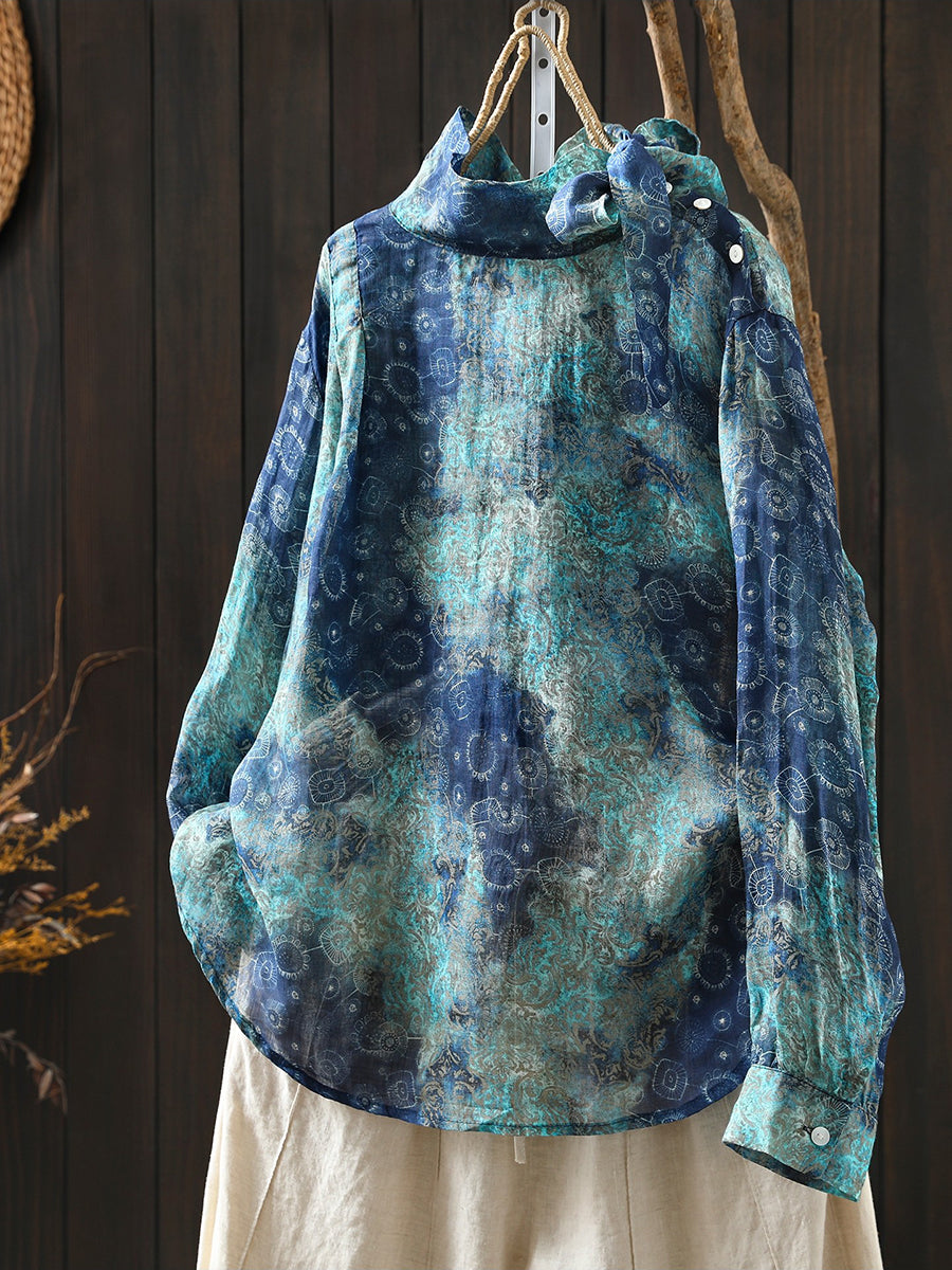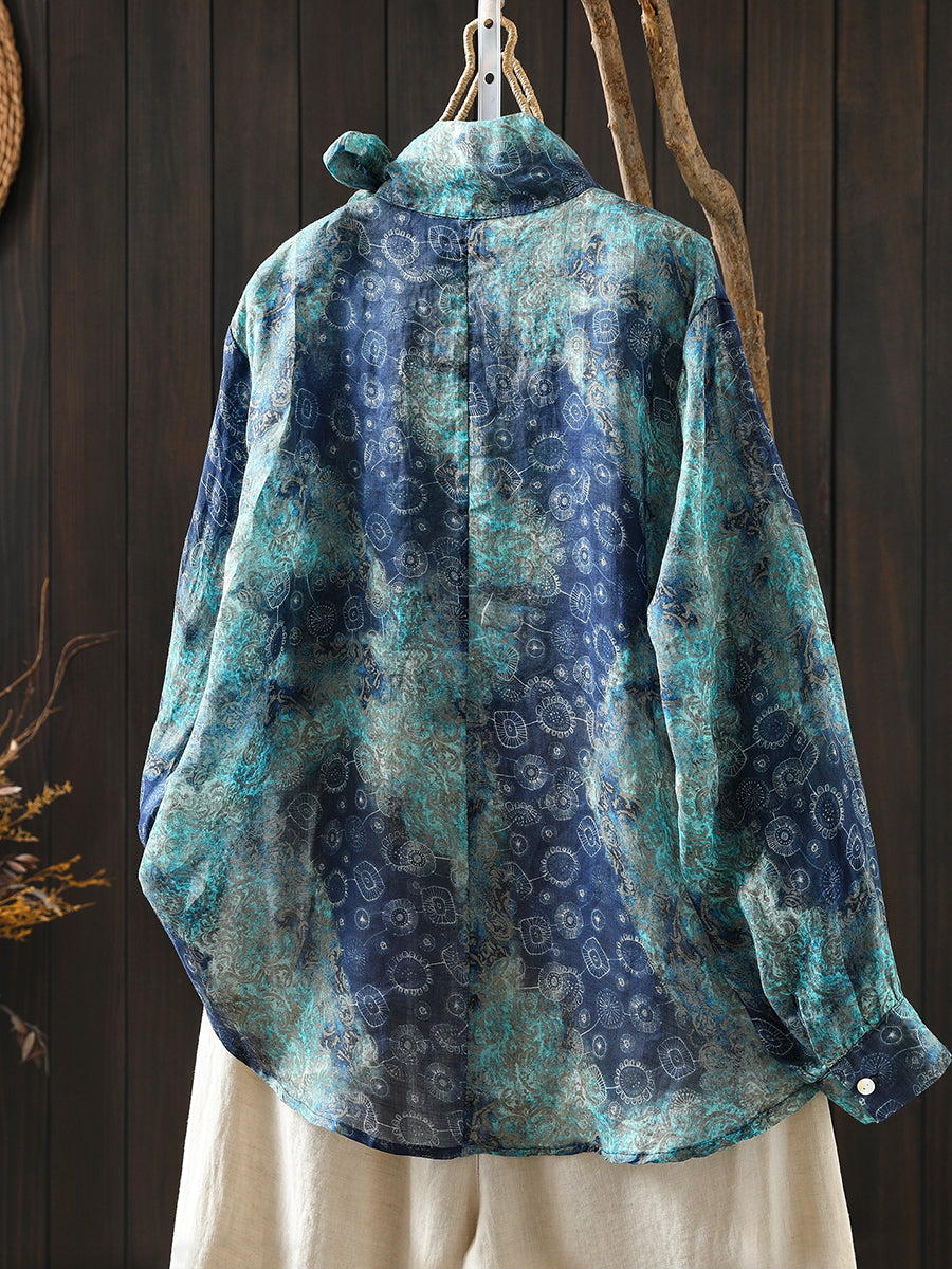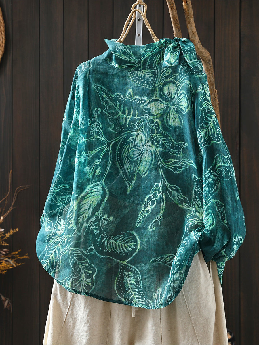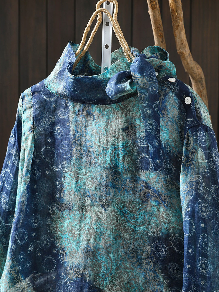 Women Spring Artsy Flower 100%Ramie Stand Collar Blouse
