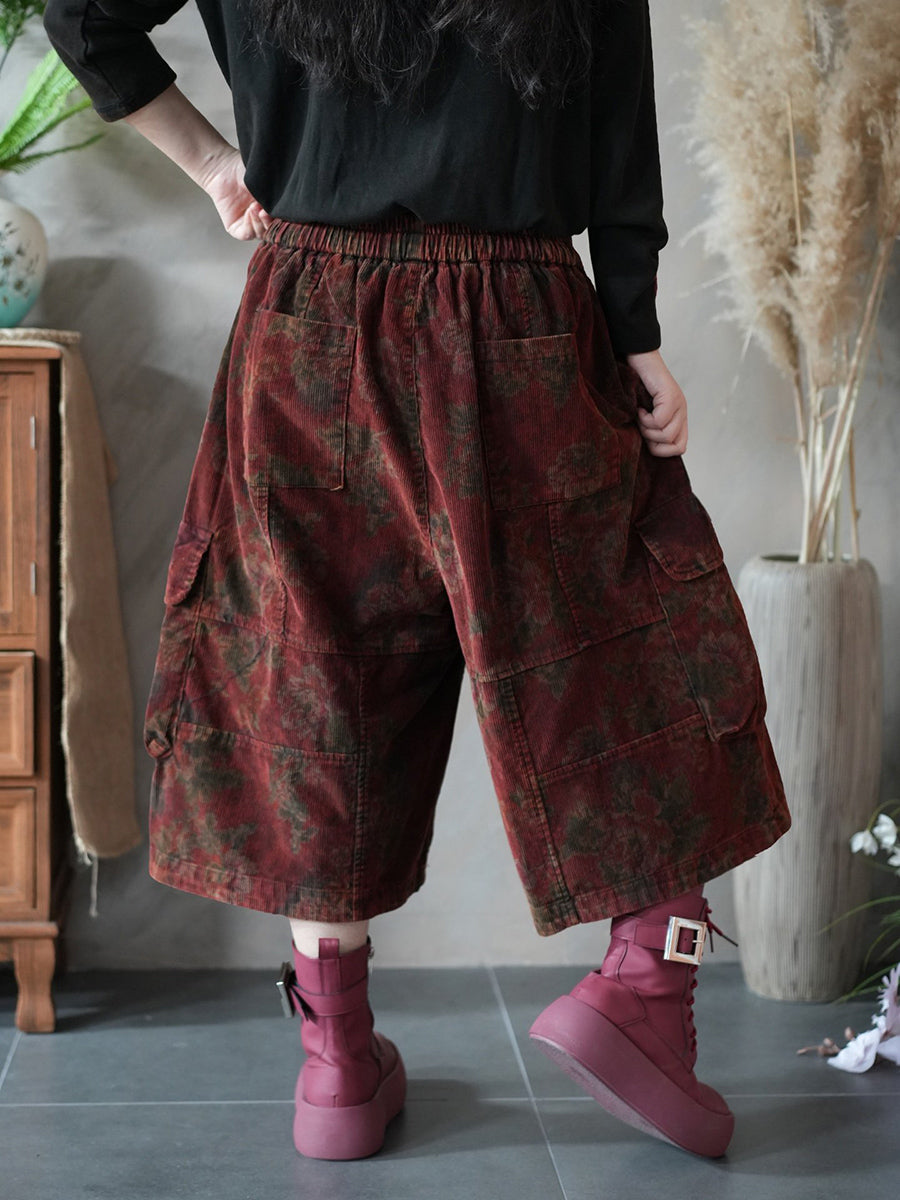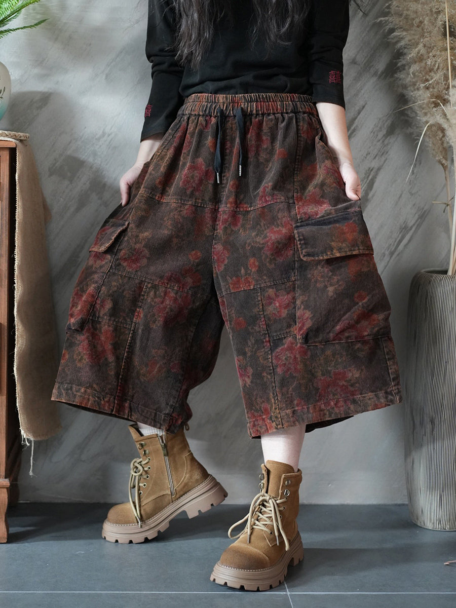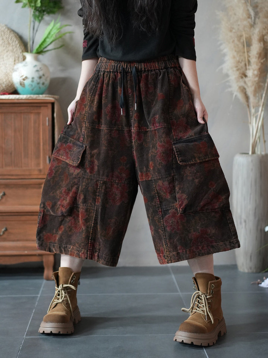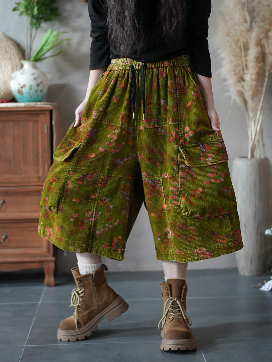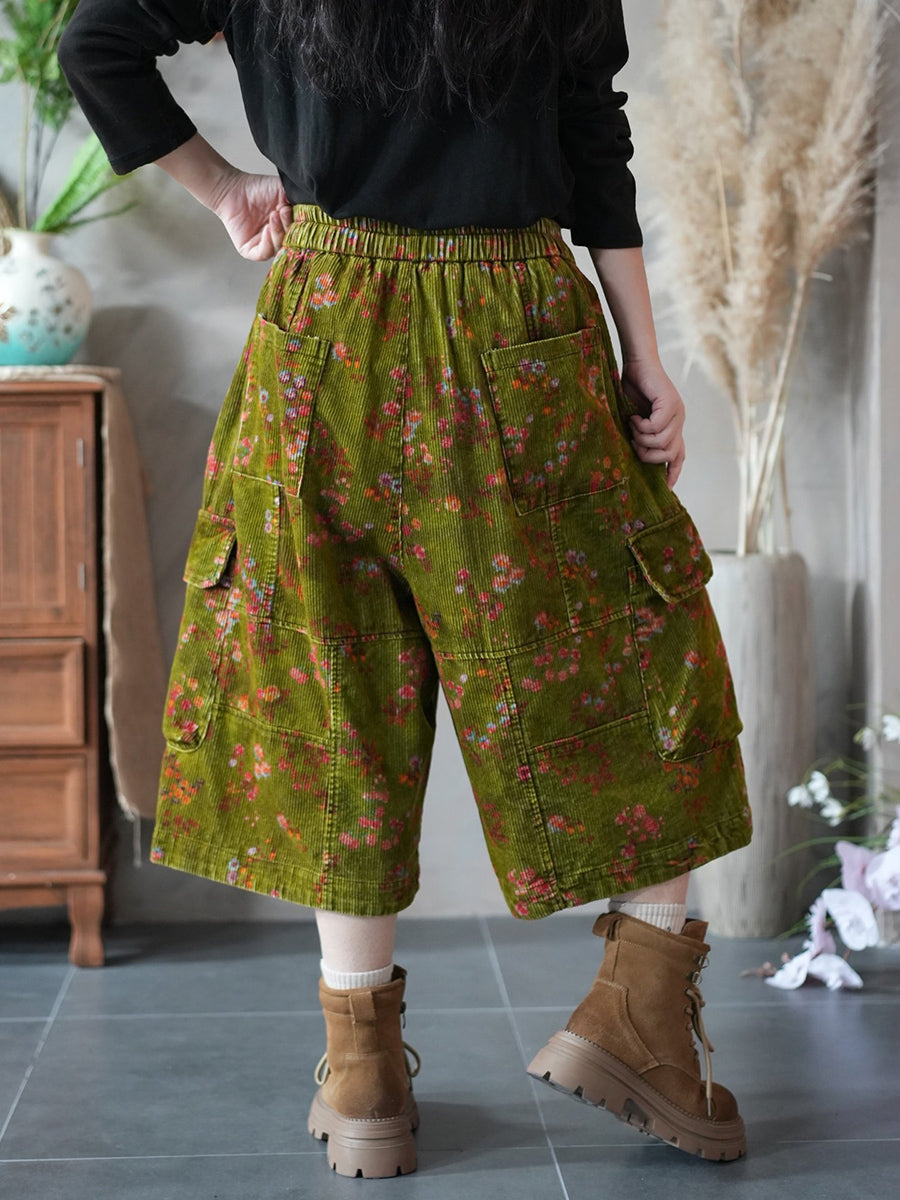 Women Spring Flower Corduroy Wide-leg Cropped Pants