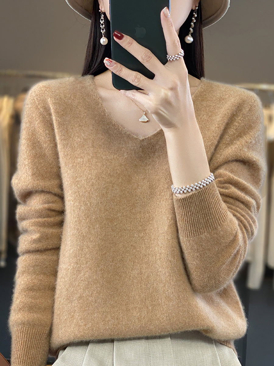 This V-Neck Knit Sweater for Women features a solid pattern, full-length sleeves, and a casual yet stylish design, making it perfect for the autumn and winter seasons.
