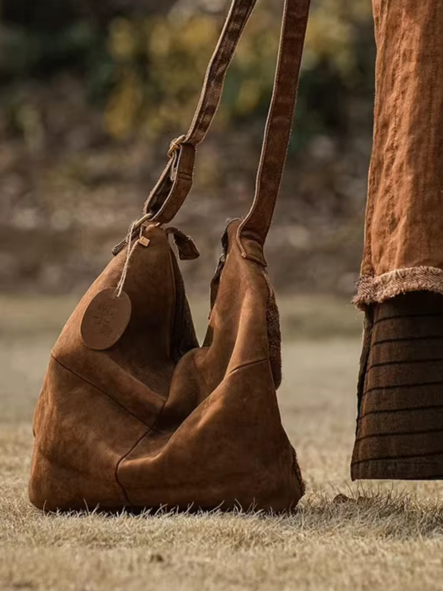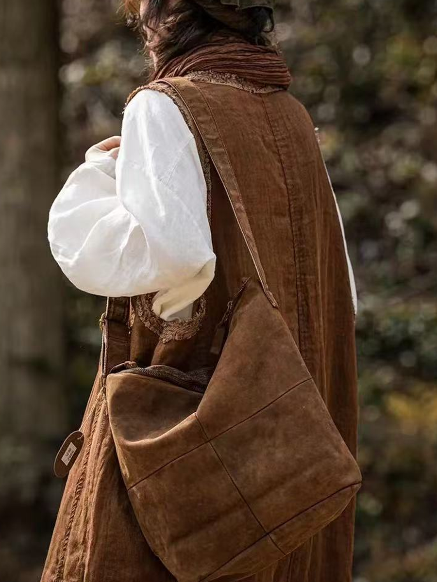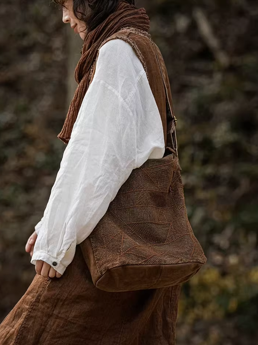 Vintage Leather Spliced Embroidered Shoulder Bag